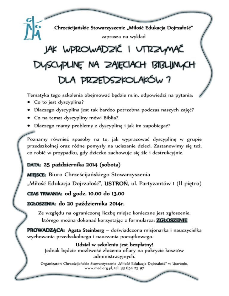 Chrześcijańskie Stowarzyszenie „Miłość Edukacja Dojrzałość” zaprasza na wykład JAK WPROWADZIĆ I UTRZYMAĆ DYSCYPLINĘ NA ZAJĘCIACH BIBLIJNYCH DLA PRZEDSZKOLAKÓW ? Tematyka tego szkolenia obejmować będzie m.in. odpowiedzi na pytania:  Co to jest dyscyplina?  Dlaczego dyscyplina jest tak bardzo potrzebna podczas naszych zajęć?  Co na temat dyscypliny mówi Biblia?  Dlaczego mamy problemy z dyscypliną i jak im zapobiegać? Poznamy również sposoby na to, jak wypracować dyscyplinę w grupie przedszkolnej oraz różne pomysły na uciszanie dzieci. Zastanowimy się też, co robić w przypadku, gdy dziecko zachowuje się źle i destrukcyjnie. DATA: 25 października 2014 (sobota) Biuro Chrześcijańskiego Stowarzyszenia „Miłość Edukacja Dojrzałość”, USTROŃ, ul. Partyzantów 1 (II piętro) MIEJSCE: CZAS TRWANIA: ZGŁOSZENIA: od godz. 10.00 do 13.00 do 20 października 2014r. Ze względu na ograniczoną liczbę miejsc konieczne jest zgłoszenie, którego można dokonać korzystając z formularza: ZGŁOSZENIE PROWADZĄCA: Agata Steinberg – doświadczona misjonarka i nauczycielka wychowania przedszkolnego i nauczania początkowego. Udział w szkoleniu jest bezpłatny! Jednak będzie możliwość złożenia ofiary na pokrycie kosztów administracyjnych. Organizator: Chrześcijańskie Stowarzyszenie „Miłość Edukacja Dojrzałość” w Ustroniu, www.med.org.pl, tel. 33 854 25 97