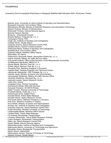 Uczestnicy Uczestnicy Dnia Europejskiej Wspó³pracy w Nawigacji Satelitarnej30 listopada 2004, Warszawa, Polska - Balodis Janis, University of Latvia Institute of Geodesy and Geoinformation - Banaszek Krzysztof, Civil Aviation Office - Bartosiewicz Renata, Ministry of Scientific Research and Information Technology - Batycki Andrzej, Ministry of Infrastructure - Borkowski Tomasz, Internal Security Agency - Brachet Gerard, iNavSat - Budzyna - Dawidowski Konrad - Buszke Bartosz, Polspace Sp. z o. o. - Campagne Pascal, FDC - Cisak Jan, Institute of Geodesy and Cartography - Colaitis Olivier, Alcatel Space - Czapska Joanna, Space Research Centre PAS - Denjean Bruno, Spirent Communications - Dobrzycka Maria, Institue of Geodesy and Cartography - Dusiñski Emil, Civil Aviation Office - Dziewicki Marek, Maritime Office Gdynia - Elliot Mark, EC Harris - Fedorowicz-Jackowski Witold, Geosystem Polska Sp. z o. o. - Fellner Andrzej, Military Air traffic Service Office - G³a¿ewski Andrzej, Office of the Surveyor of the Mazowieckie Voivodship - Go³ebiewska Agnieszka, INECO S. A. - Górski Maciej, Navimor Oxer Sp. z o. o. - Górski Jakub, Navimor Oxer Sp. z o. o. - Grodzicki Piotr, Maritime Academy in Szczecin - Iwañski Rafa³, Railway Scientific and Technical Centre - Jakubczak Aleksander, OSP Polpager Sp. z o. o. - Jakubik Jacek, Ministry of Interior and Administration - Jaruszewski Waldemar, Military Air traffic Service Office - Jaworski Waldemar, Macropol Sp. z o. o. - Jaworski Leszek, Space Research Centre - Julien Eric, Airbus - Jungstand Arne, Dornier Consulting - Kamieniecki Marek, EKO-GIS Services - Karwacki Wojciech, ECORYS Polska - Keller Tomasz, Warsaw University of Technology - K³osiñski Maciej, Andra Sp. z o. o. - Kobierzycka Anna, Galileo Point - Kowalik Marek, Polish State Railways - Kowalik Hanna, Space Research Centre - Koz³owski Zenon, Maritime Academy in Szczecin - Król Artur, Maritime Academy in Gdynia - Kruk Witold, Ministry of Interior and Administration - Kryñski Jan, Institute of Geodesy and Cartography - Krysiñski Zdzis³aw, Space Research Centre PAS - Kurek Krzysztof, Warsaw University of Technology - Ledóchowski Marek, Maritime Office Gdynia - Lipiñski Rafa³, Polish State Railways - Lis Andrzej, Bombardier Transportation - Lisowiec Aleksander, Tele & Radio Research Institute - Lysko Grzegorz, Bombardier Transportation - £atka Jan, Space Research Centre PAS - £azarz Beata, Internal Security Agency - Makowska Aniela, Institue of Geodesy and Cartography - Malinowski Marcin, University of Technology and Agriculture - Mandelka Georg, Bombardier Transportation - Martin Stuart, LogicaCMG - Martusewicz Janusz, Warsaw University of Technology - Masson Arnaud, Alcatel Space http://galileo.kosmos.gov.pl - Punkt Informacyjny Galileo Powered by Mambo Open Source Generated: 7 March, 2017, 10:44 - Mathieu Marie-Laure, FDC - Mergiel Jerzy, Alcatel Polska S.A. - Mêkal Jaros³aw, Main Command of Border Guards - Micha³owski Tomasz, Galileo Point - Mielnik Piotr, Military University of Technology - Nawrocki Jerzy, Space Research Centre PAS - Oszczak Stanis³aw, University of Warmia and Mazury - Oszczak Bart³omiej, University of Warmia and Mazury - Pe³ka Sebastian, WODGiK £ód¼ - Piontek Rados³aw, ECORYS Polska - Prajs Jerzy, EKO-GIS Services - Przedpe³ski Robert, Institute of Economics Polish Academy of Sciences - Rozes³aniec Robert, AutoGuard & Insurance Sp. z o.o. - Rutkowska Mi³os³awa, Space Research Centre PAS - Ryzenko Jakub, Polish Space Office - Rzewuski Micha³, "Polish Airports" State Enterprise - Air Traffic Agency - Salmonowicz Wies³aw, Office of Telecommunications and Post Regulation - Sanz Victoriano, INECO - Sêkowski Marcin, Institute of Geodesy and Cartography - Siemczyk Miros³aw, Polkomtel S.A. - Sobstel Jerzy, Noma 2 Sp. z o. o. - Specht Cezary, Naval University in Gdynia - Stateczny Andrzej, Maritime University Szczecin - Stêpniewska Marzena - Strach Micha³, AGH - University of Science and Technology - Szentpeteri Laszlo, TTTC Kft. - ¦ledziñski Janusz, Warsaw University of Technology - Taillandier Christophe, FDC - Tomaszewski Marcin, EC Harris - Toruñ Andrzej, Railway Scientific and Technical Centre - Tu³ecki Adam, Cracow University of Technoloy - Ueland Gard, Kongsberg Seatex - Ustynowicz Adam, Polish Aeroclub - Van Hees Jan, Septentrio - Wieczyñski Artur, Industrial Research Institute for Automation and Measurements - Witt Michael, Dornier Consulting - Zasuwa Maciej, Warsaw University of Technology - Zieliñski Janusz, Space Research Centre PA - Zunker Hugo, Euro Telematik - ¯arninowski, NNC Metrologia http://galileo.kosmos.gov.pl - Punkt Informacyjny Galileo Powered by Mambo Open Source Generated: 7 March, 2017, 10:44