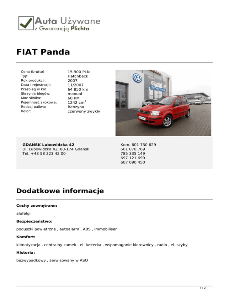 FIAT Panda Cena (brutto) Typ: Rok produkcji: Data I rejestracji: Przebieg w km: Skrzynia biegów: Moc silnika: Pojemność skokowa: Rodzaj paliwa: Kolor: 15 900 PLN Hatchback 2007 11/2007 64 850 km manual 60 KM 1242 cm3 Benzyna czerwony zwykły GDAŃSK Lubowidzka 42 Ul. Lubowidzka 42, 80-174 Gdańsk Tel. +48 58 323 42 00 Kom. 601 730 629 601 078 769 785 335 149 697 121 699 607 090 450 Dodatkowe informacje Cechy zewnętrzne: alufelgi Bezpieczeństwo: poduszki powietrzne , autoalarm , ABS , immobiliser Komfort: klimatyzacja , centralny zamek , el. lusterka , wspomaganie kierownicy , radio , el. szyby Historia: bezwypadkowy , serwisowany w ASO 1/2 Gwarancja Szanowni Państwo, Pragniemy Państwa poinformować, iż firma Plichta – Autoryzowany Dealer Škoda Auto prowadzi skup oraz sprzedaż samochodów używanych wszystkich marek, oferując także samochody używane z gwarancją objęte programem „Auta używane z Gwarancją Plichta”. W ramach programu „Auta Używane z Gwarancją Plichta ” każdy Klient otrzymuje atrakcyjny pakiet zniżek pozwalający zoptymalizować koszty eksploatacji samochodu: -50% na serwis klimatyzacji -50% na ustawienie zbieżności -50% na kosmetykę auta -50% na ścieżkę diagnostyczną -25% na wymiany oleju -25% na zakup opon + 5zł na sezon za hotelowanie opon -15% na części i akcesoria Oferujemy również kompleksową obsługę w zakresie finansowania i ubezpieczenia: - kredyty już od 4,99% - leasingi i kredyty bez zaświadczeń - uproszczone procedury – decyzja już od 30 min. - atrakcyjne pakiety AC/OC/NW/ASS wiodących firm ubezpieczeniowych Możliwość pozostawienia dotychczas użytkowanego auta w rozliczeniu – BEZPŁATNA WYCENA!!! Zapraszamy wszystkich Klientów na jazdę próbną wybranym autem. Numer oferty: D450 Informacja nie stanowi oferty w rozumieniu art. 66 KC. Podane dane mają charakter wyłącznie informacyjny. 2/2 Powered by TCPDF (www.tcpdf.org)