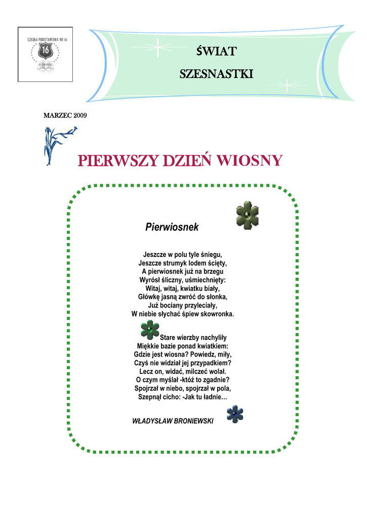 śŚ ŚWIAT SZESNASTKI MARZEC 2009 PIERWSZY DZIEŃ WIOSNY Pierwiosnek Jeszcze w polu tyle śniegu, Jeszcze strumyk lodem ścięty, A pierwiosnek już na brzegu Wyrósł śliczny, uśmiechnięty: Witaj, witaj, kwiatku biały, Główkę jasną zwróć do słonka, Już bociany przyleciały, W niebie słychać śpiew skowronka. Stare wierzby nachyliły Miękkie bazie ponad kwiatkiem: Gdzie jest wiosna? Powiedz, miły, Czyś nie widział jej przypadkiem? Lecz on, widać, milczeć wolał. O czym myślał -któż to zgadnie? Spojrzał w niebo, spojrzał w pola, Szepnął cicho: -Jak tu ładnie… WŁADYSŁAW BRONIEWSKI Władysław Broniewski