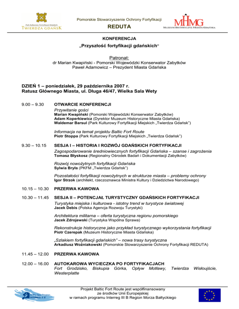 Pomorskie Stowarzyszenie Ochrony Fortyfikacji REDUTA KONFERENCJA „Przyszłość fortyfikacji gdańskich” Patronat: dr Marian Kwapiński - Pomorski Wojewódzki Konserwator Zabytków Paweł Adamowicz – Prezydent Miasta Gdańska DZIEŃ 1 – poniedziałek, 29 października 2007 r. Ratusz Głównego Miasta, ul. Długa 46/47, Wielka Sala Wety 9.00 – 9.30 OTWARCIE KONFERENCJI Przywitanie gości Marian Kwapiński (Pomorski Wojewódzki Konserwator Zabytków) Adam Koperkiewicz (Dyrektor Muzeum Historyczne Miasta Gdańska) Waldemar Barsul (Park Kulturowy Fortyfikacji Miejskich „Twierdza Gdańsk”) Informacja na temat projektu Baltic Fort Route Piotr Stoppa (Park Kulturowy Fortyfikacji Miejskich „Twierdza Gdańsk”) 9.30 – 10.15 SESJA I – HISTORIA I ROZWÓJ GDAŃSKICH FORTYFIKACJI Zagospodarowanie średniowiecznych fortyfikacji Gdańska – szanse i zagroŜenia Tomasz Błyskosz (Regionalny Ośrodek Badań i Dokumentacji Zabytków) Rozwój nowoŜytnych fortyfikacji Gdańska Sylwia Bryła (PKFM „Twierdza Gdańsk”) Pozostałości fortyfikacji nowoŜytnych w strukturze miasta – problemy ochrony Igor Strzok (architekt, rzeczoznawca Ministra Kultury i Dziedzictwa Narodowego) 10.15 – 10.30 PRZERWA KAWOWA 10.30 – 11.45 SESJA II – POTENCJAŁ TURYSTYCZNY GDAŃSKICH FORTYFIKACJI Turystyka miejska i kulturowa - istotny trend w turystyce światowej Jacek Debis (Polska Agencja Rozwoju Turystyki) Architektura militarna – oferta turystyczna regionu pomorskiego Jacek Zdrojewski (Turystyka Wspólna Sprawa) Rekonstrukcje historyczne jako przykład turystycznego wykorzystania fortyfikacji Piotr Czerepak (Muzeum Historyczne Miasta Gdańska) „Szlakiem fortyfikacji gdańskich” – nowa trasy turystyczna Arkadiusz Woźniakowski (Pomorskie Stowarzyszenie Ochrony Fortyfikacji REDUTA) 11.45 – 12.00 PRZERWA KAWOWA 12.00 – 16.00 AUTOKAROWA WYCIECZKA PO FORTYFIKACJACH Fort Grodzisko, Biskupia Górka, Opływ Motławy, Westerplatte Twierdza Projekt Baltic Fort Route jest współfinansowany ze środków Unii Europejskiej w ramach programu Interreg III B Region Morza Bałtyckiego Wisłoujście, Pomorskie Stowarzyszenie Ochrony Fortyfikacji REDUTA DZIEŃ 2 – wtorek, 30 października 2007 r. Ratusz Głównego Miasta, ul. Długa 46/47, Wielka Sala Wety 9.00 – 10.30 SESJA III – ZARZĄDZANIE I UśYTKOWANIE GDAŃSKICH OBIEKTÓW I ZESPOŁÓW FORTYFIKACYJNYCH Reduta koszarowa na Biskupiej Górce uŜytkowana przez Gdańską WyŜszą Szkołę Humanistyczną Jan Baczyński (Dyrektor ds. Inwestycji Gdańska WyŜsza Szkoła Humanistyczna) Szaniec Jezuicki Karolina Kocińska (Specjalista ds. Ochrony Zabytków - Gdański Zarząd Nieruchomości Komunalnych) Park spacerowo-wypoczynkowy nad Opływem Motławy Andrzej Dąbrowski (Kierownik Działu Utrzymania Zieleni - Zarząd Dróg i Zieleni) Działalność Stowarzyszenia Rekonstrukcji Historycznej Wojskowej Składnicy Tranzytowej na Westerplatte Mariusz Wójtowicz-Podhorski (Prezes Stowarzyszenia Rekonstrukcji Historycznej Wojskowej Składnicy Tranzytowej na Westerplatte) Urbanistyczne i architektoniczne problemy adaptacji Szańca Mewiego Igor Strzok (architekt, rzeczoznawca Ministra Kultury i Dziedzictwa Narodowego) Gdańskie fortyfikacje nadbrzeŜne Arkadiusz Woźniakowski (Pomorskie Stowarzyszenie Ochrony Fortyfikacji REDUTA) 10.30 – 10.45 PRZERWA KAWOWA 10.45 – 12.00 SESJA III c.d. – ZARZĄDZANIE I UśYTKOWANIE GDAŃSKICH OBIEKTÓW I ZESPOŁÓW FORTYFIKACYJNYCH Doświadczenie Muzeum Historycznego Miasta Gdańska Adam Koperkiewicz (Dyrektor Muzeum Historycznego Miasta Gdańska) Doświadczenia Parku Kulturowego Fortyfikacji Miejskich „Twierdza Gdańsk” Piotr Stoppa (Park Kulturowy Fortyfikacji Miejskich „Twierdza Gdańsk”) 12.00 – 12:30 PRZERWA KAWOWA 12.30 – 13:45 SESJA IV – DOBRE PRAKTYKI, CZYLI JAK TO SIĘ ROBI GDZIE INDZIEJ Twierdza Daugavgrivas w Rydze Evita Pugačova Twierdza Kowno Ingrida Veliuté (Uniwersytet Witolda Wielkiego w Kownie) Fort Gorgast Andreas Werk (Prezes Stowarzyszenia Fort Gorgast) Wykorzystanie zabytkowych fortyfikacji nowoŜytnych na wybranych przykładach francuskich i angielskich Igor Strzok (architekt, rzeczoznawca Ministra Kultury i Dziedzictwa Narodowego) 13.45 – 14.30 DYSKUSJA I WNIOSKI 14:30 OBIAD Projekt Baltic Fort Route jest współfinansowany ze środków Unii Europejskiej w ramach programu Interreg III B Region Morza Bałtyckiego