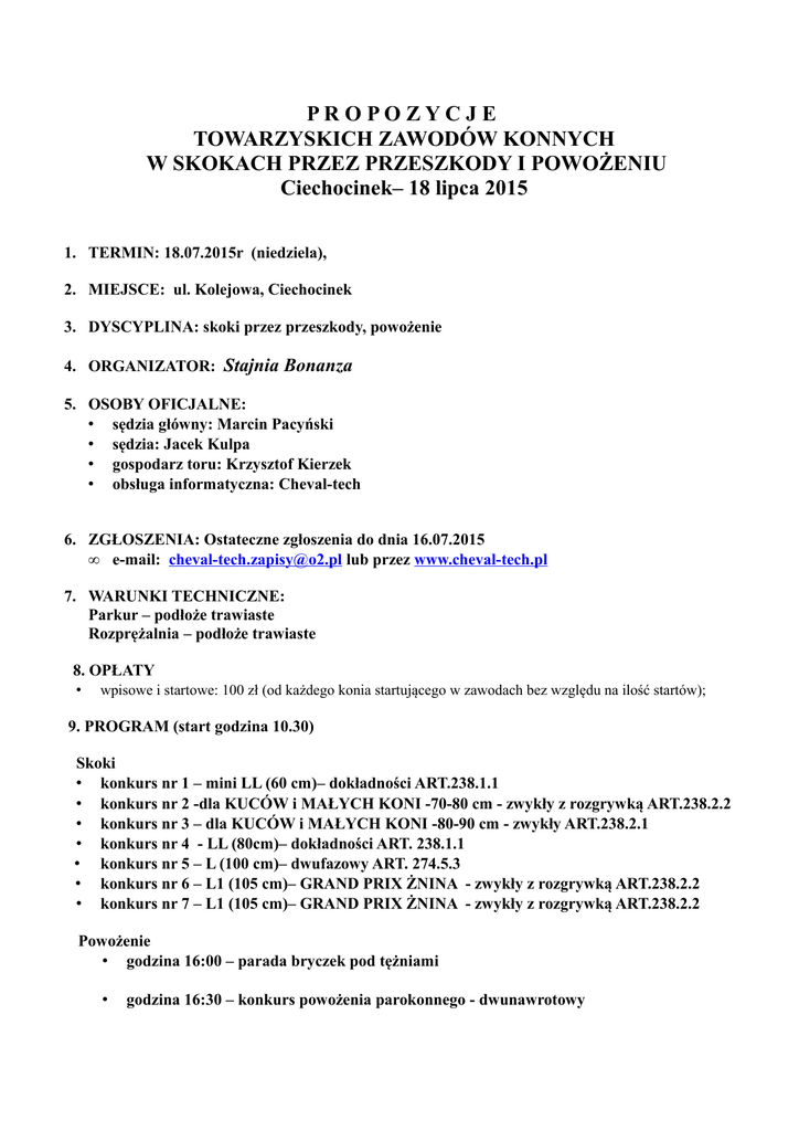 PROPOZYCJE TOWARZYSKICH ZAWODÓW KONNYCH W SKOKACH PRZEZ PRZESZKODY I POWOŻENIU Ciechocinek– 18 lipca 2015 1. TERMIN: 18.07.2015r (niedziela), 2. MIEJSCE: ul. Kolejowa, Ciechocinek 3. DYSCYPLINA: skoki przez przeszkody, powożenie 4. ORGANIZATOR: Stajnia Bonanza 5. OSOBY OFICJALNE: • sędzia główny: Marcin Pacyński • sędzia: Jacek Kulpa • gospodarz toru: Krzysztof Kierzek • obsługa informatyczna: Cheval-tech 6. ZGŁOSZENIA: Ostateczne zgłoszenia do dnia 16.07.2015 • e-mail: [email protected] lub przez www.cheval-tech.pl 7. WARUNKI TECHNICZNE: Parkur – podłoże trawiaste Rozprężalnia – podłoże trawiaste 8. OPŁATY • wpisowe i startowe: 100 zł (od każdego konia startującego w zawodach bez względu na ilość startów); 9. PROGRAM (start godzina 10.30) Skoki • konkurs nr 1 – mini LL (60 cm)– dokładności ART.238.1.1 • konkurs nr 2 -dla KUCÓW i MAŁYCH KONI -70-80 cm - zwykły z rozgrywką ART.238.2.2 • konkurs nr 3 – dla KUCÓW i MAŁYCH KONI -80-90 cm - zwykły ART.238.2.1 • konkurs nr 4 - LL (80cm)– dokładności ART. 238.1.1 • konkurs nr 5 – L (100 cm)– dwufazowy ART. 274.5.3 • konkurs nr 6 – L1 (105 cm)– GRAND PRIX ŻNINA - zwykły z rozgrywką ART.238.2.2 • konkurs nr 7 – L1 (105 cm)– GRAND PRIX ŻNINA - zwykły z rozgrywką ART.238.2.2 Powożenie • godzina 16:00 – parada bryczek pod tężniami • godzina 16:30 – konkurs powożenia parokonnego - dwunawrotowy 10. NAGRODY ▪ honorowe – puchary, floots ▪ konkursy: 1,2,3,4 - nagrody rzeczowe ▪ nagrody finansowe: L L1 powożenie I 400 500 600 II 300 400 500 III 200 300 400 IV 100 200 11. SPRAWY RÓŻNE • Sprawy organizacyjne, możliwość przenocowania koni – Jacek Kupla tel: 664 850 947 • Zastosowanie mają Przepisy Ogólne PZJ oraz Regulamin Dyscypliny Skoków • Prawo trzykrotnego startu w konkursach mają tylko konie 6-letnie i starsze. Wynik drugiego przejazdu w tym samym konkursie nie jest zaliczany do klasyfikacji. • Konie obowiązują aktualne szczepienia przeciwko grypie (wg. Zaleceń FEI/PZJ) • Zawodników obowiązują aktualne badania lekarskie oraz ubezpieczenie NNW • Zawodnicy niepełnoletni muszą posiadać pisemną zgodę rodziców na start w zawodach • Wszelkie informacji dotyczące zawodów (m.in. listy zgłoszonych par, listy startowe, ewentualne zmiany w programie itp.) publikowane będą na www.cheval-tech.pl • Organizatorzy nie ponoszą odpowiedzialności za kradzieże, wypadki i inne szkody mogące wyniknąć w trakcie transportu i uczestnictwa w zawodach. • Zalecane ubezpieczenie koni od następstw nieszczęśliwych wypadków oraz od innych zdarzeń losowych. • Organizatorzy zastrzegają sobie prawo do zmian w programie zawodów Propozycje zatwierdzone przez KPZJ dnia: 29.06.2015r Polski Związek Jeździecki prosi wszystkie osoby zaangażowane w jakikolwiek sposób w sporty konne, o przestrzeganie poniżej przedstawionego kodeksu oraz zasady, Se dobro konia jest najważniejsze. Dobro konia musi być zawsze i wszędzie uwzględniane w sportach konnych i nie może być podporządkowane współzawodnictwu sportowemu ani innym celom np. komercyjnym. KODEKS POSTĘPOWANIA Z KONIEM I. Na wszystkich etapach treningu i przygotowań konia do startu w zawodach, dobro konia musi stać ponad wszelkimi innymi wymaganiami. Dotyczy to stałej opieki, metod treningu, starannego obrządku, kucia i transportu. II. Konie i jeźdźcy muszą być wytrenowani, kompetentni i zdrowi zanim wezmą udział w zawodach. Odnosi się to także do podawania leków i środków medycznych, zabiegów chirurgicznych zagrażających dobru konia lub ciąży klaczy, oraz do przypadków nadużywania pomocy. III. Zawody nie mogą zagrażać dobru konia. Wymaga to zwrócenia szczególnej uwagi na teren zawodów, powierzchnię podłoża, pogodę, warunki stajenne, kondycję koni i ich bezpieczeństwo także podczas podróży powrotnej z zawodów. IV. Należy dołożyć wszelkich starań, aby zapewnić koniom staranną opiekę po zakończeniu zawodów, a także humanitarne traktowanie po zakończeniu kariery sportowej. Dotyczy to właściwej opieki weterynaryjnej obrażeń odniesionych na zawodach, spokojnej starości, ewentualnie eutanazji. V. PZJ zachęca wszystkie osoby działające w sporcie jeździeckim do stałego podnoszenia swojej wiedzy oraz umiejętności dotyczących wszelkich aspektów współpracy z koniem.