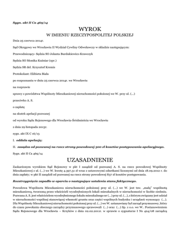 Sygn. akt II Ca 469/14 WYROK W IMIENIU RZECZYPOSPOLITEJ POLSKIEJ Dnia 25 czerwca 2014r. Sąd Okręgowy we Wrocławiu II Wydział Cywilny Odwoławczy w składzie następującym: Przewodniczący- Sędzia SO Jolanta Burdukiewicz-Krawczyk Sędzia SO Monika Kuźniar (spr.) Sędzia SR del. Krzysztof Kremis Protokolant: Elżbieta Biała po rozpoznaniu w dniu 25 czerwca 2014r. we Wrocławiu na rozprawie sprawy z powództwa Wspólnoty Mieszkaniowej nieruchomości położonej we W. przy ul. (...) przeciwko A. S. o zapłatę na skutek apelacji pozwanej od wyroku Sądu Rejonowego dla Wrocławia-Śródmieścia we Wrocławiu z dnia 29 listopada 2013r. sygn. akt IX C 16/13 I. oddala apelację; II. zasądza od pozwanej na rzecz strony powodowej 300 zł kosztów postępowania apelacyjnego. Sygn. akt II Ca 469/14 UZASADNIENIE Zaskarżonym wyrokiem Sąd Rejonowy w pkt I zasądził od pozwanej A. S. na rzecz powodowej Wspólnoty Mieszkaniowej z ul. (...) we W. kwotę 4.397,31 zł wraz z ustawowymi odsetkami liczonymi od dnia 18.09.2012 r. do dnia zapłaty; w pkt II zasądził od pozwanej na rzecz strony powodowej 837 zł kosztów postępowania. Rozstrzygnięcie zapadło w oparciu o następujące ustalenia stanu faktycznego. Powodowa Wspólnota Mieszkaniowa nieruchomości położonej przy ul. (...) we W. jest tzw. „małą” wspólnotą mieszkaniową, tworzoną przez właścicieli wyodrębnionych lokali mieszkalnych w nieruchomości w liczbie siedmiu. Pozwana A. S. jest właścicielem wyodrębnionego lokalu mieszkalnego nr (...) przy ul. (...), z którym związany jest udział w nieruchomości wspólnej stanowiącej własność gruntu oraz części wspólnych budynku i urządzeń wynoszący (...). Dla Wspólnoty Mieszkaniowej nieruchomości położonej przy ul. (...) we W. ustanawiany był zarząd przymusowy, który do czasu powołania obecnego zarządcy przymusowego sprawowali (...) oraz (...) Sp. z o.o. we W.. Postanowieniem Sądu Rejonowego dla Wrocławia – Krzyków z dnia 02.02.2011r. w sprawie o sygnaturze I Ns 424/08 zarządcą przymusowym strony powodowej ustanowiono Spółdzielnię Mieszkaniową (...) we W., jednocześnie odwołując zarządcę przymusowego (...) Sp. z o.o. we W.. W dniu 19.05.2011r. powodowa Wspólnota przyjęła uchwałę w sprawie przyjęcia rocznego planu gospodarczego zarządu nieruchomością wspólną oraz ustalenia opłat na pokrycie kosztów zarządu nieruchomością wspólną w 2011 roku. Zgodnie z tą uchwałą, zaliczka miesięczna na poczet kosztów zarządu nieruchomością wspólną wynosiła 2,53 zł za m2 powierzchni użytkowej lokalu, w tym wynagrodzenie zarządcy – 1,50 zł/m2, eksploatacja – 0,73 zł/m2 i konserwacja – 0,30 zł/m2. Ustalony plan gospodarczy przewidywał opłaty za media: centralne ogrzewanie – 3,50 zł/ m2/m-c, wywóz śmieci – 14,09 zł/osoba, zimna woda i kanalizacja za prognozowane zużycie – 7,61 zł/m2/m-c, zimna woda i kanalizacja za opłatę abonamentową – 1,71 zł/lokal/m-c. Stawki obowiązywały od 01.04.2011 r. Mocą uchwały nr (...) z dnia 15.09.2011r. właściciele nieruchomości wspólnej położonej przy ul. (...) postanowili sfinansować niedobór wykazany w sprawozdaniu poprzedniego zarządcy (...) w wysokości 9.034,68 zł w częściach odpowiadających udziałowi w nieruchomości wspólnej. W identyczny sposób właściciele lokali postanowili pokryć również niedobór powstały w okresie od 01.08.2009r. do 31.03.2011r. w kwocie 63.370,00 zł. Równocześnie postanowiono, iż kwotę wynikającą z ugody podpisanej z MPWiK, obejmującą należność od maja 2007r. do marca 2011r. ujęto w pozycji 7, tab. 2, zał. 3. Zastrzeżono równocześnie, iż w wypadku braku spłaty zadłużenia, sprawa wyegzekwowania poszczególnych należności względem danego właściciela lokalu skierowana zostanie na drogę postępowania sądowego. Uchwała ta została przyjęta większością głosów i nie była przedmiotem zaskarżenia. Postanowieniem z dnia 08.11.2011r. Sąd Rejonowy dla Wrocławia – Krzyków we Wrocławiu, działając na podstawie art. 935 § 3 k.p.c. w związku z art. 615 k.p.c., udzielił zarządcy przymusowemu nieruchomości położonej we W. przy ulicy (...) – Spółdzielni Mieszkaniowej (...) zezwolenia na dokonanie czynności przekraczającej zwykły zarząd, polegającej na rozliczeniu finansowym w/w Wspólnoty Mieszkaniowej w sposób ustalony w uchwale nr (...) podjętej na zebraniu ogółu właścicieli lokali w dniu 15.09.2011r. Zgodnie z załącznikiem do uchwały z 15.09.2011 r., a dotyczącym lokalu pozwanej, stan należności z tytułu opłat wg stanu na dzień 31.03.2011r. wynosił 21.130,85 zł. w tym kwota 6.675,05 zł która dotyczy spraw egzekwowanych przez Komornika w sprawach KM 1053/11, 1949/09, 3872/10. Kwota ta winna była być wpłacona niezwłocznie, z tym że zaliczono na jej poczet należność w kwocie 5.878,00 zł wpłaconą przez pozwaną, co skutkowało koniecznością jej uzupełnienia w kwocie 796,73 zł. Pozostała kwota tj. 14.455,80 zł rozłożona została na raty i pierwsza rata w kwocie 1.644,54 zł winna była być zapłacona do dnia 15.07.2011r. Kolejne raty płatne były do każdego 15 dnia kolejnego miesiąca w następujących kwotach: rata II – 1644,54 zł, raty III-VIII w wysokości 1754,38 zł, raty od IX do XIII w wysokości 160,11 zł. Powyższe należności dotyczą zobowiązań objętych ugodami z MPWiK oraz F., a także pozostałych zobowiązań względem (...), (...) - za okres do czasu objęcia zarządu przez zarządcę przymusowego - SM (...) we W.. Wpłacone przez pozwaną w dniu 18.05.2012 r. kwoty 437,34 zł oraz 37,97 zł na rzecz powodowej Wspólnoty Mieszkaniowej zostały zaliczone przez zarządcę przymusowego na poczet II raty zobowiązania wynikającego z uchwały Wspólnoty Mieszkaniowej z 15.09.2011 r. przypadającej na pozwaną. W powodowej Wspólnocie Mieszkaniowej brak jest podzielników ciepła, nie każdy lokal posiada licznik zużyc