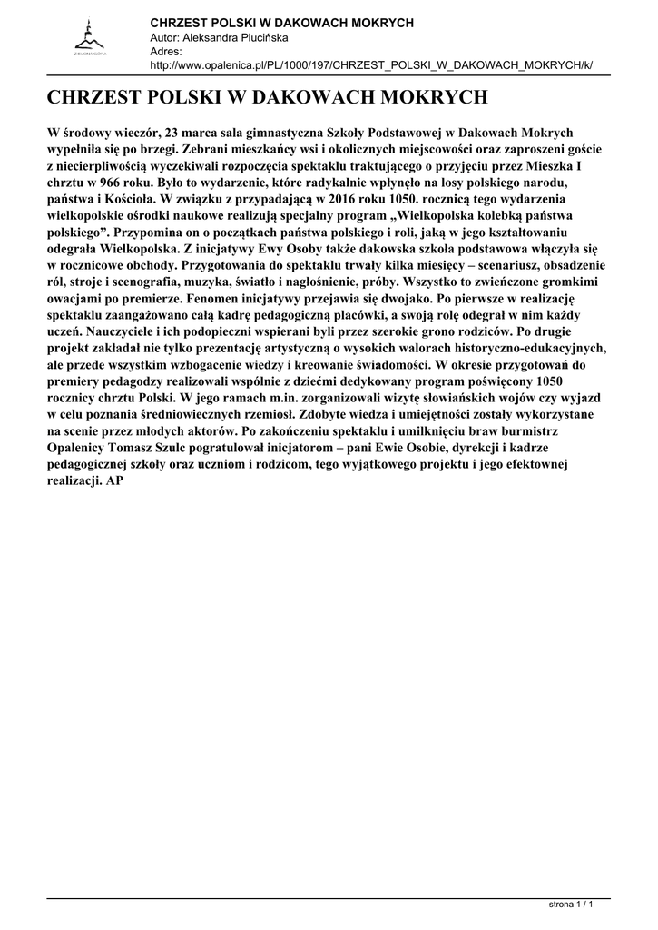 CHRZEST POLSKI W DAKOWACH MOKRYCH Autor: Aleksandra Plucińska Adres: http://www.opalenica.pl/PL/1000/197/CHRZEST_POLSKI_W_DAKOWACH_MOKRYCH/k/ CHRZEST POLSKI W DAKOWACH MOKRYCH W środowy wieczór, 23 marca sala gimnastyczna Szkoły Podstawowej w Dakowach Mokrych wypełniła się po brzegi. Zebrani mieszkańcy wsi i okolicznych miejscowości oraz zaproszeni goście z niecierpliwością wyczekiwali rozpoczęcia spektaklu traktującego o przyjęciu przez Mieszka I chrztu w 966 roku. Było to wydarzenie, które radykalnie wpłynęło na losy polskiego narodu, państwa i Kościoła. W związku z przypadającą w 2016 roku 1050. rocznicą tego wydarzenia wielkopolskie ośrodki naukowe realizują specjalny program „Wielkopolska kolebką państwa polskiego”. Przypomina on o początkach państwa polskiego i roli, jaką w jego kształtowaniu odegrała Wielkopolska. Z inicjatywy Ewy Osoby także dakowska szkoła podstawowa włączyła się w rocznicowe obchody. Przygotowania do spektaklu trwały kilka miesięcy – scenariusz, obsadzenie ról, stroje i scenografia, muzyka, światło i nagłośnienie, próby. Wszystko to zwieńczone gromkimi owacjami po premierze. Fenomen inicjatywy przejawia się dwojako. Po pierwsze w realizację spektaklu zaangażowano całą kadrę pedagogiczną placówki, a swoją rolę odegrał w nim każdy uczeń. Nauczyciele i ich podopieczni wspierani byli przez szerokie grono rodziców. Po drugie projekt zakładał nie tylko prezentację artystyczną o wysokich walorach historyczno-edukacyjnych, ale przede wszystkim wzbogacenie wiedzy i kreowanie świadomości. W okresie przygotowań do premiery pedagodzy realizowali wspólnie z dziećmi dedykowany program poświęcony 1050 rocznicy chrztu Polski. W jego ramach m.in. zorganizowali wizytę słowiańskich wojów czy wyjazd w celu poznania średniowiecznych rzemiosł. Zdobyte wiedza i umiejętności zostały wykorzystane na scenie przez młodych aktorów. Po zakończeniu spektaklu i umilknięciu braw burmistrz Opalenicy Tomasz Szulc pogratulował inicjatorom – pani Ewie Osobie, dyrekcji i kadrze pedagogicznej szkoły oraz uczniom i rodzicom, tego wyjątkowego projektu i jego efektownej realizacji. AP strona 1 / 1 Powered by TCPDF (www.tcpdf.org)