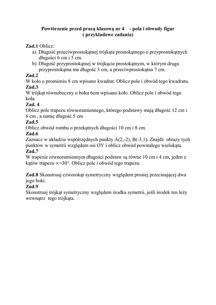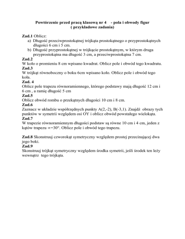 Powtórzenie przed pracą klasową nr 4 - pola i obwody figur ( przykładowe zadania) Zad.1 Oblicz: a) Długość przeciwprostokątnej trójkąta prostokątnego o przyprostokątnych długości 6 cm i 5 cm. b) Długość przyprostokątnej w trójkącie prostokątnym, w którym druga przyprostokątna ma długość 3 cm, a przeciwprostokątna 7 cm. Zad.2 W koło o promieniu 8 cm wpisano kwadrat. Oblicz pole i obwód tego kwadratu. Zad.3 W trójkąt równoboczny o boku 6cm wpisano koło. Oblicz pole i obwód tego koła. Zad. 4 Oblicz pole trapezu równoramiennego, którego podstawy mają długość 12 cm i 6 cm , a ramię długość 5 cm Zad.5 Oblicz obwód rombu o przekątnych długości 10 cm i 8 cm. Zad.6 Zaznacz w układzie współrzędnych punkty A(2,-2), B(-3,1). Znajdź obrazy tych punktów w symetrii względem osi OY i oblicz obwód powstałego wielokąta. Zad.7 W trapezie równoramiennym długości podstaw są równe 10 cm i 4 cm, jeden z kątów trapezu =30. Oblicz pole i obwód tego trapezu. Zad.8 Skonstruuj czworokąt symetryczny względem prostej przecinającej dwa jego boki. Zad.9 Skonstruuj trójkąt symetryczny względem środka symetrii, jeśli środek ten leży wewnątrz tego trójkąta.