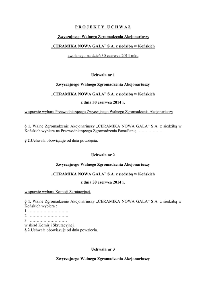 PROJEKTY UCHWAŁ Zwyczajnego Walnego Zgromadzenia Akcjonariuszy „CERAMIKA NOWA GALA” S.A. z siedzibą w Końskich zwołanego na dzień 30 czerwca 2014 roku Uchwała nr 1 Zwyczajnego Walnego Zgromadzenia Akcjonariuszy „CERAMIKA NOWA GALA” S.A. z siedzibą w Końskich z dnia 30 czerwca 2014 r. w sprawie wyboru Przewodniczącego Zwyczajnego Walnego Zgromadzenia Akcjonariuszy § 1. Walne Zgromadzenie Akcjonariuszy „CERAMIKA NOWA GALA” S.A. z siedzibą w Końskich wybiera na Przewodniczącego Zgromadzenia Pana/Panią ……………….. § 2.Uchwała obowiązuje od dnia powzięcia. Uchwała nr 2 Zwyczajnego Walnego Zgromadzenia Akcjonariuszy „CERAMIKA NOWA GALA” S.A. z siedzibą w Końskich z dnia 30 czerwca 2014 r. w sprawie wyboru Komisji Skrutacyjnej. § 1. Walne Zgromadzenie Akcjonariuszy „CERAMIKA NOWA GALA” S.A. z siedzibą w Końskich wybiera : 1 . ………………………. 2. ………………………. 3. ……………………… w skład Komisji Skrutacyjnej. § 2.Uchwała obowiązuje od dnia powzięcia. Uchwała nr 3 Zwyczajnego Walnego Zgromadzenia Akcjonariuszy „CERAMIKA NOWA GALA” S.A. z siedzibą w Końskich z dnia 30 czerwca 2014 r. w sprawie przyjęcia porządku obrad Zwyczajnego Walnego Zgromadzenia Akcjonariuszy § 1. Walne Zgromadzenie Akcjonariuszy „CERAMIKA NOWA GALA” S.A. z siedzibą w Końskich przyjmuje porządek obrad zgodnie z ogłoszeniem na stronie internetowej spółki z dnia 3 czerwca 2014 roku: 1. Otwarcie Zwyczajnego Walnego Zgromadzenia. 2. Wybór Przewodniczącego Zwyczajnego Walnego Zgromadzenia. 3. Stwierdzenie prawidłowości zwołania Zwyczajnego Walnego Zgromadzenia oraz jego zdolności do podejmowania uchwał. 4. Wybór Komisji Skrutacyjnej. 5. Przyjęcie porządku obrad. 6. Rozpatrzenie sprawozdania Zarządu z działalności Spółki w roku obrotowym 2013 oraz sprawozdania finansowego Spółki za rok obrotowy 2013. 7. Rozpatrzenie wniosku Zarządu co do podziału zysku Spółki za rok obrotowy 2013. 8. Rozpatrzenie sprawozdania Rady Nadzorczej z wyników oceny sprawozdania Zarządu z działalności Spółki w roku obrotowym 2013, sprawozdania finansowego Spółki za rok obrotowy 2013 oraz wniosku Zarządu co do podziału zysku Spółki za rok obrotowy 2013. 9. Podjęcie uchwały o zatwierdzeniu sprawozdania Rady Nadzorczej z oceny: sprawozdania Zarządu z działalności Spółki w roku obrotowym 2013, sprawozdania finansowego Spółki za rok obrotowy 2013 oraz wniosku Zarządu w sprawie podziału zysku Spółki za rok obrotowy 2013. 10. Rozpatrzenie sprawozdania Rady Nadzorczej z działalności w roku obrotowym 2013. 11. Podjęcie uchwały o zatwierdzeniu sprawozdania Rady Nadzorczej z działalności w roku obrotowym 2013. 12. Podjęcie uchwał: a/ o zatwierdzeniu sprawozdania Zarządu z działalności Spółki w roku obrotowym 2013, b/ o zatwierdzeniu sprawozdania finansowego Spółki za rok obrotowy 2013, c/ w sprawie podziału zysku Spółki za rok obrotowy 2013, 13. Rozpatrzenie skonsolidowanego sprawozdania finansowego spółki za rok obrotowy 2013 oraz sprawozdania Zarządu z działalności grupy kapitałowej w roku obrotowym 2013. 14. Rozpatrzenie sprawozdania Rady Nadzorczej z wyników oceny skonsolidowanego sprawozdania finansowego spółki za rok obrotowy 2013 oraz sprawozdania Zarządu z działalności grupy kapitałowej w roku obrotowym 2013. 15. Podjęcie uchwały o zatwierdzeniu sprawozdania Rady Nadzorczej z wyników oceny skonsolidowanego sprawozdania finansowego spółki za rok obrotowy 2013 oraz sprawozdania Zarządu z działalności grupy kapitałowej w roku obrotowym 2013. 16. Podjęcie uchwał: a/ o zatwierdzeniu sprawozdania Zarządu z działalności grupy kapitałowej w roku obrotowym 2013, b/ o zatwierdzeniu skonsolidowanego sprawozdania finansowego spółki za rok obrotowy 2013. 17. Podjęcie uchwał : a/ o udzieleniu poszczególnym członkom Zarządu absolutorium z wykonania obowiązków w roku obrotowym 2013, b/ o udzieleniu poszczególnym członkom Rady Nadzorczej absolutorium z wykonania obowiązków w roku obrotowym 2013. 18. Podjęcie uchwały w sprawie umorzenia 9 220 757 akcji własnych w kapitale zakładowym Spółki. 19. Podjęcie uchwały w sprawie obniżenia kapitału zakładowego Spółki. 20. Podjęcie uchwały w sprawie zmiany statutu Spółki. 21. Zamknięcie obrad. § 2. Uchwała obowiązuje od dnia powzięcia. Uchwała nr 4 Zwyczajnego Walnego Zgromadzenia Akcjonariuszy „CERAMIKA NOWA GALA” S.A. z siedzibą w Końskich z dnia 30 czerwca 2014 r. w sprawie zatwierdzenia sprawozdania Rady Nadzorczej z oceny: sprawozdania Zarządu z działalności spółki w roku obrotowym 2013, sprawozdania finansowego Spółki za rok obrotowy 2013 oraz wniosku Zarządu co do podziału zysku za rok obrotowy 2013. § 1. Walne Zgromadzenie Akcjonariuszy „CERAMIKA NOWA GALA” S.A. z siedzibą w Końskich zatwierdza sprawozdanie Rady Nadzorczej z oceny: sprawozdania Zarządu z działalności spółki w roku obrotowym 2013, sprawozdania finansowego Spółki za rok obrotowy 2013 oraz wniosku Zarządu co do podziału zysku za rok obrotowy 2013. § 2. Uchwała obowiązuje od dnia powzięcia . Uchwała nr 5 Zwyczajnego Walnego Zgromadzenia Akcjonariuszy „CERAMIKA NOWA GALA” S.A. z siedzibą w Końskich z dnia 30 czerwca 2014r. w sprawie zatwierdzenia sprawozdania Rady Nadzorczej z działalności za rok obrotowy 2013 r. § 1 Walne Zgromadzenie Akcjonariuszy Spółki „CERAMIKA NOWA GALA” S.A. z siedzibą w Końskich zatwierdza sprawozdanie Rady Nadzorczej z działalności za rok obrotowy 2013. § 2 Uchwała obowiązuje od dnia powzięcia. Uchwała nr 6 Zwyczajnego Walnego Zgromadzenia Akcjonariuszy „CERAMIKA NOWA GALA” S.A. z siedzibą w Końskich z dnia 30 czerwca 2014r. w sprawie zatwierdzenia sprawozdania Zarządu z działalności Spółki w roku obrotowym 2013 r. § 1 Walne Zgromadzenie Akcjonariuszy Spółki „CERAMIKA NOWA GALA” S.A. z siedzibą w Końskich zatwierdza sprawozd