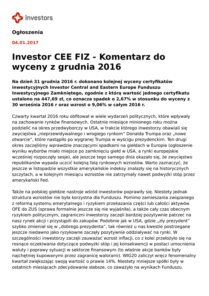 Ogłoszenia 04.01.2017 Investor CEE FIZ - Komentarz do wyceny z grudnia 2016 Na dzień 31 grudnia 2016 r. dokonano kolejnej wyceny certyfikatów inwestycyjnych Investor Central and Eastern Europe Funduszu Inwestycyjnego Zamkniętego, zgodnie z którą wartość jednego certyfikatu ustalono na 447,69 zł, co oznacza spadek o 2,67% w stosunku do wyceny z 30 września 2016 r oraz wzrost o 9,06% w całym 2016 r. Czwarty kwartał 2016 roku obfitował w wiele wydarzeń politycznych, które wpływały na zachowanie rynków finansowych. Ostatnie miesiące minionego roku można podzielić na okres przedwyborczy w USA, w trakcie którego inwestorzy obawiali się zwycięstwa „nieprzewidywalnego i wrogiego rynkom” Donalda Trumpa oraz „nowe otwarcie”, które nastąpiło po wygranej Trumpa w wyścigu prezydenckim. Ten drugi okres zaczęliśmy wprawdzie znaczącymi spadkami na giełdach w Europie (ogłoszenie wyniku wyborów miało miejsce po zamknięciu giełd w USA, a rynki europejskie wcześniej rozpoczęły sesje), ale jeszcze tego samego dnia okazało się, że zwycięstwo republikanów wypada uczcić kolejną falą rynkowych wzrostów. Warto zaznaczyć, że jeszcze w listopadzie wszystkie amerykańskie indeksy znalazły się na historycznych szczytach, a w kolejnym miesiącu wzrostów nie zatrzymały nawet podwyżki stóp przez amerykański Fed. Także na polskiej giełdzie nastroje wśród inwestorów poprawiły się. Niestety jednak struktura wzrostów nie była korzystna dla Funduszu. Pomimo zamieszania związanego z reformą systemu emerytalnego i ryzykiem przekazania części lub całości aktywów OFE do ZUS (sprawa formalnie jeszcze się nie wyjaśniła), a także cały czas obecnym ryzykiem politycznym, zagraniczni inwestorzy zaczęli bardziej pozytywnie patrzeć na nasz rynek akcji i przystąpili do zakupów. Podobnie jak w USA, gdzie „zły prezydent” szybko zmieniał się w „dobrego prezydenta”, tak również u nas kwestie postrzegane jeszcze niedawno jako ryzykowne zaczęły pozytywnie oddziaływać na rynki. W szczególności inwestorzy zaczęli zauważać wzrost inflacji, co z kolei przełożyło się na rosnące oczekiwania dotyczące podwyżki stóp i jej konsekwencji w postaci umocnienia waluty i poprawy sytuacji w sektorze finansowym (to właśnie akcje banków były najchętniej kupowanymi przez zagranicę walorami). WIG20 zaliczył wręcz fenomenalny kwartał zwiększając swoją wartość o prawie 14%. Niestety mniejsze spółki były w ostatnich miesiącach zdecydowanie słabsze, co zaważyło na wynikach Funduszu. mWIG40 zyskał wprawdzie 4,6%, ale najmniejsze spółki, tworzące sWIG80 i mające duży udział w aktywach Funduszu, spadły o 0,9%. Ostatni kwartał 2016 r. zdecydowanie nie był dobry dla rynku tureckiego, gdzie ryzyko polityczne cały czas pozostaje na tyle duże, że odstrasza inwestorów. Wprawdzie w walucie lokalnej turecki indeks ISE100 zakończył ostatnie 3 miesiące wzrostem o 2,2%, ale osłabiająca się lira znowu zniwelowała zyski inwestorów i ostatecznie stopa zwrotu wyrażona w złotych wyniosła -5,1%. Właśnie ze względu na ryzyko polityczne i nieprzewidywalną sytuację w regionie w ostatnich miesiącach minionego roku zdecydowaliśmy się zamknąć pozycje na rynku tureckim. Kraj ten nie wypada z orbity naszych zainteresowań, ale uważamy, że warto poczekać na wyjaśnienie się głównych kwestii politycznych i geopolitycznych. Kluczowe dla analizy tego rynku pozostaje zachowanie lokalnej waluty. Dla Rosji, której fundamenty makroekonomiczne pozostają cały czas mizerne, ale której pomaga drożejąca ropa, ostatni kwartał 2016 roku był bardzo dobry – główne indeksy zanotowały kilkunastoprocentowe wzrosty. Nasza ocena rynku rosyjskiego bazuje na sytuacji fundamentalnej, która nie uzasadnia tegorocznych wzrostów. Dlatego ekspozycja Funduszu na ten rynek pozostaje ograniczona. W ostatnim kwartale stratę przyniosły także nasze bułgarskie inwestycje, ale ponieważ już w poprzednich miesiącach znacznie ograniczaliśmy naszą ekspozycję na ten rynek (obecnie wynosi ona ok 2%) wpływ na wycenę jednostki pozostawał relatywnie niewielki. W naszej opinii pozytywne nastawienie inwestorów do rynków akcji może się jeszcze przez jakiś czas utrzymywać. Biorąc jednak pod uwagę zwiększone ryzyko na zagranicznych rynkach wschodzących, będziemy skupiać się raczej na krajowym rynku akcji, przy czym inaczej niż w ostatnich kwartałach spektrum inwestycyjne planujemy rozszerzyć także o największe spółki, w tym w szczególności w obrębie naszych zainteresowań mogą znaleźć się spółki z sektora bankowego.