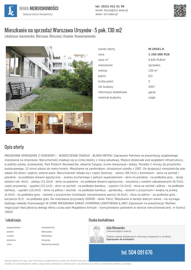 tel. (022) 412 41 50 email: [email protected] www: scn.waw.pl Mieszkanie na sprzedaż Warszawa Ursynów - 5 pok. 130 m2 Lokalizacja: mazowieckie, Warszawa, Warszawa, Ursynów, Nowoursynowska numer oferty M-29541-0 cena 1 250 000 PLN cena m 9 645 PLN/m2 mieszkanie sprzedaż, metraż 130 m2 piętro 0/3 liczba pokoi 5 rok budowy 2007 informacje dodatkowe garaż materiał budynku cegła 2 Opis oferty MIESZKANIE 5POKOJOWE Z OGRODEM ! - NOWOCZESNE OSIEDLE - BLISKO METRA! Zapraszam Państwa na prezentację wyjątkowego mieszkania na Ursynowie. Nieruchomość znajduje się w cichej okolicy z niską zabudową. Miejsce doskonałe pod względem infrastruktury, w pobliżu szkoła, przedszkole, Park Polskich Wynalazców, siłownia Calypso, liczne restauracje i sklepy. Ponadto 2 minuty do przystanku autobusowego, 12 minut pieszo do metra Imielin. Mieszkanie na zamkniętym, strzeżonym osiedlu z 2007. Do dyspozycji mieszkańców plac zabaw dla dzieci i piękne, zielone patio. Nieruchomość składa się z części dziennej: - salonu (38,7m2) z kominkiem - okna na zachód i południe - na podłodze drewno egzotyczne, - aneksu kuchennego z pełnym wyposażeniem - okno na południe - na podłodze gres, - dużej spiżarni (ok. 4m2), - pokoju (11,3m3) - okno na południe - na podłodze drewno egzotyczne, - korytarza z szafami zabudowanymi (8,7m2),. części prywatnej: - sypialni (15,1m2) - okno na zachód - na podłodze bambus, - sypialni (14,2m2) - okna na zachód i północ - na podłodze bambus, - sypialni (10,3m2) - okna na północ i wschód - na podłodze bambus, - garderoby, - łazienki z prysznicem i wnęką na pralkę (4,3m2) - na podłodze gres, - łazienki z prysznicem (możliwość zamontowania wanny) (6,5m2) - okno na północ - na podłodze gres, korytarza (9,3) - na podłodze gres. Do mieszkania przynależy OGRÓD - około 70m2. Mieszkanie w bardzo dobrym stanie - nie wymaga żadnego nakładu finansowego! W CENIE MIESZKANIA GARAŻ I KOMÓRKA LOKATORSKA 6,3M2! Zapraszam na prezentację! Możliwe negocjacje! Nad jakością obsługi oferty czuwa pani Magdalena Armijak - licencjonowany pośrednik w obrocie nieruchomościami, nr licencji 19420 Lokalizacja Osoba kontaktowa Julia Kłosowska województwo mazowieckie powiat Warszawa [email protected] miasto Warszawa dzielnica Ursynów Chętnie udzielę dodatkowych informacji związanych z tą ofertą. Zapraszam do kontaktu! ulica Nowoursynowska tel. 504 091 676 Zawsze dążymy do tego, aby informacje o proponowanych przez nas ofertach były jak najbardziej dokładne. Niekiedy jednak, ze względu na fakt, iż uzyskujemy je od osób trzecich nie jest możliwe ich zweryfikowanie, wobec czego należy traktować je orientacyjnie i nie stanowią one oferty w rozumieniu kodeksu cywilnego.