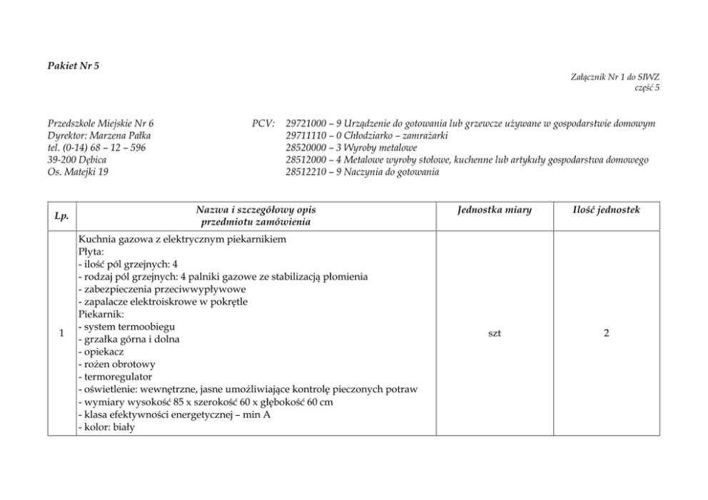 Pakiet Nr 5 Załącznik Nr 1 do SIWZ część 5 Przedszkole Miejskie Nr 6 Dyrektor: Marzena Pałka tel. (0-14) 68 – 12 – 596 39-200 Dębica Os. Matejki 19 Lp. 1 PCV: 29721000 – 9 Urządzenie do gotowania lub grzewcze używane w gospodarstwie domowym 29711110 – 0 Chłodziarko – zamrażarki 28520000 – 3 Wyroby metalowe 28512000 – 4 Metalowe wyroby stołowe, kuchenne lub artykuły gospodarstwa domowego 28512210 – 9 Naczynia do gotowania Nazwa i szczegółowy opis przedmiotu zamówienia Kuchnia gazowa z elektrycznym piekarnikiem Płyta: - ilość pól grzejnych: 4 - rodzaj pól grzejnych: 4 palniki gazowe ze stabilizacją płomienia - zabezpieczenia przeciwwypływowe - zapalacze elektroiskrowe w pokrętle Piekarnik: - system termoobiegu - grzałka górna i dolna - opiekacz - rożen obrotowy - termoregulator - oświetlenie: wewnętrzne, jasne umożliwiające kontrolę pieczonych potraw - wymiary wysokość 85 x szerokość 60 x głębokość 60 cm - klasa efektywności energetycznej – min A - kolor: biały Jednostka miary Ilość jednostek szt 2 Lp. Nazwa i szczegółowy opis przedmiotu zamówienia Jednostka miary Ilość jednostek szt 1 szt 2 Chłodziarko – zamrażarka Wymiary około: wysokość min. 160 x szerokość 55 - 60 x głębokość 50 – 60 cm pojemność chłodziarki min. 150 L pojemność zamrażarki min. 80 L automatyczne rozmrażanie szuflady w komorze zamrażalnika pojemniki na warzywa kolor biały ilość półek: 4 typ półek: szkło klasa energetyczna: min A 2 3 Okap kominowy elektryczny pod kuchenki z pozycji nr 1 - szerokość około 60 cm - sprawność wentylatora wyciągu nie mniejsza niż 700 m3/h - sprawność wentylatora pochłaniacza nie mniejsza niż 700 m3/h - moc oświetlenia min. 40 W Lp. Nazwa i szczegółowy opis przedmiotu zamówienia Jednostka miary Ilość jednostek szt 1 - moc całkowita min. 190 W - napięcie 230 V - praca w trybie wyciąg/pochłaniacz 4 Urządzenie do gotowania ryżu, kaszy itp. - pojemność ok. 10 L - po zakończeniu procesu gotowania urządzenie automatycznie przełącza się na funkcję podtrzymywania temperatury - w zestawie miarka i łyżka do serwowania - wyjmowany pojemnik pokryty teflonem - obudowa ze stali nierdzewnej Wymiary około: Ø 400 x H 300 mm - moc min. 1,5 kW - napięcie 230V preferowane typ np. katalog firmy STALGAST 1/2007 (nr kat. 771100) lub równoważny Nazwa i szczegółowy opis przedmiotu zamówienia Lp. Jednostka miary Ilość jednostek szt 1 szt 1 Stół roboczy z blatem, z rantem tylnym; z jednej strony szafka o długości 40 cm z 2 szufladami, z drugiej strony spód otwarty z półką dolną. Wymiary około: szerokość 70 x wysokość 85 x długość 150 cm 5 preferowane wzornictwo lub równoważny np. katalog internetowy – www.robin.com.pl Stół przeznaczony do eksploatacji w trakcie przygotowywania i obróbki artykułów spożywczych. Blaty robocze wykonane ze stali nierdzewnej o grubości 0,8 – 1,0 mm; wygłuszone płytą wiórową o grubości 18 mm. Stół nierdzewny z szafką. Szafka z półką środkową, 1 – skrzydłowe drzwi otwierane, półka dolna. Wymiary około: szerokość 60 x wysokość 85 x długość 100 6 Nazwa i szczegółowy opis przedmiotu zamówienia Lp. preferowane wzornictwo lub równoważny np. katalog internetowy – Jednostka miary Ilość jednostek szt 2 www.robin.com.pl Stół przeznaczony do eksploatacji w trakcie przygotowywania i obróbki artykułów spożywczych. Blaty robocze wykonane ze stali nierdzewnej o grubości 0,8 – 1,0 mm; wygłuszone płytą wiórową o grubości 18 mm. 7 Garnek polerowany ze stali nierdzewnej Wymiary około: Ø 24; pojemność 9 L preferowane wzornictwo np. katalog STALGAST lub równoważny 8 Garnek satynowany ze stali nierdzewnej – wysoki Wymiary około: Ø 45; pojemność 67 - 70 L preferowane wzornictwo np. katalog STALGAST 1/2007 (nr kat. 011450) lub równoważny szt 1 9 Garnek satynowany ze stali nierdzewnej - niski Wymiary około: Ø 28; pojemność 8 – 9 L preferowane wzornictwo np. katalog STALGAST 1/2007 (nr kat. 013280) lub równoważny szt 1 10 Pokrywa satynowana ze stali nierdzewnej Ø 36 preferowane wzornictwo np. katalog STALGAST 1/2007 (nr kat. 019360) lub równoważny szt 1 11 Patelnia satynowana ze stali nierdzewnej Wymiary około: Ø 20; wysokość 3,5 – 4,5 cm preferowane wzornictwo np. katalog STALGAST 1/2007 lub równoważny szt 1 12 Patelnia do naleśników – aluminiowa z powłoką teflonową Wymiary około: Ø 25; pojemność 0,8 – 1,0 L szt 2 1/2007 (nr kat.011240) Lp. Nazwa i szczegółowy opis przedmiotu zamówienia Jednostka miary Ilość jednostek szt 1 preferowane wzornictwo np. katalog STALGAST 1/2007 (nr kat. 032250) lub równoważny 13 Garnek satynowany ze stali nierdzewnej - wysoki Wymiary około: Ø 32; pojemność 20 - 22 L preferowane wzornictwo np. katalog STALGAST 1/2007 (nr kat. 011320) lub równoważny