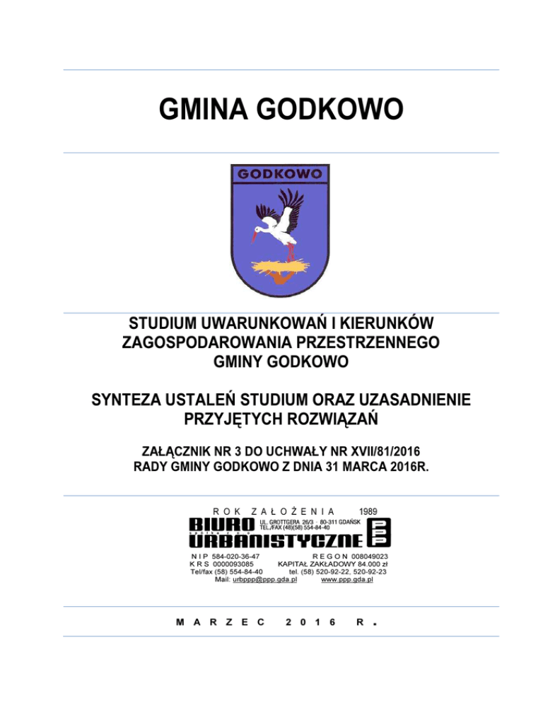 GMINA GODKOWO STUDIUM UWARUNKOWAŃ I KIERUNKÓW ZAGOSPODAROWANIA PRZESTRZENNEGO GMINY GODKOWO SYNTEZA USTALEŃ STUDIUM ORAZ UZASADNIENIE PRZYJĘTYCH ROZWIĄZAŃ ZAŁĄCZNIK NR 3 DO UCHWAŁY NR XVII/81/2016 RADY GMINY GODKOWO Z DNIA 31 MARCA 2016R. R O K Z A Ł O Ż E N I A 1989 N I P 584-020-36-47 R E G O N 008049023 K R S 0000093085 KAPITAŁ ZAKŁADOWY 84.000 zł Tel/fax (58) 554-84-40 tel. (58) 520-92-22, 520-92-23 Mail: [email protected] www.ppp.gda.pl M A R Z E C 2 0 1 6 R . SYNTEZA USTAELŃ STUDIUM UWARUNKOWAŃ I KIERUNKÓW ZAGOSPODAROWANIA PRZESTRZENNEGO GMINY GODKOWO, UZASADNIENIE PRZYJĘTYCH ROZWIĄZAŃ STUDIUM UWARUNKOWAŃ I KIERUNKÓW ZAGOSPODAROWANIA PRZESTRZENNEGO GMINY GODKOWO Opracowanie Studium uwarunkowań i kierunków zagospodarowania przestrzennego, zwane w dalszej części dokumentu Studium, jest wypełnieniem ustawowego obowiązku określenia polityki przestrzennej, w tym zasad zagospodarowania przestrzennego terenu gminy. Opracowanie studium jest zadaniem własnym gminy, realizowanym przez Wójta na mocy ustawy o samorządzie gminnym. Formalny zakres i tryb pracy nad Studium określa ustawa z dnia 27 marca 2003r. o planowaniu i zagospodarowaniu przestrzennym (tekst jednolity Dz. U. z 2015 r. poz. 199 z późn. zmianami). Studium jest aktualizacją dokumentu „Studium uwarunkowań i kierunków zagospodarowania przestrzennego gminy Godkowo, przyjętego uchwałą nr XIV/73/2000 Rady Gminy Godkowo z dnia 15 czerwca 2000r. Projekt Studium został opracowany w wykonaniu Uchwały nr VI/26/2015 z dnia 30 kwietnia 2015 roku w sprawie przystąpienia do sporządzenia Studium uwarunkowań i kierunków zagospodarowania przestrzennego Gminy Godkowo. ZAWARTOŚC STUDIUM Dokument Studium składa się z następujących części, stanowiących załączniki do uchwały Rady Gminy Godkowo w sprawie uchwalenia Studium: 1) Załącznik nr 1 - Studium uwarunkowań i kierunków zagospodarowania przestrzennego gminy Godkowo, składające się z części tekstowej i graficznej: a) Załącznik nr 1A - Studium uwarunkowań i kierunków zagospodarowania przestrzennego gminy Godkowo – tekst studium, b) Załącznik nr 1B – Studium uwarunkowań i kierunków zagospodarowania przestrzennego gminy Godkowo – rysunek Studium w skali 1:10000; 2) Załącznik nr 2 - Rozstrzygnięcie o sposobie rozpatrzenia uwag; 3) Załącznik nr 3 – Synteza ustaleń Studium, uzasadnienie przyjętych rozwiązań. ZESPÓŁ AUTORSKI Projekt studium wykonany został w latach 2015 - 2016 we współpracy z Wójtem Gminy Godkowo oraz Urzędem Gminy Godkowo przez zespół autorski Biura Urbanistycznego PPP sp. z o.o. w Gdańsku pod kierunkiem mgr inż. arch. Aleksandry Piskorskiej (uprawnienia do projektowaniu w planowaniu przestrzennym nr 1046/89) SPIS TREŚCI 1. Struktura funkcjonalno przestrzenna gminy Godkowo ....................................................................................................3 2. Kierunki zmian w przeznaczeniu terenów........................................................................................................................ 5 3. Zasady lokalizacji urządzeń wytwarzających energię z odnawialnych źródeł energii...................................................... 6 4. Kierunki i zasady kształtowania rolniczej przestrzeni produkcyjnej, ................................................................................ 7 5. Kierunki i zasady kształtowania leśnej przestrzeni produkcyjnej, ....................................................................................8 6. Powierzchniowa eksploatacja kopalin ............................................................................................................................. 9 7. Kierunki ochrony przyrody i krajobrazu............................................................................................................................ 9 7.1. Formy ochrony przyrody i krajobrazu ....................................................................................................................... 9 7.2. System osnowy ekologicznej gminy ....................................................................................................................... 10 8. Kierunki ochrony dziedzictwa kulturowego i zabytków oraz dóbr kultury współczesnej ................................................ 10 8.1. Obiekty i obszary wpisane do rejestru zabytków województwa warmińsko mazurskiego ...................................... 10 8.2. Zasady ochrony krajobrazu kulturowego gminy ..................................................................................................... 11 8.3. Zabytki archeologiczne podlegające ochronie .......................................................................................................12 8.4. Historycznie ukształtowane formy zabudowy .........................................................................................................12 8.5. Kierunki działań związanych z ewidencjonowaniem zabytków i opieką nad zabytkami ......................................... 12 9. Układ komunikacyjny gminy i kierunki jego rozwoju ...................................................................................................... 12 10. Systemy infrastruktury technicznej i kierunki ich rozwoju ............................................................................................ 13 10.1. Zaopatrzenie w wodę ........................................................................................................................................... 13 10.2. Odprowadzanie ścieków komunalnych ................................................................................................................14 10.3. Zaopatrzenie w energię elektryczną..................................................................................................................... 15 11. Uzasadnienie przyjętych rozwiązań.................................................................