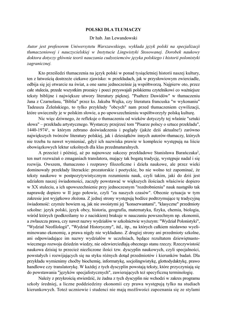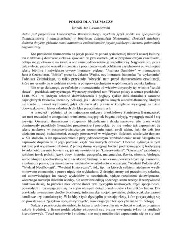 POLSKI DLA TŁUMACZY Dr hab. Jan Lewandowski Autor jest profesorem Uniwersytetu Warszawskiego, wykłada język polski na specjalizacji tłumaczeniowej i nauczycielskiej w Instytucie Lingwistyki Stosowanej. Dorobek naukowy doktora dotyczy głównie teorii nauczania cudzoziemców języka polskiego i historii polonistyki zagranicznej. Kto prześledzi tłumaczenia na język polski w ponad tysiącletniej historii naszej kultury, ten z łatwością dostrzeże ciekawe zjawisko: w przekładach, jak w przysłowiowym zwierciadle, odbija się jej otwarcie na świat, a one same jednocześnie ją współtworzą. Najpierw oto, przez całe stulecia, przede wszystkim prozaicy i poeci przyswajali polskiemu czytelnikowi co ważniejsze teksty biblijne i największe utwory literatury pięknej. "Psałterz Dawidów" w tłumaczeniu Jana z Czarnolasu, "Biblia" przez ks. Jakuba Wujka, czy literatura francuska "w wykonaniu" Tadeusza Żeleńskiego, to tylko przykłady "obcych" nam przed tłumaczeniem cywilizacji, które uwieczniły je w polskim słowie, a po upowszechnieniu współtworzyły polską kulturę. Nic więc dziwnego, że refleksje o tłumaczeniu od wieków dotyczyły tej właśnie "sztuki słowa" – przekładu artystycznego. Wystarczy przejrzeć tom "Pisarze polscy o sztuce przekładu", 1440-19741, w którym zebrano doświadczenia i poglądy (jakże dziś aktualne!) zarówno największych twórców literatury polskiej, jak i dziesiątków innych autorów-tłumaczy, których nie trzeba tu nawet wymieniać, gdyż ich nazwiska prawie w komplecie występują na liście obowiązkowych lektur szkolnych dla klas przedmaturalnych. A przecież i później, aż po najnowsze sukcesy przekładowe Stanisława Barańczaka2, ten nurt rozważań o zmaganiach translatora, mający tak bogatą tradycję, występuje nadal i się rozwija. Owszem, tłumaczono i rozprawy filozoficzne i dzieła naukowe, ale przez wieki dominowały przekłady literackie: prozatorskie i poetyckie, bo nie wolno też zapominać, że teksty naukowe w postpozytywistycznym rozumieniu nauk, czyli takim, jaki do dziś jest udziałem naszej świadomości, zaczęły powstawać w większych ilościach właściwie dopiero w XX stuleciu, a ich upowszechnienie przy jednoczesnym "rozdrobnieniu" nauk nastąpiło tak naprawdę dopiero w II jego połowie, czyli "za naszych czasów". Obecnie sytuacja w tym zakresie jest wyjątkowo złożona. Z jednej strony występują bodźce podtrzymujące tę tradycyjną świadomość: czymże bowiem są, jak nie swoistymi jej "konserwantami", "klasyczne" przedmioty szkolne: język polski, język obcy, historia, geografia, matematyka, fizyka, chemia, biologia, wśród których (podkreślamy to z naciskiem) brakuje w nauczaniu powszechnym np. ekonomii, a zwłaszcza prawa, czy nawet nazwy wydziałów w szkolnictwie wyższym: "Wydział Polonistyki", "Wydział Neofilologii", "Wydział Historyczny", itd., itp., na których całkiem niedawno wyeliminowano ekonomię, a prawa nigdy nie wykładano. Z drugiej strony ani przedmioty szkolne, ani odpowiadające im nazwy wydziałów w uczelniach, będące rezultatem dziewiętnastowiecznego rozwoju dziedzin wiedzy, nie odzwierciedlają obecnego stanu rzeczy. Rzeczywistość naukowa dzisiaj to przecież niezliczone ilości tzw. dyscyplin naukowych, czyli specjalności, powstałych i rozwijających się na styku różnych dotąd przedmiotów i kierunków badań. Dla przykładu wymienimy choćby biochemię, informatykę, socjolingwistykę, glottodydaktykę, prawo handlowe czy translatorykę. W każdej z tych dyscyplin powstają teksty, które przyczyniają się do powstawania "języków specjalistycznych", zawierających też specyficzną terminologię. Należy z przykrością stwierdzić, że żadna z tych dyscyplin nie wchodzi w zakres programu szkoły średniej, a liczne poddziedziny ekonomii czy prawa występują tylko na studiach kierunkowych. Toteż uczniowie i studenci nie mają możliwości zapoznania się ze stylami i terminologią tekstów specjalistycznych. Co więcej, w programie języka polskiego dla szkół średnich nie ma miejsca i czasu na naukę o języku ojczystym nawet w szkołach o profilu humanistycznym. Jest tajemnicą smutnego poliszynela, iż nauka polskiej gramatyki kończy się wraz z odejściem z podstawówki. Doszło już do tego, że uczniowie szkół poznają polską gramatykę wyłącznie na lekcjach języka obcego. Lekcje polskiego wypełnione są prawie bez reszty literaturą polską i jej historią. W tym miejscu warto zaznaczyć, że – i z kolei – tylko na tych lekcjach uczniowie dowiadują się co nieco o tłumaczeniach. Ucząc się biografii ludzi pióra napotykają na informacje tego typu: "Czesław Milosz (…) wydał historię literatury polskiej w języku angielskim oraz antologię współczesnej poezji polskiej w angielskich przekładach. Sam jest znakomitym tłumaczem poezji. Przekładał dzieła wielu poetów z różnych języków. W ostatnich latach tłumaczył z greckiego i hebrajskiego teksty biblijne: m. in. kontynuując tradycję ciągnącą się od Kochanowskiego, spolszczył na nowo i ''Księgę psalmów" (Paryż, 1979) i "Księgę Hioba'" (Paryż, 1980). Przełożył też "Księgę Eklezjasty", "Treny Jeremiasza'' i "Pieśni nad pieśniami". Teksty tych przekładów drukowały polskie czasopisma w ostatnich latach. 3) Jest to bodajże najdłuższy we wszystkich podręcznikach fragment poświecony przekładom. I tylko tyle. Ponieważ na żadnych innych lekcjach nie ma nawet wzmianki o tym, że ktoś tłumaczył jakiś tekst naukowy, nic dziwnego, iż polski maturzysta kojarzy tłumacza wyłącznie z literatem. Podobnie ubogi jest program języka polskiego w wiadomości z zakresu stylistyki polskiej. Jeśli na lekcjach tematyka ta w ogóle występuje, to zwykle ogranicza się do wyróżnienia tzw. głównych odmian stylowych języka: stylu potocznego, stylu przemówień, stylu urzędowokancelaryjnego, stylu naukowego, stylu publicystyczneg
