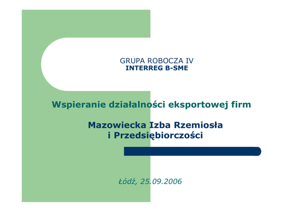 GRUPA ROBOCZA IV INTERREG B-SME Wspieranie działalności eksportowej firm Mazowiecka Izba Rzemiosła i Przedsiębiorczości Łódź, 25.09.2006 I. Informacje wstępne Początek działalności 1929r. MIRiP - organizacja samorządu gospodarczego Główne obszary działalności: z lobby na rzecz sektora mikro, małych i średnich przedsiębiorstw - wobec władz państwowych i lokalnych; z wspieranie sektora msp poprzez szkolenia, doradztwo, informacje; z szkolnictwo zawodowe; z współpraca międzynarodowa z ISO 9001 ZETOM-CERT Misja Izby Wspieranie rozwoju przedsiębiorczości i rzemiosła oraz reprezentowanie i ochrona interesów sektora msp wobec organów administracji państwowej ISO 9001 ZETOM-CERT II. Tradycje współpracy z zagranicą z z z ISO 9001 ZETOM-CERT Izba Rzemieślnicza Duesseldorf – oficjalna umowa partnerska podpisana w 1983r; wspólny projekt realizowany w latach1991-1996 (transfer know-how – organizacja pracy Izby, promocja gospodarcza, transfer informacji gospodarczych, współpraca w zakresie organizacji targów i wystaw) 1992r współpraca z Izbą Przemysłowo-Handlową z St. Petersburga – szkolenia dla polskich i rosyjskich przedsiębiorców z zakresu zagadnień celnych; 1994r organizacja misji gospodarczej z Aten do Warszawy (we współpracy z polskim Radcą Handlowym oraz Ambasadą Grecji); Tradycje współpracy z zagranicą z z z z ISO 9001 ZETOM-CERT 1996-1999r. współpraca z Izbą Rzemieślniczą w Budapeszcie – w zakresie organizacji wyjazdów polskich przedsiębiorców na targi wiosenne w Budapeszcie; 1996-2001r. Współpraca z Izbą Rzemieślniczą w Kolonii – w zakresie organizacji wyjazdów polskich przedsiębiorców na targi czerwcowe (dofinansowanie udziału w Targach przez rząd Nadrenii- Westfalii); 2002r. - udział w projekcie CAPE I w 4 obszarze tematycznym „zarządzanie izbami”, na przykładzie modelu brytyjskiego (seminarium międzynarodowe, konsultacje) 2002r. Udział w unijnym projekcie Business Support Programme związanym z transferem know-how funkcjonowania Izb; Tradycje współpracy z zagranicą z z ISO 9001 ZETOM-CERT 2005 współpraca z Izbą Rzemiosł Regionu Moskiewskiego – MIRiP zorganizowała szkolenie dla właścicieli placówek handlowych szkolenie w zakresie marketingu eksportowego; Od 2002 współpraca z Parlamentem Hanzeatyckim III. Wspieranie działań proeksportowych Typy działań: z z z ISO 9001 ZETOM-CERT Obsługa programów eksportowych Giełdy kooperacyjne Szkolenia Wspieranie działań proeksportowych Obsługa programów PHARE 2000, 2001, 2003 programy eksportowe (jako Regionalna Instytucja Finansująca) PHARE 2000: - Program Promocji Eksportu, działania: badania rynku zagranicznego, kojarzenie partnerów, wyjazd studialny, promocja produktu, uczestnictwo w zagranicznych targach i wystawach; - Wprowadzenie do Eksportu, działania: szkolenia – marketing eksportowy i transakcje eksportowe ISO 9001 ZETOM-CERT Wspieranie działań proeksportowych PHARE 2001: - Program Rozwoju Przedsiębiorstw Eksportowych, działania: a) Ocena konkurencyjnej pozycji przedsiębiorstw na wybranych rynkach eksportowych (usługi doradcze), b) rozwój strategii eksportowej przedsiębiorstwa, rozwój rynków eksportowych (usługi doradcze), ISO 9001 ZETOM-CERT Wspieranie działań proeksportowych c) Rozwój Rynków Eksportowych (usługi doradcze, konsultacyjne, uczestnictwo w targach i wystawach za granicą) PHARE 2003: Program Rozwoju Przedsiębiorstw Eksportowych, działania: a) Planowanie Eksportu oraz rozwój produktów eksportowych (usługi doradcze) ISO 9001 ZETOM-CERT Wspieranie działań proeksportowych b) Rozwój umiejętności związanych z marketingiem eksportowym (usługi doradcze, uczestnictwo w międzynarodowych targach i wystawach za granicą) c) Rozpoczęcie działań eksportowych (usługi doradcze) ISO 9001 ZETOM-CERT Wspieranie działań proeksportowych Program wnioski złożone zawarte umowy Całkowita wartość zakończonych umów € PHARE 2000 204 170 886 367,00 PHARE 2001 267 110 542 488,88 PHARE 2003 64 34 58 568, 06 Wspieranie działań proeksportowych ISO 9001 ZETOM-CERT Giełdy kooperacyjne: - IX. 2004r. W ramach Światowego Kongresu Small Businessu (50 firm) - X. 2005 w ramach współpracy z Urzędem Marszałkowskim (170 uczestników Kazachstan+ firmy polskie) - III. 2006r. w ramach Forum Biznesu (20 firm) - IX. 2006r. w ramach projektu Job – fit dla Europy (Ok. 70 firm: Dolna Saksonia + firmy polskie) 31 Światowy Kongres Small Businessu (27-29 IX. 2004) Forum Biznesu & Giełda Kooperacyjna 23-24 III 2006 Wspieranie działań proeksportowych Szkolenia: VI. 2006 Umowy handlowe zgodnie z Incoterms 2000 (25 uczestników, płatne); IX-X. 2006 Cykl szkoleń w ramach projektu Akademia Handlu Zagranicznego - „Prawne uwarunkowania, transakcje, negocjacje i finansowe zagadnienia handlu zagranicznego” (dofinansowanie MG), dla grupy 16 przedsiębiorców, 8 dni. ISO 9001 ZETOM-CERT IV. Wnioski Najbardziej efektywne projekty międzynarodowe: 9 poprzedzone fazą wstępną (rozpoznanie rynku, sytuacji ekonomicznej danego regionu, sytuacji organizacji rzemieślniczych i ich członków, struktury sektora msp); 9 ISO 9001 ZETOM-CERT Dotacje z kolejnych edycji programu PHARE: wyjazdy na targi i wystawy za granicę stanowiły 70% wszystkich wniosków; Wnioski ISO 9001 ZETOM-CERT 9 Giełdy kooperacyjne – zauważalne większe zainteresowanie przedsiębiorców jeśli są one branżowe oraz jeśli są samodzielne – bez imprezy towarzyszącej. W przypadku współpracy w ramach PH w organizację międzynarodowych giełd powinni włączać się poszczególni członkowie; 9 Szkolenia – największym zainteresowaniem cieszą się szkolenia specjalistyczne a nie ogólne (specjalistyczne są jednak b. drogie, niezbędne jest dofinansowanie). GRUPA ROBOCZA IV INTERREG B-SME DZIĘKUJĘ ZA UWAGĘ Anna Czechowicz +4822 636 56 24 E-mail: [email protected] ISO 9001 ZETOM-CERT