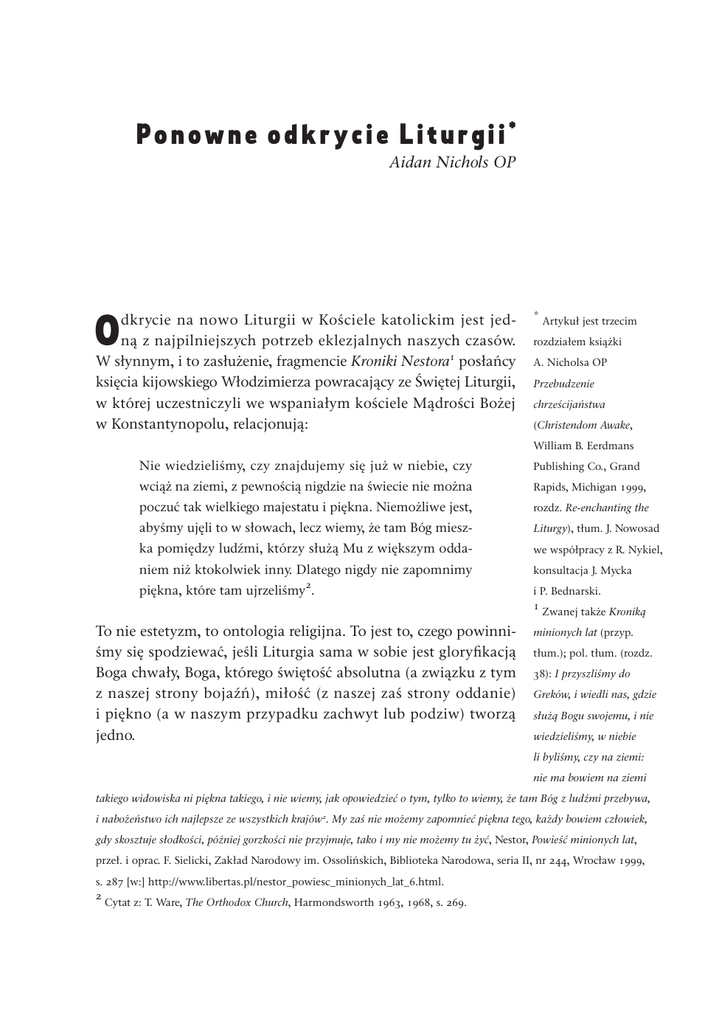 Po n o w n e o d k r y c i e L i t u r g i i * Aidan Nichols OP O dkrycie na nowo Liturgii w Kościele katolickim jest jedną z najpilniejszych potrzeb eklezjalnych naszych czasów. W słynnym, i to zasłużenie, fragmencie Kroniki Nestora1 posłańcy księcia kijowskiego Włodzimierza powracający ze Świętej Liturgii, w której uczestniczyli we wspaniałym kościele Mądrości Bożej w Konstantynopolu, relacjonują: * Artykuł jest trzecim rozdziałem książki A. Nicholsa OP Przebudzenie chrześcijaństwa (Christendom Awake, William B. Eerdmans Nie wiedzieliśmy, czy znajdujemy się już w niebie, czy Publishing Co., Grand wciąż na ziemi, z pewnością nigdzie na świecie nie można Rapids, Michigan 1999, poczuć tak wielkiego majestatu i piękna. Niemożliwe jest, rozdz. Re-enchanting the abyśmy ujęli to w słowach, lecz wiemy, że tam Bóg miesz- Liturgy), tłum. J. Nowosad ka pomiędzy ludźmi, którzy służą Mu z większym odda- we współpracy z R. Nykiel, niem niż ktokolwiek inny. Dlatego nigdy nie zapomnimy konsultacja J. Mycka piękna, które tam ujrzeliśmy2. To nie estetyzm, to ontologia religijna. To jest to, czego powinniśmy się spodziewać, jeśli Liturgia sama w sobie jest gloryfikacją Boga chwały, Boga, którego świętość absolutna (a związku z tym z naszej strony bojaźń), miłość (z naszej zaś strony oddanie) i piękno (a w naszym przypadku zachwyt lub podziw) tworzą jedno. i P. Bednarski. 1 Zwanej także Kroniką minionych lat (przyp. tłum.); pol. tłum. (rozdz. 38): I przyszliśmy do Greków, i wiedli nas, gdzie służą Bogu swojemu, i nie wiedzieliśmy, w niebie li byliśmy, czy na ziemi: nie ma bowiem na ziemi takiego widowiska ni piękna takiego, i nie wiemy, jak opowiedzieć o tym, tylko to wiemy, że tam Bóg z ludźmi przebywa, i nabożeństwo ich najlepsze ze wszystkich krajów2. My zaś nie możemy zapomnieć piękna tego, każdy bowiem człowiek, gdy skosztuje słodkości, później gorzkości nie przyjmuje, tako i my nie możemy tu żyć, Nestor, Powieść minionych lat, przeł. i oprac. F. Sielicki, Zakład Narodowy im. Ossolińskich, Biblioteka Narodowa, seria II, nr 244, Wrocław 1999, s. 287 [w:] http://www.libertas.pl/nestor_powiesc_minionych_lat_6.html. 2 Cytat z: T. Ware, The Orthodox Church, Harmondsworth 1963, 1968, s. 269. 246 3 W. J. Grisbrooke, The Necessity of Enchantment, „Priests and People”, lipiec 1997, ss. 266-70. 4 Ang. worship. Christianitas 53-54/2013 studia Warunkiem wstępnym uczynienia Liturgii „czarowną” i co za tym idzie, „oczarowującą” (zapożyczyłem te terminy od angielskiego prawosławnego liturgisty W. Jardina Grisbrooke’a3) jest unikanie innych zastosowań, do których – szkodliwie – kult Boży może być użyty. Amerykański benedyktyn i teolog Liturgii Aidan Kavanagh zwrócił uwagę na niepokojącą tendencję we współczesnym, sprawowanym w języku narodowym kulcie Kościoła łacińskiego4, aby rozpoczynać Liturgię od: aktu zgromadzenia i gościnności […] aby utworzyć rodzaj potwierdzonej wspólnoty, która celebruje wartości klasy średniej: gromadzenie się, spotykanie i „wyrażanie swych opinii” […]; aby odejść od sztuki ceremonii i symbolu w kierunku werbalizacji jako głównego środka 5 A. Kavanagh, OSB, komunikowania5. Liturgical Inculturation: Looking to the Future, „Studia Liturgica”, 20 (1990), s. 98. „Ikonografia”, pisze Kavanagh, „znika z naszych nowych kościołów, ustępując miejsca roślinom doniczkowym i przestrzeniom jakby z centrum handlowego”. Takie tendencje mogą jedynie: przysłonić sens sakramentalności i Bożej obecności jako różniących się i przekraczających wspólnotę sprawującą akt kultu […]. Liturgia zaczyna być postrzegana przez wielu bardziej jako męczący dialektyczny wysiłek w budzeniu świadomości klasy średniej, dotyczącej ideologicznie poprawnych sposobów i środków, niż posłuszne 6 Ang. alarming; oznaczać może także zatrważającej (przyp. tłum.). 7 A. Kavanagh, OSB, On Liturgical Theology, New York 1984. przebywanie w poruszającej 6 obecności żyjącego Boga w Chrystusie7. Te ostre, lecz uzasadnione słowa pochodzą, co trudniejsze, od liturgisty, którego większość prac opierała się na wskazywaniu normatywnego znaczenia dla wiary Kościoła „zasady modlitwy”. W wyborze życia liturgicznego, może bardziej benedyktyńskiego niż dominikańskiego, Kavanagh uznał Liturgię za theologia prima: główną lub pierwszą teologię, zasadnicze lub pierwotne źródło teologii wartej swego miana. Oczywiście można uważać Liturgię za najważniejszy po Piśmie Świętym monument świętej tradycji, w której objawienie Ewangelii jest przekazywane przez wie- 247 o . A i d a n N i c h o l s OP P o n o w n e o d k r y c i e L i t u r g i i ki. Również Eucharystia może być uznana za główne działanie, zgodnie z którym Kościół uobecnia się najgłębiej i w tym samym czasie wspomina istotę Bożego działania w historii: wylewanie na cały świat miłości Trójcy w Chrystusie. Z obu tych powodów wszystkie deformacje życia liturgicznego w Kościele mają, jak słusznie zauważa Kavanagh, poważne konsekwencje. Liturgia a estetyka chrześcijańska Jednym z objawów zdrowej amerykańskiej reakcji na współczesną błędną praktykę jest Deklaracja ze Snowbird dotycząca katolickiej muzyki liturgicznej (Snowbird Statement on Catholic Liturgical Music8), która postulując bardziej intensywne i konsekwentne zaangażowanie w teologiczną i filozoficzną estetykę, zachęca, w sposób odpowiedni dla wszystkich dziedzin sztuki w Liturgii (nie tylko w stosunku do muzyki), do ponownego włączenia oddzielonej liturgiki do pełni chrześcijaństwa jako doktrynalnej i metafizycznej całości. Liturgii i jej piękna nie można oddzielić od naszego pojmowania samego Objawienia i chwały. Skoro Liturgia jest papierkiem lakmusowym naszej reakcji na religię, zatem przeznaczenie Liturg
