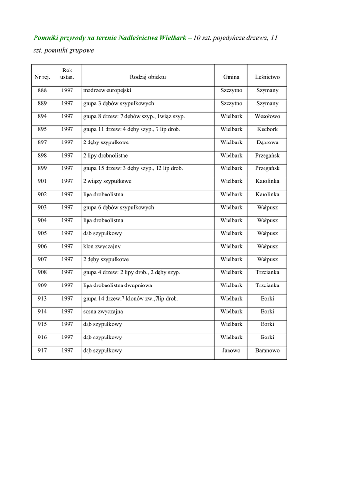 Pomniki przyrody na terenie Nadleśnictwa Wielbark – 10 szt. pojedyńcze drzewa, 11 szt. pomniki grupowe Nr rej. Rok ustan. 888 1997 889 Rodzaj obiektu Gmina Leśnictwo modrzew europejski Szczytno Szymany 1997 grupa 3 dębów szypułkowych Szczytno Szymany 894 1997 grupa 8 drzew: 7 dębów szyp., 1wiąz szyp. Wielbark Wesołowo 895 1997 grupa 11 drzew: 4 dęby szyp., 7 lip drob. Wielbark Kucbork 897 1997 2 dęby szypułkowe Wielbark Dąbrowa 898 1997 2 lipy drobnolistne Wielbark Przegańsk 899 1997 grupa 15 drzew: 3 dęby szyp., 12 lip drob. Wielbark Przegańsk 901 1997 2 wiązy szypułkowe Wielbark Karolinka 902 1997 lipa drobnolistna Wielbark Karolinka 903 1997 grupa 6 dębów szypułkowych Wielbark Wałpusz 904 1997 lipa drobnolistna Wielbark Wałpusz 905 1997 dąb szypułkowy Wielbark Wałpusz 906 1997 klon zwyczajny Wielbark Wałpusz 907 1997 2 dęby szypułkowe Wielbark Wałpusz 908 1997 grupa 4 drzew: 2 lipy drob., 2 dęby szyp. Wielbark Trzcianka 909 1997 lipa drobnolistna dwupniowa Wielbark Trzcianka 913 1997 grupa 14 drzew:7 klonów zw.,7lip drob. Wielbark Borki 914 1997 sosna zwyczajna Wielbark Borki 915 1997 dąb szypułkowy Wielbark Borki 916 1997 dąb szypułkowy Wielbark Borki 917 1997 dąb szypułkowy Janowo Baranowo Pomniki przyrody w granicach Nadleśnictwa Wielbark na gruntach nie stanowiących własności LP – 13szt. pojedyńcze drzewa, 1 pomnik grupowy. Nr rej. Rok ustan. Gmina W obrębie leśnictwa Lokalizacja obiektu 139 1952 dąb szypułkowy Wielbark Sawicz ok.2.5 km od Wielbarka przy drodze do Jedwabna 485 1987 dąb szypułkowy Wielbark Borki 838 1995 jałowiec Janowo Baranowo przy drodze w m. Róg 848 1996 dąb szypułkowy Wielbark Kucbork Wielbark, ul.1-Maja 3 849 1996 dąb szypułkowy Wielbark Kucbork ok.3 km od Wielbarka, przy drodze nr 54 do Szczytna 890 1997 dąb szypułkowy Szczytno Szymany Sasek Wielki 891 1997 dąb szypułkowy Szczytno Szymany Sasek Wielki 892 1997 dąb szypułkowy Szczytno Szymany Sasek Wielki 893 1997 dąb szypułkowy Szczytno Szymany Sasek Wielki 900 1997 dąb szypułkowy Wielbark Karolinka Kolonia Rokitka 910 1997 dąb szypułkowy Wielbark Trzcianka kolonia k/ oddz. 563-a 911 1997 2 dęby szypułkowe Wielbark Kipary Kipary 912 1997 dąb szypułkowy Wielbark Borki przy drodze Lejkowo- Łatana 847 1997 dąb szypułkowy Wielbark Kipary kolnia Zapadki Rodzaj obiektu Pomnikowy dąb szypułkowy nr rej. 900- pole Rokitka Łatana Wielka (fot. Stańczak T.)