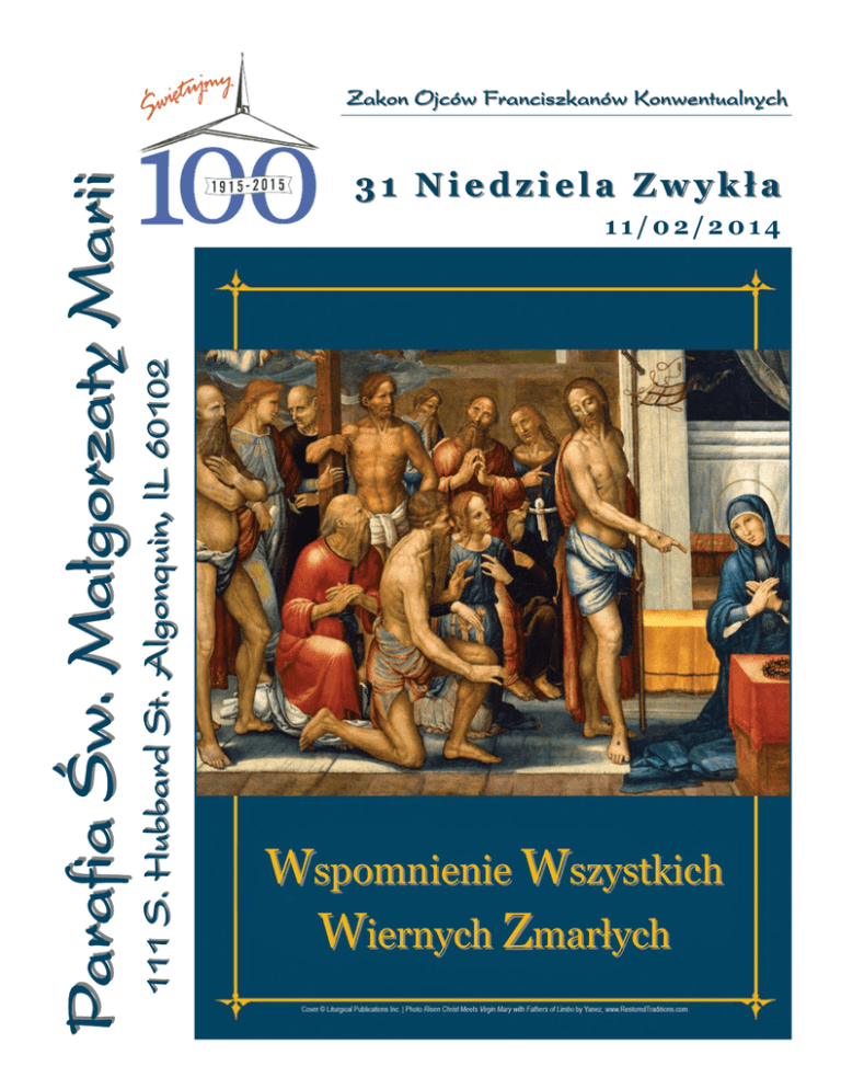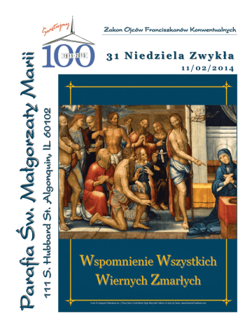 31 Niedziela Zwykła 11/02/2014 111 S. Hubbard St. Algonquin, lL 60102 Parafia Św. Małgorzaty Marii Zakon Ojców Franciszkanów Konwentualnych Wspomnienie Wszystkich Wiernych Zmarłych OD PROBOSZCZA Drodzy Przyjaciele! Dzisiaj obchodzimy Wspomnienie Wszystkich Wiernych Zmarłych. Katechizm Kościoła Katolickiego uczy nas: „Ci, którzy umierają w łasce i przyjaźni z Bogiem, ale nie są jeszcze całkowicie oczyszczeni, chociaż są już pewni swego wiecznego zbawienia, przechodzą po śmierci oczyszczenie, by uzyskać świętość konieczną do wejścia do radości nieba. To końcowe oczyszczenie wybranych, które jest czymś całkowicie innym niż kara potępionych, Kościół nazywa czyśćcem.” Wiemy, że dusze cierpiące w czyśćcu nie mogą pomóc same sobie. To my, którzy stale pozostajemy na ziemi możemy przyspieszyć ich oczyszczenie naszą za nich modlitwą. Św. Siostra Faustyna tak opisuje czyściec w swoim dzienniczku: „Ujrzałam Anioła Stróża, który mi kazał pójść za sobą. W jednej chwili znalazłam się w miejscu mglistym, napełnionym ogniem, a w nim całe mnóstwo dusz cierpiących. Te dusze modlą się bardzo gorąco, ale bez skutku dla siebie, my tylko możemy im przyjść z pomocą. Płomienie, które paliły je, nie dotykały się mnie. Mój Anioł Stróż nie odstępował mnie ani na chwilę. I zapytałam się tych dusz, jakie ich jest największe cierpienie? I odpowiedziały mi jednozgodnie, że największe dla nich cierpienie to jest tęsknota za Bogiem. Widziałam Matkę Bożą odwiedzającą dusze w czyśćcu. Dusze nazywają Maryję ,,Gwiazdą Morza". Ona im przynosi ochłodę. Chciałam więcej z nimi porozmawiać, ale mój Anioł Stróż dał mi znak do wyjścia. Wyszliśmy za drzwi tego więzienia cierpiącego. [Usłyszałam głos wewnętrzny], który powiedział: Miłosierdzie moje nie chce tego, ale sprawiedliwość każe. Od tej chwili ściślej obcuję z duszami cierpiącymi.” Na innym miejscu w swoim dzienniczku napisała jak ważną rzeczą jest modlić się za dusze w czyśćcu: Jezus powiedział do swoich uczniów: „Niech się nie „W pewnej chwili w nocy przyszła jedna z naszych sióstr do trwoży serce wasze. Wierzycie w Boga? mnie, która umarła przed dwoma miesiącami. Była to I we Mnie wierzcie. W domu Ojca mego jest mieszkań siostra pierwszego chóru. Ujrzałam ja w strasznym stanie. Cała w płomieniach, twarz boleśnie wykrzywiona. Trwało to wiele. Gdyby tak nie było, to bym wam powiedział. krótką chwile i znikła. Dreszcze przeszył moją duszę, bo nie Idę przecież przygotować wam miejsce. A gdy odejdę wiedząc gdzieżby cierpiała, czy w czyśćcu czy w piekle, i przygotuję wam miejsce, przybędę powtórnie jednak podwoiłam modlitwy moje za nią. Na drugą noc i zabiorę was do siebie, abyście i wy byli tam, gdzie Ja przyszła znowu, ale ujrzałam ja w straszniejszym stanie, jestem. Znacie drogę, dokąd Ja idę”. w straszniejszych płomieniach, na twarzy malowała się Odezwał się do Niego Tomasz: „Panie, nie wiemy, rozpacz. Zdziwiło mnie to bardzo, ze po modlitwach, które dokąd idziesz. Jak więc możemy znać drogę?” za nią ofiarowałam, ujrzałam ją w straszniejszym stanie i zapytałam: czy ci nic nie pomogły modlitwy moje? – Odpowiedział mu Jezus: „Ja jestem drogą, prawdą i odpowiedziała mi, że nic jej nie pomogła modlitwa moja i życiem. Nikt nie przychodzi do Ojca inaczej jak tylko i nic nie pomoże. Zapytałam ją – a czy modlitwy, które cale przeze Mnie”. Zgromadzenie ofiarowało za ciebie, czy też ni nic nie przyniosły pomocy? – Odpowiedziała, że nic. Modlitwy te poszły na korzyść dusz innych. I odpowiedziałam jej, jeżeli modlitwy moje nic siostrze nie pomagają, to proszę do mnie nie przychodzić. I znikła natychmiast. Jednak w modlitwach nie ustawałam. Po jakimś czasie przyszła znowu do mnie w nocy, ale już w innym stanie. Już nie była w płomieniach, jak przed tym, a twarz jej była rozpromieniona, oczy błyszczały radością i powiedziała mi, że mam prawdziwą miłość bliźniego, że wiele dusz innych skorzystało z modli moich i zachęcała mnie, żebym nie ustawała w modlitwach za duszami w czyśćcu cierpiącymi i powiedziała mi, że ona już niedługo będzie w czyśćcu pozostawać. Jednak dziwne są wyroki Boże.” Kościół zawsze modli się za zmarłych podczas każdej Mszy św. Zachęca również każdego z nas do takiej modlitwy. Starajmy się w miesiącu listopadzie w sposób szczególny pamiętać o naszych zmarłych ofiarując za nich Komunię św., posty, wyrzeczenia i dobre uczynki. Wieczny odpoczynek racz Im dać Panie. Słowa Ewangelii wg św. Jana 14, 1-6 Pokój i Dobro, Fr. Peter Sarnicki, OFM, Conv. OGŁOSZENIA W poniedziałek 3 listopada zapraszamy na Mszę św. o 7 wieczorem i wypominki. Przypominamy o zapisywaniu się na sesje zdjęciowe portretów rodzinnych do naszej księgi pamiątkowej z okazji 100 – lecia Parafii. Każda rodzina albo osoby indywidualne, które wezmą w nich udział będą miały zdjęcia opublikowane w katalogu oraz otrzymają księgę pamiątkową, gdy zostanie opublikowana na początku przyszłego roku. Otrzymają także bezpłatne zdjęcie o rozmiarach 10x13. Dodatkowe kopie dla rodziny i przyjaciół można również nabyć, i w ten sposób pomóc w pokryciu kosztów wydania księgi pamiątkowej. Zapisać się można poprzez link umieszczony na naszej internetowej stronie parafialnej. Karteczki z czytelnie napisanymi imionami zmarłych i ofiarami prosimy składać do skrzynki z napisem WYPOMINKI, która znajduje się na stoliku przy wyjściu z kościoła. MYŚLI DNIA „Pospólstwo rozumie, iż potrawami, napojem i śpiewami przynosi ulgę duszom czyśćcowym” W przyszłą niedzielę 9-go listopada, po Mszy Św. uczniowie Polskiej Szkoły przedstawią program czytamy w II części Dziadów o tzw. Zaduszkach. artystyczny z okazji Święta Niepodległości. WYPOMINKI W niedzie