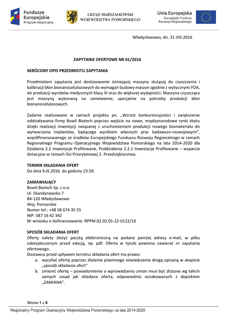 Władysławowo, dn. 31.VIII.2016 ZAPYTANIE