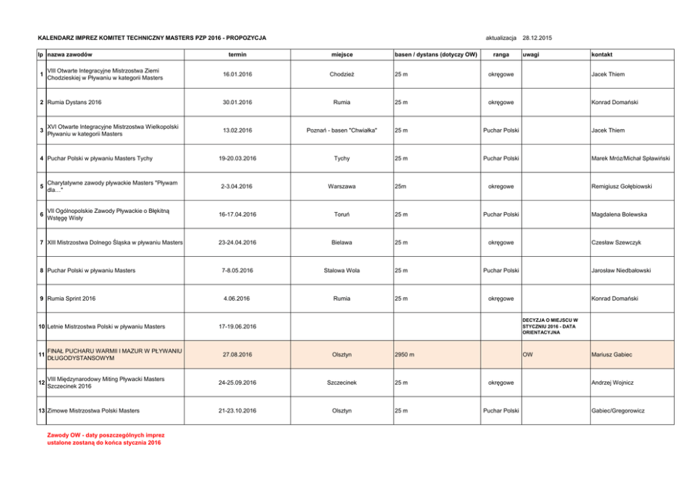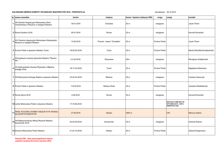 KALENDARZ IMPREZ KOMITET TECHNICZNY MASTERS PZP 2016 - PROPOZYCJA lp nazwa zawodów 1 VIII Otwarte Integracyjne Mistrzostwa Ziemi Chodzieskiej w Pływaniu w kategorii Masters 2 Rumia Dystans 2016 3 XVI Otwarte Integracyjne Mistrzostwa Wielkopolski Pływaniu w kategorii Masters 4 Puchar Polski w pływaniu Masters Tychy 5 Charytatywne zawody pływackie Masters "Pływam dla…" 6 VII Ogólnopolskie Zawody Pływackie o Błękitną Wstęgę Wisły 7 XIII Mistrzostwa Dolnego Śląska w pływaniu Masters 8 Puchar Polski w pływaniu Masters 9 Rumia Sprint 2016 10 Letnie Mistrzostwa Polski w pływaniu Masters 11 FINAŁ PUCHARU WARMII I MAZUR W PŁYWANIU DŁUGODYSTANSOWYM 12 VIII Międzynarodowy Miting Pływacki Masters Szczecinek 2016 13 Zimowe Mistrzostwa Polski Masters Zawody OW - daty poszczególnych imprez ustalone zostaną do końca stycznia 2016 aktualizacja basen / dystans (dotyczy OW) ranga 28.12.2015 termin miejsce uwagi kontakt 16.01.2016 Chodzież 25 m okręgowe Jacek Thiem 30.01.2016 Rumia 25 m okręgowe Konrad Domański 13.02.2016 Poznań - basen "Chwiałka" 25 m Puchar Polski Jacek Thiem 19-20.03.2016 Tychy 25 m Puchar Polski Marek Mróz/Michał Spławiński 2-3.04.2016 Warszawa 25m okregowe 16-17.04.2016 Toruń 25 m Puchar Polski 23-24.04.2016 Bielawa 25 m okręgowe 7-8.05.2016 Stalowa Wola 25 m Puchar Polski 4.06.2016 Rumia 25 m okręgowe Remigiusz Gołębiowski Magdalena Bolewska Czesław Szewczyk Jarosław Niedbałowski Konrad Domański DECYZJA O MIEJSCU W STYCZNIU 2016 - DATA ORIENTACYJNA 17-19.06.2016 27.08.2016 Olsztyn 2950 m OW 24-25.09.2016 Szczecinek 25 m okręgowe 21-23.10.2016 Olsztyn 25 m Puchar Polski Mariusz Gabiec Andrzej Wojnicz Gabiec/Gregorowicz