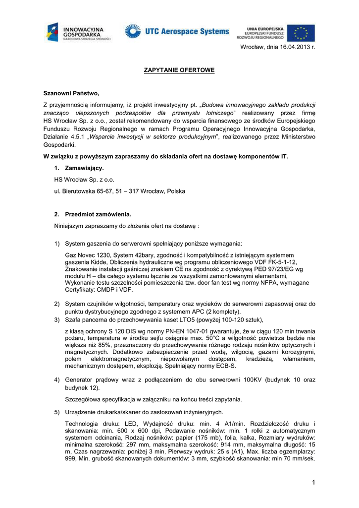 Wrocław, dnia 16.04.2013 r. ZAPYTANIE OFERTOWE Szanowni Państwo, Z przyjemnością informujemy, iż projekt inwestycyjny pt. „Budowa innowacyjnego zakładu produkcji znacząco ulepszonych podzespołów dla przemysłu lotniczego” realizowany przez firmę HS Wrocław Sp. z o.o., został rekomendowany do wsparcia finansowego ze środków Europejskiego Funduszu Rozwoju Regionalnego w ramach Programu Operacyjnego Innowacyjna Gospodarka, Działanie 4.5.1 „Wsparcie inwestycji w sektorze produkcyjnym”, realizowanego przez Ministerstwo Gospodarki. W związku z powyższym zapraszamy do składania ofert na dostawę komponentów IT. 1. Zamawiający. HS Wrocław Sp. z o.o. ul. Bierutowska 65-67, 51 – 317 Wrocław, Polska 2. Przedmiot zamówienia. Niniejszym zapraszamy do złożenia ofert na dostawę : 1) System gaszenia do serwerowni spełniający poniższe wymagania: Gaz Novec 1230, System 42bary, zgodność i kompatybilność z istniejącym systemem gaszenia Kidde, Obliczenia hydrauliczne wg programu obliczeniowego VDF FK-5-1-12, Znakowanie instalacji gaśniczej znakiem CE na zgodność z dyrektywą PED 97/23/EG wg modułu H – dla całego systemu łącznie ze wszystkimi zamontowanymi elementami, Wykonanie testu szczelności pomieszczenia tzw. door fan test wg normy NFPA, wymagane Certyfikaty: CMDP i VDF. 2) System czujników wilgotności, temperatury oraz wycieków do serwerowni zapasowej oraz do punktu dystrybucyjnego zgodnego z systemem APC (2 komplety). 3) Szafa pancerna do przechowywania kaset LTO5 (powyżej 100-120 sztuk), z klasą ochrony S 120 DIS wg normy PN-EN 1047-01 gwarantuje, że w ciągu 120 min trwania pożaru, temperatura w środku sejfu osiągnie max. 50°C a wilgotność powietrza będzie nie większa niż 85%, przeznaczony do przechowywania różnego rodzaju nośników optycznych i magnetycznych. Dodatkowo zabezpieczenie przed wodą, wilgocią, gazami korozyjnymi, polem elektromagnetycznym, niepowołanym dostępem, kradzieżą, włamaniem, mechanicznym dostępem, eksplozją. Spełniający normy ECB-S. 4) Generator prądowy wraz z podłączeniem do obu serwerowni 100KV (budynek 10 oraz budynek 12). Szczegółowa specyfikacja w załączniku na końcu treści zapytania. 5) Urządzenie drukarka/skaner do zastosowań inżynieryjnych. Technologia druku: LED, Wydajność druku: min. 4 A1/min. Rozdzielczość druku i skanowania: min. 600 x 600 dpi, Podawanie nośników: min. 1 rolki z automatycznym systemem odcinania, Rodzaj nośników: papier (175 mb), folia, kalka, Rozmiary wydruków: minimalna szerokość: 297 mm, maksymalna szerokość: 914 mm, maksymalna długość: 15 m, Czas nagrzewania: poniżej 3 min, Pierwszy wydruk: 25 s (A1), Max. liczba egzemplarzy: 999, Min. grubość skanowanych dokumentów: 3 mm, szybkość skanowania: min 70 mm/sek. 1 Pamięć: 2 GB, Formaty danych: HP-GL, HP-GL/2, HP-RTL, FileNET, TIFF 6.0, NIRS, VCGL, CALS 1&2, CGM, VDS, VRF,PostScript/PDF, DWF, BMP, JPEG 2000, PNG, GIF, DGN, Interfejsy: Ethernet 10/100, Protokoły sieciowe: TCP/IP, LPR, Sterowniki: - AutoCAD HDI, Windows NT/2000/XP, Obciążalność miesięczna urządzenia: min 4000 m2, Gwarancja: min.12 miesięcy lub 30.000mb Rozszerzenie systemu CCTV (system DIVA) o dodatkowe 25 kamer. Upgrade systemu WEBCon wraz z wdrożeniem systemu raportującego. Oferowany sprzęt musi spełniać następujące normy: deklaracja zgodności CE, Zamawiający zastrzega sobie możliwość dokonania zakupu wybranych punktów u różnych dostawców, w zależności od parametrów cenowych oraz odstąpienia od zamówienia poszczególnych pozycji bez podania przyczyny, jak również do dostosowania ilości kupowanego sprzętu w zależności zaplanowanego budżetu na inwestycję. 3. Kryteria oceny ofert. Oferty zostaną poddane ocenie w odniesieniu do poniższych kryteriów wyboru. W przypadku każdego kryterium ocena zostaje udzielona na podstawie pisemnej oferty przedstawionej przez oferenta. Kryteria wyboru oferty: 1. 2. 3. 4. 5. Cena oferowanych elementów zestawu Preferowana forma płatności 60 dni Termin dostarczenia sprzętu Możliwość integracji lub zgodność z obecnym sprzętem Doświadczenie w realizacji podobnych zamówień 0-20 punktów 0-20 punktów 0-20 punktów 0-20 punktów 0-20 punktów 4. Sposób przygotowania oferty. Złożona oferta powinna zawierać co najmniej: a) być krótsza niż 5 stron, b) zawierać pełną nazwę i adres oferenta, c) być sporządzona na papierze firmowym oferenta lub opatrzona pieczątką firmową, preferowane są oferty w wersji PDF. d) posiadać datę sporządzenia, e) być podpisana przez przedstawiciela oferenta należycie upełnomocnionego do zaciągania zobowiązań w imieniu oferenta. f) Dla cen podanych w innych walutach, prosimy o wskazanie sposobu przeliczania walut na PLN. g) Wszelkie certyfikaty/ specyfikacje powinny być załączone do oferty i nie wliczają się w wymaganie opisane w punkcie a. h) Certyfikaty, normy jakim podlegają sprzęt (gównie 1, 3 oraz 4) powinny zawierać opisy przeprowadzonych testów lub norm. Oferta powinna być ważna przynajmniej przez okres 1 miesiąca (oferta musi być ważna na dzień złożenia zamówienia, które przewiduje się na dzień 26 kwietnia 2013). Nadmienia się, iż zgodnie ze standardami Grupy Kapitałowej UTC, do której należy HS Wrocław Sp. z o.o., zakupy oraz współpraca z podwykonawcami przebiegają w oparciu o kryteria ochrony środowiska i zasady społecznej odpowiedzialności biznesu. Potencjalni kooperanci powinni 2 zapoznać się z polityką wyboru dostawców realizowaną przez HS Wrocław (stanowiącą załącznik do zapytania ofertowego) oraz zawrzeć w ofercie poniższe oświadczenie: „Oświadczam, że zapoznałem się z zasadami „Polityki wyboru wykonawców i dostawców realizowaną przez HS Wrocław Sp. z o.o,”, która stanowi załącznik do zapytania ofertowego.” 5. Termin realizacji zamówienia. Oczekuje się terminu dostawy sprzętu oraz faktury do 30 czerwca 2013. W przy