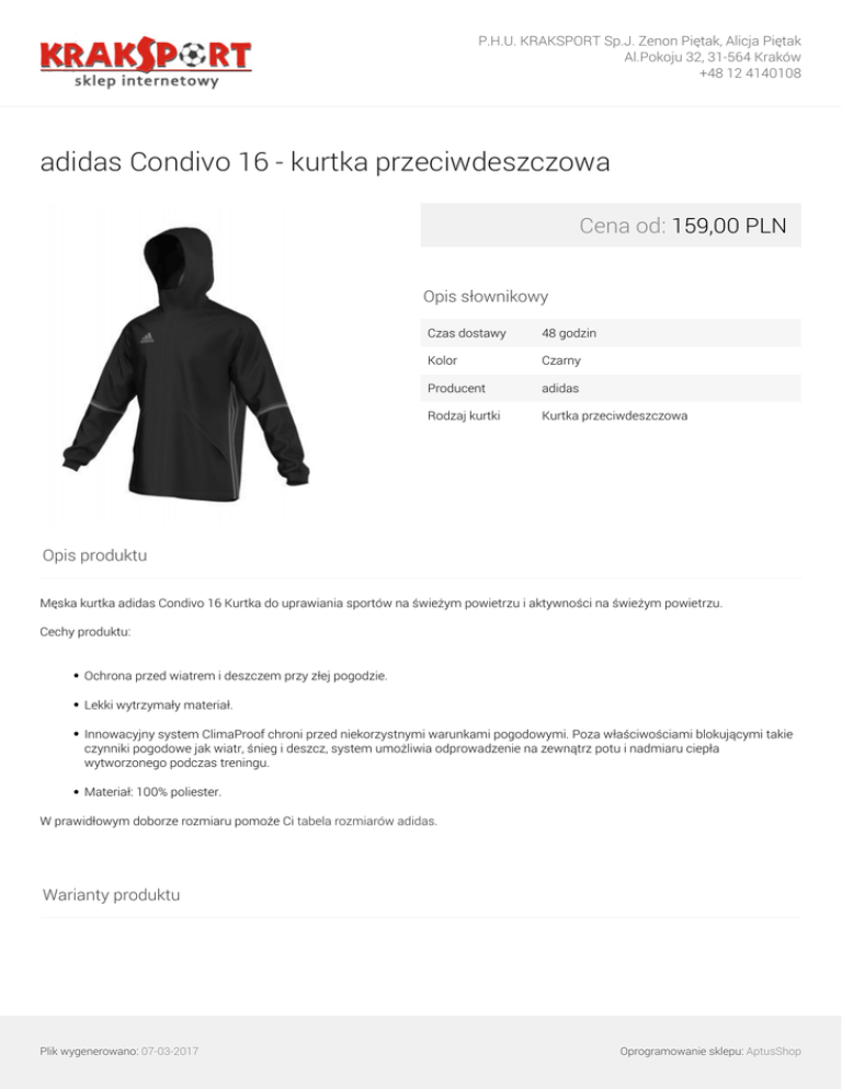 P.H.U. KRAKSPORT Sp.J. Zenon Piętak, Alicja Piętak Al.Pokoju 32, 31-564 Kraków +48 12 4140108 adidas Condivo 16 - kurtka przeciwdeszczowa Cena od: 159,00 PLN Opis słownikowy Czas dostawy 48 godzin Kolor Czarny Producent adidas Rodzaj kurtki Kurtka przeciwdeszczowa Opis produktu Męska kurtka adidas Condivo 16 Kurtka do uprawiania sportów na świeżym powietrzu i aktywności na świeżym powietrzu. Cechy produktu: Ochrona przed wiatrem i deszczem przy złej pogodzie. Lekki wytrzymały materiał. Innowacyjny system ClimaProof chroni przed niekorzystnymi warunkami pogodowymi. Poza właściwościami blokującymi takie czynniki pogodowe jak wiatr, śnieg i deszcz, system umożliwia odprowadzenie na zewnątrz potu i nadmiaru ciepła wytworzonego podczas treningu. Materiał: 100% poliester. W prawidłowym doborze rozmiaru pomoże Ci tabela rozmiarów adidas. Warianty produktu Plik wygenerowano: 07-03-2017 Oprogramowanie sklepu: AptusShop P.H.U. KRAKSPORT Sp.J. Zenon Piętak, Alicja Piętak Al.Pokoju 32, 31-564 Kraków +48 12 4140108 S 159,00 PLN M 159,00 PLN L 159,00 PLN XL 159,00 PLN XXL 159,00 PLN Galeria Plik wygenerowano: 07-03-2017 Powered by TCPDF (www.tcpdf.org) Oprogramowanie sklepu: AptusShop