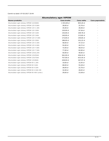 Cennik na dzień: 07-03-2017 10:44 Akumulatory agm VIPOW Nazwa produktu Cena brutto Cena netto Cena poprzednia Akumulator agm żelowy VIPOW 12/100Ah 1 015,00 zł 825,20 zł - Akumulator agm żelowy VIPOW 12V 0.8Ah 28,00 zł 22,76 zł - Akumulator agm żelowy VIPOW 12V 1.3Ah 35,00 zł 28,46 zł - Akumulator agm żelowy VIPOW 12V 10Ah 120,00 zł 97,56 zł - Akumulator agm żelowy VIPOW 12V 12Ah 135,00 zł 109,76 zł - Akumulator agm żelowy VIPOW 12V 14Ah 140,00 zł 113,82 zł - Akumulator agm żelowy VIPOW 12V 17.0Ah 173,00 zł 140,65 zł - Akumulator agm żelowy VIPOW 12V 20Ah 186,00 zł 151,22 zł - Akumulator agm żelowy VIPOW 12V 3.3Ah 58,00 zł 47,15 zł - Akumulator agm żelowy VIPOW 12V 4.0Ah 55,00 zł 44,72 zł - Akumulator agm żelowy VIPOW 12V 7.0Ah 72,00 zł 58,54 zł - Akumulator agm żelowy VIPOW 12V 7.5Ah 77,00 zł 62,60 zł - Akumulator agm żelowy VIPOW 12V/2,2Ah 50,00 zł 40,65 zł - Akumulator agm żelowy VIPOW 12V/55Ah 561,00 zł 456,10 zł - Akumulator agm żelowy VIPOW 12V/75Ah 757,00 zł 615,45 zł - Akumulator agm żelowy VIPOW 12V40Ah 428,00 zł 347,97 zł - Akumulator agm żelowy VIPOW 6V 1.3Ah 19,00 zł 15,45 zł - Akumulator agm żelowy VIPOW 6V 12Ah 68,00 zł 55,28 zł - Akumulator agm żelowy VIPOW 6V 4.5Ah 28,00 zł 22,76 zł - Akumulator agm żelowy VIPOW 6V 4.5Ah HQ 32,00 zł 26,02 zł - Akumulator agm żelowy VIPOW 6V 4Ah (uniw.) 29,00 zł 23,58 zł - 1/1 Powered by TCPDF (www.tcpdf.org)