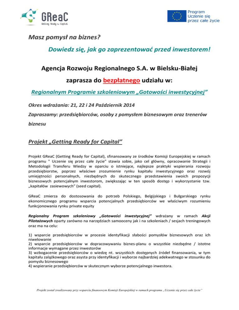 Masz pomysł na biznes? Dowiedz się, jak go zaprezentować przed inwestorem! Agencja Rozwoju Regionalnego S.A. w Bielsku-Białej zaprasza do bezpłatnego udziału w: Regionalnym Programie szkoleniowym „Gotowości inwestycyjnej” Okres wdrażania: 21, 22 i 24 Październik 2014 Zapraszamy: przedsiębiorców, osoby z pomysłem biznesowym oraz trenerów biznesu Projekt „Getting Ready for Capital” Projekt GReaC (Getting Ready for Capital), sfinansowany ze środków Komisji Europejskiej w ramach programu " Uczenie się przez całe życie" stawia sobie, jako cel główny, opracowanie Strategii i Metodologii Transferu Wiedzy w oparciu o istniejące, najlepsze praktyki wspierania rozwoju przedsiębiorstw, poprzez właściwe zrozumienie rynku kapitału inwestycyjnego oraz rozwój umiejętności personalnych, niezbędnych do skutecznego przedstawienia swoich propozycji biznesowych potencjalnym inwestorom, zwiększając w ten sposób dostęp i wykorzystanie tzw. „kapitałów zasiewowych” (seed capital). GReaC zmierza do dostosowania do potrzeb Polskiego, Belgijskiego i Bułgarskiego rynku ekonomicznego programu wsparcia potencjalnych przedsiębiorców we właściwym rozumieniu funkcjonowania rynku private equity Regionalny Program szkoleniowy „Gotowości inwestycyjnej” wdrażany w ramach Akcji Pilotażowych oparty zarówno na narzędziach samooceny jak i na szkoleniach / sesjach treningowych oraz ma na celu: 1) wsparcie przedsiębiorców w procesie identyfikacji słabości pomysłów biznesowych oraz ich niwelowanie 2) wsparcie przedsiębiorców w dopracowywaniu biznes-planu o wszystkie niezbędne / istotne informacje wymagane przez inwestorów 3) wzbogacenie przedsiębiorców o wiedzę nt. wszystkich dostępnych źródeł finansowania, w tym kapitału zalążkowego oraz asysta przy identyfikacji i wyborze najbardziej adekwatnego w stosunku do pomysłu biznesowego 4) wspieranie przedsiębiorców w skutecznym wyborze potencjalnego inwestora. Projekt został zrealizowany przy wsparciu finansowym Komisji Europejskiej w ramach programu „Uczenie się przez całe życie” Regionalny Program szkoleniowy „Gotowości inwestycyjnej” Akcja Pilotażowa Okres wdrażania: 21, 22 i 24 Październik 2014, Uczestnicy: przedsiębiorcy, osoby z pomysłem biznesowym, trenerzy biznesu Czas trwania szkolenia: 3 dni Ilość miejsc: ograniczona do 25 osób Program szkoleniowy: BLOK I: Wprowadzenie do finansowania pomysłu biznesowego 1 dzień szkoleniowy, ok.5h (21.X.2014) od 9.00 do 14.00 Centrum Szkoleniowe, ul. 1 dywizji Pancernej 45 Moduł 1 “Opis źródeł finansowych dla start-up” • • • • • Narzędzia finansowe dla nowopowstających firm Jakie źródła finansowe są najlepsze dla danych potrzeb firmy? Wady i zalety poszczególnych instrumentów finansowych Kim są inwestorzy "wczesnych stadium rozwoju”? Metodologia oceny pomysłów przez inwestorów? Jak i gdzie poszukiwać inwestorów? Moduł 2 Ocena gotowości inwestycyjnej za pomocą specjalistycznej platformy internetowej • • Koncepcja gotowości inwestycyjnej Zrozumienie poziomu gotowości inwestycyjnej Projekt został zrealizowany przy wsparciu finansowym Komisji Europejskiej w ramach programu „Uczenie się przez całe życie” BLOK II: Biznes Plan 1 dzień szkoleniowy, ok. 6h (22.X.2014), od 9.00 do 15.00 Centrum Szkoleniowe, ul. 1 dywizji Pancernej 45 Moduł 1 – Model biznesu „Refleksja nad tworzeniem innowacyjnego modelu biznesowego” • • • Co firma będzie robić? W jaki sposób firma będzie zarabiać? W jaki sposób model biznesowy różni się od tych konkurencyjnych? Moduł 2 – Marketing strategiczny i rozwój biznesu „Jak skonfigurować strategiczny plan marketingowy i jak korzystać z marketingu mix” Zagadnienie nr 1: • • • • Stymulowanie wykorzystania strategii marketingowej w planie biznesowym Wiedza z zakresu opracowywania strategii internacjonalizacji Jak zbudować przewagę konkurencyjną? Analiza SWOT Zagadnienie nr 2: • • Techniki prezentacji produktu Czy prezentacja była zrozumiała? Czy prawidłowo zrozumiano przedsięwzięcie biznesowe? ; Zagadnienie nr 3: • • • Czy strategia marketingowa jest jasna i dobrze zdefiniowana? Czy strategia marketingowa jest spójna z rezultatami analizy rynku? Czy jest spójna z posiadanymi zasobami (ludzkie/finansowe) Moduł 3 „Prognozy finansowe” Zagadnienia: • • • Inwestycje i źródła pokrycia finansowego: pojęcia i relacje Podstawowe założenia prognoz finansowych Analiza aspektu finansowego (potrzebny kapitał i) zg. z pomysłem na biznes Projekt został zrealizowany przy wsparciu finansowym Komisji Europejskiej w ramach programu „Uczenie się przez całe życie” Moduł 4 „Planowanie biznesu” Zagadnienia: • Biznes plan: dlaczego jest konieczny, jego struktura i jak go przygotować • Główne sekcje biznes planu i jak je przygotować • Typowe błędy w biznes planach: przykłady • Weryfikacje biznes planu: lista kontrolna / samoocena BLOK III: Gotowość inwestycyjna 1 dzień szkoleniowy, ok. 4h (24.X.2014), od 10.00 do 14.00 Miejsce: Dworek Eureka, Czechowice –Dziedzice, ul. Bolesława Prusa 64 Moduł 1 „Przygotowanie do kojarzenia z inwestorem” Etapy: 1. Prezentacja pomysłów na biznes przez uczestników Pilotażu (po 3 min.) 2. Ocena w/w prezentacji przez panel oceniających (inwestorzy i trenerzy) 3. Prezentacja szkoleniowa: ”Wzrost wiedzy na temat wymagań inwestorów”: • • • Najważniejsze elementy odpowiedniego dostosowania prezentacji do inwestorów Rozwój wiedzy na temat wymagań inwestorów Przygotowanie do prezentacji przed inwestorem Moduł 2 „Kojarzenie z inwestorem” 1. Praca w grupach ( pomysłodawca / trener/ inwestor) - wskazówki dotyczące poprawy prezentacji i modyfikacja prezentacji 2. Prezentacja propozycji biznesowych przed inwestorami z uwzględnieniem wskazówek otrzymanych od oceniających 3. Panel dyskusyjny i ewaluacja pilotażu na kwestionariuszach 