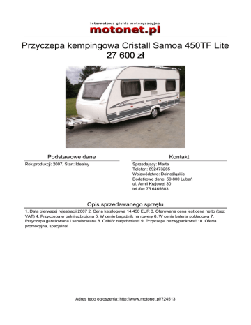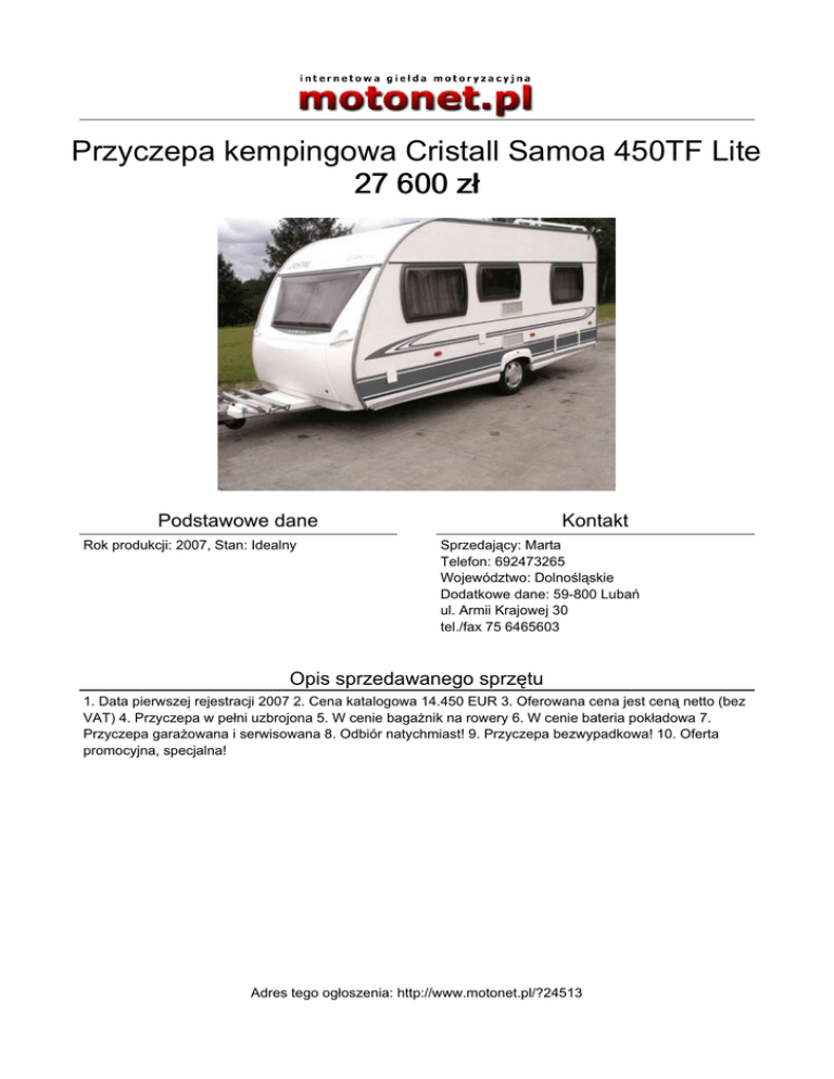 Przyczepa kempingowa Cristall Samoa 450TF Lite 27 600 zł Podstawowe dane Rok produkcji: 2007, Stan: Idealny Kontakt Sprzedający: Marta Telefon: 692473265 Województwo: Dolnośląskie Dodatkowe dane: 59-800 Lubań ul. Armii Krajowej 30 tel./fax 75 6465603 Opis sprzedawanego sprzętu 1. Data pierwszej rejestracji 2007 2. Cena katalogowa 14.450 EUR 3. Oferowana cena jest ceną netto (bez VAT) 4. Przyczepa w pełni uzbrojona 5. W cenie bagażnik na rowery 6. W cenie bateria pokładowa 7. Przyczepa garażowana i serwisowana 8. Odbiór natychmiast! 9. Przyczepa bezwypadkowa! 10. Oferta promocyjna, specjalna! Adres tego ogłoszenia: http://www.motonet.pl/?24513