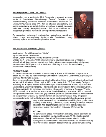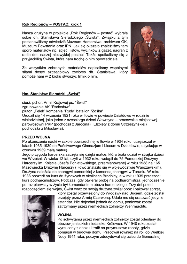 Rok Regionów – POSTAĆ: krok 1 Nasza drużyna w projekcie „Rok Regionów – postać” wybrała sobie dh. Stanisława Sieradzkiego „Śwista”. Związku z tym postanowiliśmy odwiedzić Muzeum Harcerstwa, archiwum GK, Muzeum Powstania oraz IPN. Jak się okazało znaleźliśmy tam sporo materiałów np. zdjęć, listów, wycinków z gazet, nagrań z radia dot. naszej niezwykłej postaci. Także spotkaliśmy się z przyjaciółką Śwista, która nam trochę o nim opowiedziała. Ze wszystkim zebranych materiałów napisaliśmy wspólnymi siłami dosyć szczegółowy życiorys dh. Stanisława, który pomoże nam w 2 kroku stworzyć filmik o nim. Hm. Stanisław Sieradzki „Świst” sierż. pchor. Armii Krajowej ps. "Świst" zgrupowanie AK "Radosław" pluton „Felek” kompania "Rudy" batalion "Zośka" Urodził się 14 września 1921 roku w Iłowie w powiecie Działdowo w rodzinie wielodzietnej, jako jeden z sześciorga dzieci Wawrzyna – pracownika miejscowej parowozowni PKP (pochodził z Jarocina) i Elżbiety z domu Strzeszyńskiej ( pochodziła z Miłosławia). PRZED WOJNĄ Po ukończeniu nauki w szkole powszechnej w Iłowie w 1934 roku, uczęszczał w latach 1935-1939 do Państwowego Gimnazjum i Liceum w Działdowie, uzyskując w czerwcu 1939 małą maturę. Jego przygoda harcerska zaczęła się dzięki matce, która brała udział w strajku dzieci we Wrześni. W wieku 12 lat, czyli w 1932 roku, wstąpił do 75 Pomorskiej Drużyny Harcerzy im. Księcia Józefa Poniatowskiego, przemianowanej w roku 1938 na 165 Mazowiecką Drużynę Harcerzy ( Iłowo znalazło się w województwie Warszawskim). Drużyna należała do chorągwi pomorskiej z komendą chorągwi w Toruniu. W roku 1938 poszedł na kurs drużynowych w okolicach Brodnicy, a w roku 1939 przeszedł kurs podharcmistrzów. Podczas, gdy otwierał próbę na podharcmistrza, jednocześnie po raz pierwszy w życiu był komendantem obozu harcerskiego. Trzy dni przed rozpoczęciem się wojny, Świst wraz ze swoją drużyną zwijał obóz i pakował sprzęt, który został przewieziony do Włodawy nad Bugiem, gdzie został przejęty przez Armię Czerwoną. Udało mu się uratować jedynie sztandar. Nie dojechał jednak do domu, ponieważ został zatrzymany przez niemieckich żołnierzy Wehrmachtu. WOJNA Po schwytaniu przez niemieckich żołnierzy został odesłany do obozów jenieckich niedaleko Królewca. W 1940 roku został wyrzucony z obozu i trafił na przymusowe roboty, gdzie pomagał w budowie domu. Pracował również na roli do Wielkiej Nocy 1941 roku, poczym zdecydował się uciec do Generalnej Guberni w Warszawie. Ucieczka początkowo nie wiodła się najlepiej, ponieważ jako Polak musiał mieć literkę „P” na ubraniu, co zwróciło uwagę pewnej Niemki. Jednak wtedy nie został złapany. Gdy wracał do Działdowa, by pożegnać się ze swoimi rodzicami, szedł tunelem, kiedy zatrzymała go niemiecka policja, która szukała uciekinierów. Stanisław oszukał ich mówiąc, że jedzie do Królewca w poszukiwaniu pracy. Ci mu uwierzyli i posłali do żandarmerii. W taki sposób trafił do Olsztyna, gdzie pracował w gazowni jako robotnik obsługujący piece. W 1942 zaczął się ponownie zastanawiać nad ucieczką, więc upozorował wypadek w pracy by dwa dni później być w drodze do Działdowa. W rodzinnej miejscowości jego koleżanka z liceum dała mu specjalny, oczywiście podrobiony dokument, który zaświadczał o pracy na niemieckiej budowie. Następnie udał się do Warszawy, gdzie zamieszkał u swojego wujka na ul. Zamienieckiej. Tutaj rozpoczął swoje życie konspiracyjne. W lipcu tego samego roku, gdy jego kolega pod fałszywym nazwiskiem Bagiński uczył się, z jego książki wypadł „Biuletyn Informacyjny”. Dzięki temu wydarzeniu powrócił do życia harcerskiego i dowiedział się o warszawskim podziemiu. Na pierwszą zbiórkę harcerską poszedł na ul. Żelazną (róg Srebrnej). Niedługi czas później złożył przysięgę Szarych Szeregów, a ponieważ był już i tak poszukiwany jako Stanisław Sieradzki, przyjął fałszywe nazwisko Franciszka Brożka, który zmarł w 1939 roku. Świst był w hufcu (roju) WOLA, którego komendantem był Jan Kopałka „Janek z Woli”. Należał do 4 drużyny (rodziny), którego dowódcą był Karol Kwapiński „Karol CZARNY”. Ze względu na jego znajomość języka niemieckiego brał czynny udział w akcjach „N”, czyli akcjach niepodległościowych. 10 czerwca 1943 roku dowództwo Armii Krajowej wydało rozkaz o przeprowadzeniu akcji „Taśma” (inaczej „Sieczychy”). Świst miał tam jechać jako obsługa karabinu maszynowego. Jednak Andrzej Romocki „Morro” zadecydował, że nie pojedzie z powodu 2 z geografii. Warto dodać, że w tej akcji zginął Tadeusz Zawadzki. Tuż po śmierci „Zośki” została podjęta decyzja o przemianowaniu specjalnego batalionu „Jerzy” na batalion Armii Krajowej imienia „Zośki”. Stanisław trafił wtedy do plutonu trzeciego „Ryszard” złożonego z chłopców hufca „Wola” w drugiej kompanii „Rudy” batalionu „Zośka”. Zyskał wtedy ps. ”Długi”. W maju tego samego roku musiał zmienić pseudonim na „Świst”, ponieważ pojechał na szkolenie podchorążych Agrykola w puszczy Białej. Tam zetknął się z innym „Długim”. Był to zastępca dowódcy plutonu „Alek” kompani „Rudy” – Andrzej Długoszewski. Szkolenie zakończyło w czerwcu 1944 roku. Czego nauczyło ich to szkolenie? Na pewno zostali przyzwyczajeni do trudów życia, szczególnie ulewne deszcze niszczyły ich chęć do życia. Poznali się bardzo blisko i zaprzyjaźnili się. Poznali dobrze różne rodzaje broni, sposób ich użycia, sposób rozpoznawania pozycji niemieckich. Po ukończeniu szkolenia przyjechał jego macierzysty pluton „Felek” i wraz z nim pozostał w lesie do 27 lipca. Tego też dnia podczas wieczornego apelu ich dowódca Konrad Okolski „Kuba” rozkazał o wystąpienie trze