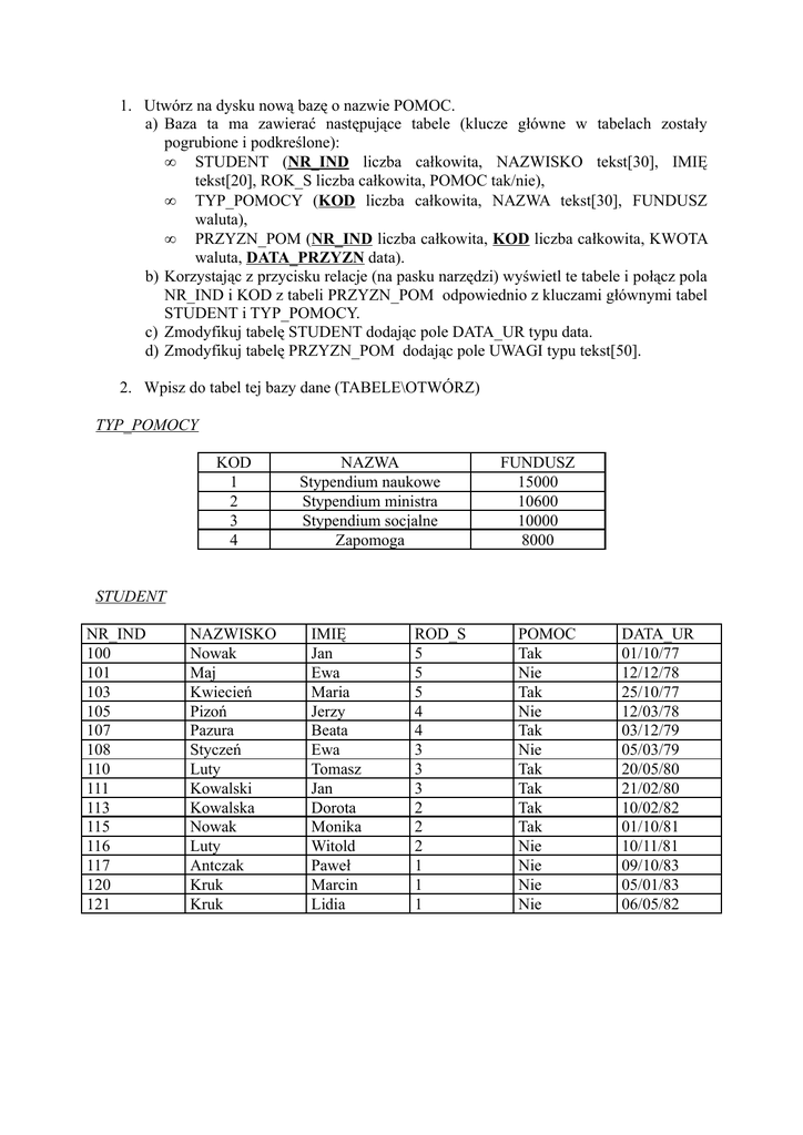 1. Utwórz na dysku nową bazę o nazwie POMOC. a) Baza ta ma zawierać następujące tabele (klucze główne w tabelach zostały pogrubione i podkreślone): • STUDENT (NR_IND liczba całkowita, NAZWISKO tekst[30], IMIĘ tekst[20], ROK_S liczba całkowita, POMOC tak/nie), • TYP_POMOCY (KOD liczba całkowita, NAZWA tekst[30], FUNDUSZ waluta), • PRZYZN_POM (NR_IND liczba całkowita, KOD liczba całkowita, KWOTA waluta, DATA_PRZYZN data). b) Korzystając z przycisku relacje (na pasku narzędzi) wyświetl te tabele i połącz pola NR_IND i KOD z tabeli PRZYZN_POM odpowiednio z kluczami głównymi tabel STUDENT i TYP_POMOCY. c) Zmodyfikuj tabelę STUDENT dodając pole DATA_UR typu data. d) Zmodyfikuj tabelę PRZYZN_POM dodając pole UWAGI typu tekst[50]. 2. Wpisz do tabel tej bazy dane (TABELE\OTWÓRZ) TYP_POMOCY KOD 1 2 3 4 NAZWA Stypendium naukowe Stypendium ministra Stypendium socjalne Zapomoga FUNDUSZ 15000 10600 10000 8000 STUDENT NR_IND 100 101 103 105 107 108 110 111 113 115 116 117 120 121 NAZWISKO Nowak Maj Kwiecień Pizoń Pazura Styczeń Luty Kowalski Kowalska Nowak Luty Antczak Kruk Kruk IMIĘ Jan Ewa Maria Jerzy Beata Ewa Tomasz Jan Dorota Monika Witold Paweł Marcin Lidia ROD_S 5 5 5 4 4 3 3 3 2 2 2 1 1 1 POMOC Tak Nie Tak Nie Tak Nie Tak Tak Tak Tak Nie Nie Nie Nie DATA_UR 01/10/77 12/12/78 25/10/77 12/03/78 03/12/79 05/03/79 20/05/80 21/02/80 10/02/82 01/10/81 10/11/81 09/10/83 05/01/83 06/05/82 PRZYZN_POMOC NR_IND 100 100 103 107 111 111 110 113 113 115 3. KOD 1 3 2 4 1 4 1 3 2 3 KWOTA 250 100 300 150 200 100 250 100 300 100 DATA_PRZYZN 5/10/02 5/10/02 5/10/02 10/10/02 10/10/02 10/10/02 10/10/02 15/10/02 15/10/02 15/10/02 Korzystając z opcji KWERENDY/WIDOK PROJEKT utwórz i wykonaj następujące kwerendy: a) Wyświetl nazwiska, imiona i rok studiów studentów, którzy otrzymali pomoc. b) Oblicz ilu studentów otrzymało pomoc. c) Oblicz kwoty, które zostały rozdzielone wśród studentów na poszczególne typy pomocy: dwie kwerendy – jedna wykorzystująca kody typów pomocy, druga – nazwy typów pomocy (ta kwerenda musi być oparta na dwóch tabelach). d) Oblicz kwotę jaką otrzymuje każdy student ze wszystkich typów pomocy i jednocześnie podaj ilość typów pomocy, z jakich student korzysta. e) Wyświetl numer indeksu, nazwisko i imię studenta oraz łączną kwotę pomocy przyznanej studentowi. f) Wyświetl pełną listę przyznanej pomocy tzn. numer indeksu, nazwisko, imię, rok studiów, nazwę przyznanej pomocy oraz jej kwotę. 4. Utwórz raport do ostatniego zapytania. 5. Zapisz plik POMOC.mdb.