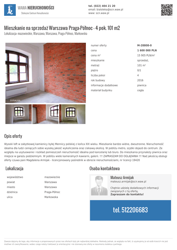 tel. (022) 404 21 20 email: [email protected] www: scn.waw.pl Mieszkanie na sprzedaż Warszawa Praga-Północ - 4 pok. 101 m2 Lokalizacja: mazowieckie, Warszawa, Warszawa, Praga-Północ, Markowska numer oferty M-28808-0 cena 1 600 000 PLN cena m 15 905 PLN/m2 mieszkanie sprzedaż, metraż 101 m2 piętro 0/1 liczba pokoi 4 rok budowy 2016 informacje dodatkowe piwnica materiał budynku cegła 2 Opis oferty Wysoki loft w zabytkowej kamienicy byłej Mennicy polskiej z końca XIX wieku. Mieszkanie bardzo widne, dwsutronne. Nieruchomość idealna dla ludzi ceniących sobie wysoką jakość wykończenia oraz ciekawą okolicę. W pobliżu metro, szybki dojazd do centrum. Ze względu na usytuowanie i rozkład pomieszczeń nieruchomość idealna pod kancelarię lub biuro. Do mieszkania przynależy piwnica oraz miejsce w garażu podziemnym. W pobliżu wiele kameralnych kawiarni, galerii. !!! ZAPRASZAM DO OGLĄDANIA !!! Nad jakością obsługi oferty czuwa pani Magdalena Armijak - licencjonowany pośrednik w obrocie nieruchomościami, nr licencji 19420 Lokalizacja Osoba kontaktowa Mateusz Armijak województwo mazowieckie powiat Warszawa [email protected] miasto Warszawa dzielnica Praga-Północ ulica Markowska Chętnie udzielę dodatkowych informacji związanych z tą ofertą. Zapraszam do kontaktu! tel. 512206683 Zawsze dążymy do tego, aby informacje o proponowanych przez nas ofertach były jak najbardziej dokładne. Niekiedy jednak, ze względu na fakt, iż uzyskujemy je od osób trzecich nie jest możliwe ich zweryfikowanie, wobec czego należy traktować je orientacyjnie i nie stanowią one oferty w rozumieniu kodeksu cywilnego.