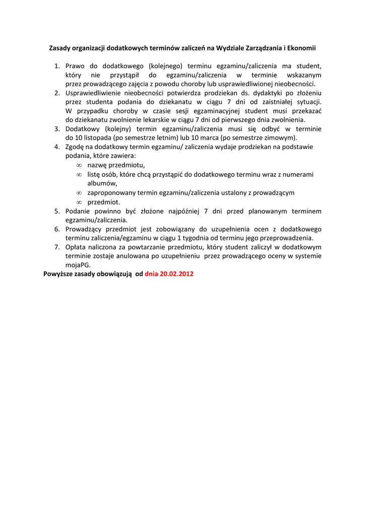 Zasady organizacji dodatkowych terminów zaliczeń na Wydziale Zarządzania i Ekonomii 1. Prawo do dodatkowego (kolejnego) terminu egzaminu/zaliczenia ma student, który nie przystąpił do egzaminu/zaliczenia w terminie wskazanym przez prowadzącego zajęcia z powodu choroby lub usprawiedliwionej nieobecności. 2. Usprawiedliwienie nieobecności potwierdza prodziekan ds. dydaktyki po złożeniu przez studenta podania do dziekanatu w ciągu 7 dni od zaistniałej sytuacji. W przypadku choroby w czasie sesji egzaminacyjnej student musi przekazać do dziekanatu zwolnienie lekarskie w ciągu 7 dni od pierwszego dnia zwolnienia. 3. Dodatkowy (kolejny) termin egzaminu/zaliczenia musi się odbyć w terminie do 10 listopada (po semestrze letnim) lub 10 marca (po semestrze zimowym). 4. Zgodę na dodatkowy termin egzaminu/ zaliczenia wydaje prodziekan na podstawie podania, które zawiera: • nazwę przedmiotu, • listę osób, które chcą przystąpić do dodatkowego terminu wraz z numerami albumów, • zaproponowany termin egzaminu/zaliczenia ustalony z prowadzącym • przedmiot. 5. Podanie powinno być złożone najpóźniej 7 dni przed planowanym terminem egzaminu/zaliczenia. 6. Prowadzący przedmiot jest zobowiązany do uzupełnienia ocen z dodatkowego terminu zaliczenia/egzaminu w ciągu 1 tygodnia od terminu jego przeprowadzenia. 7. Opłata naliczona za powtarzanie przedmiotu, który student zaliczył w dodatkowym terminie zostaje anulowana po uzupełnieniu przez prowadzącego oceny w systemie mojaPG. Powyższe zasady obowiązują od dnia 20.02.2012