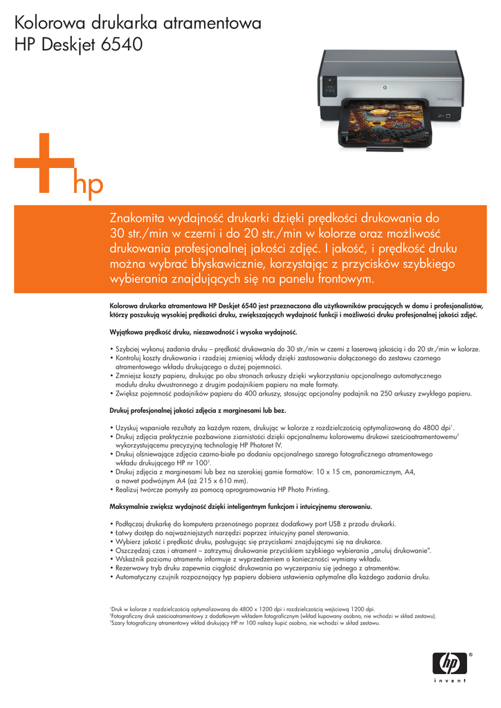 Kolorowa drukarka atramentowa HP Deskjet 6540 Znakomita wydajnoć drukarki dziki prdkoci drukowania do 30 str./min w czerni i do 20 str./min w kolorze oraz moliwoć drukowania profesjonalnej jakoci zdjć. I jakoć, i prdkoć druku mona wybrać błyskawicznie, korzystajc z przycisków szybkiego wybierania znajdujcych si na panelu frontowym. Kolorowa drukarka atramentowa HP Deskjet 6540 jest przeznaczona dla uytkowników pracujcych w domu i profesjonalistów, którzy poszukuj wysokiej prdkoci druku, zwikszajcych wydajnoć funkcji i moliwoci druku profesjonalnej jakoci zdjć. Wyjtkowa prdkoć druku, niezawodnoć i wysoka wydajnoć. • Szybciej wykonuj zadania druku – prdkoć drukowania do 30 str./min w czerni z laserow jakoci i do 20 str./min w kolorze. • Kontroluj koszty drukowania i rzadziej zmieniaj wkłady dziki zastosowaniu dołczonego do zestawu czarnego atramentowego wkładu drukujcego o duej pojemnoci. • Zmniejsz koszty papieru, drukujc po obu stronach arkuszy dziki wykorzystaniu opcjonalnego automatycznego modułu druku dwustronnego z drugim podajnikiem papieru na małe formaty. • Zwiksz pojemnoć podajników papieru do 400 arkuszy, stosujc opcjonalny podajnik na 250 arkuszy zwykłego papieru. Drukuj profesjonalnej jakoci zdjcia z marginesami lub bez. • Uzyskuj wspaniałe rezultaty za kadym razem, drukujc w kolorze z rozdzielczoci optymalizowan do 4800 dpi1. • Drukuj zdjcia praktycznie pozbawione ziarnistoci dziki opcjonalnemu kolorowemu drukowi szecioatramentowemu2 wykorzystujcemu precyzyjn technologi HP Photoret IV. • Drukuj olniewajce zdjcia czarno-białe po dodaniu opcjonalnego szarego fotograficznego atramentowego wkładu drukujcego HP nr 1003. • Drukuj zdjcia z marginesami lub bez na szerokiej gamie formatów: 10 x 15 cm, panoramicznym, A4, a nawet podwójnym A4 (a 215 x 610 mm). • Realizuj twórcze pomysły za pomoc oprogramowania HP Photo Printing. Maksymalnie zwiksz wydajnoć dziki inteligentnym funkcjom i intuicyjnemu sterowaniu. • Podłczaj drukark do komputera przenonego poprzez dodatkowy port USB z przodu drukarki. • Łatwy dostp do najwaniejszych narzdzi poprzez intuicyjny panel sterowania. • Wybierz jakoć i prdkoć druku, posługujc si przyciskami znajdujcymi si na drukarce. • Oszczdzaj czas i atrament – zatrzymuj drukowanie przyciskiem szybkiego wybierania „anuluj drukowanie”. • Wskanik poziomu atramentu informuje z wyprzedzeniem o koniecznoci wymiany wkładu. • Rezerwowy tryb druku zapewnia cigłoć drukowania po wyczerpaniu si jednego z atramentów. • Automatyczny czujnik rozpoznajcy typ papieru dobiera ustawienia optymalne dla kadego zadania druku. Druk w kolorze z rozdzielczoci optymalizowan do 4800 x 1200 dpi i rozdzielczoci wejciow 1200 dpi. Fotograficzny druk szecioatramentowy z dodatkowym wkładem fotograficznym (wkład kupowany osobno, nie wchodzi w skład zestawu). Szary fotograficzny atramentowy wkład drukujcy HP nr 100 naley kupić osobno, nie wchodzi w skład zestawu. 1 2 3 Dane techniczne Numery katalogowe HP Technologia druku Technologia termiczna HP Inkjet Dysze drukujce 672 dysze do druku w czerni, 600 dysz do druku w kolorze, 600 dysz do druku fotograficznego (opcjonalnie) Prdkoć druku (Do # str./min) (Do # str./min) (Od # sekund) Typ dokumentu Czarny tekst (A4) Tekst łczony z kolorow grafik (A4) Kolorowa fotografia 10 x 15 cm (papier fotograficzny) Jakoć druku W czerni: rozdzielczoć w czerni do 1200 dpi W kolorze: druk w kolorze z rozdzielczoci optymalizowan do 4800 x 1200 dpi i rozdzielczoci wejciow 1200 dpi Tryb draft 30 20 27 Tryb fast normal 11,6 7,4 33 Tryb normal 9,8 5,7 50 Tryb best 2,1 2,1 96 Zaley od rodzaju dokumentu i trybu drukowania. Technologia koloru HP Photoret III (HP Photoret IV z opcjonalnym wkładem fotograficznym) Obsługiwane systemy operacyjne Microsoft® Windows® 98, 98 SE, Me, 2000 Professional, XP; Mac OS 9.1 i 9.2.2; Mac OS X 10.1.5, 10.2.3, 10.3.x Minimalne wymagania systemowe Dla wszystkich systemów: napd CD-ROM; wolny port USB; zalecany dostp do Internetu i karta dwikowa; monitor SVGA 800 x 600 z 16-bitow głbi koloru Dla komputerów PC: Intel® Pentium® II lub równorzdny; Microsoft® Windows® 98, 98 SE, Me, 2000 Professional lub XP; 64 MB pamici RAM dla Microsoft Windows 98, 98 SE, Me, 2000; 128 MB pamici RAM dla Microsoft Windows XP; 100 MB wolnego miejsca na twardym dysku do instalacji oprogramowania; Microsoft Internet Explorer® od wersji 5 (systemy Windows 3.1, 95, NT 4.0 i DOS nie s obsługiwane) Dla komputerów Macintosh: procesor G3; Mac OS 9.1 i 9.2.2, OS X 10.1.5, 10.2.3 lub 10.3.x; 128 MB pamici RAM; 75 MB wolnego miejsca na twardym dysku do instalacji oprogramowania (systemy Mac OS 9.0 i wczeniejsze oraz OS X 10.2, 10.2.1 i 10.2.2 nie s obsługiwane) Pamić 16 MB Jzyki drukowania Rozszerzony HP PCL Level 3 Czcionki C8963B Kolorowa drukarka atramentowa HP Deskjet 6540, czarny atramentowy wkład drukujcy HP nr 339 (21 ml), trójkolorowy atramentowy wkład drukujcy HP nr 344 (14 ml), oprogramowanie HP Photo Printing (tylko dla Windows®), oprogramowanie drukarki i przewodnik uytkownika na płycie CD-ROM, arkusz instalacyjny, podrczny przewodnik, zasilacz i przewód zasilajcy Kable C6518A Kabel HP USB, 2 m Materiały eksploatacyjne C9363EE Trójkolorowy atramentowy wkład drukujcy HP nr 344 (14 ml) C8766EE Trójkolorowy atramentowy wkład drukujcy HP nr 343 (7 ml) C8767EE Czarny atramentowy wkład drukujcy HP nr 339 (21 ml) 8 wbudowanych, po 4 w pionowym i poziomym układzie strony: CG Times, CG Times Italic; Univers, Univers Italic; Courier, Courier Italic; Letter Gothic, Letter Gothic Italic C8765EE Czarny atramentowy wkład drukujcy HP nr 338 (11 ml) Ustawianie wkładów ±0,06 mm Normatywny cykl pracy Do 5000 stron miesicznie C9369EE Fotograficzny atramentowy wkład drukujcy HP nr 348 (13 ml) Zalecana gramatura noników Papiery HP o gramaturze do 280g/m2 C9368AE Zalecane noniki Papier: A4 210 x 297 mm, A5 148 x 210 mm, B5 182 x 257 mm, banner: A4 210 x 297
