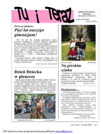 gazetka informacyjno-kulturalna Gimnazjum w Skrobowie wydanie XIX/2004 czerwiec 2004 r. Pierwszy jubileusz Pięć lat naszego gimnazjum! Ten rok jest dla naszego gimnazjum ważny, ponieważ obchodzimy skromny jubileusz pięciolecia istnienia szkoły. Główne uroczystości odbędą się 24 czerwca. Zaszczycą nas swoją obecnością szanowni goście z różnych szkół powiatu. Chcąc zaprezentować nasze sukcesy i osiągnięcia zorganizujemy wystawę, prezentację i występy artystyczne. Uroczystość ta zbiegła się w czasie z tradycyjnym pożegnaniem absolwentów. Uroczystej oprawy całej imprezie dodaje fakt, iż zostali zaproszeni rodzice uczniów wyróżniających się w nauce i zachowaniu. Sylwia Szymczak , Joanna Pożak Dzień Dziecka w plenerze Tegoroczne obchody Dnia Dziecka odbyły się poza szkołą. Wspólnie pojechaliśmy do Firleja by tam, w plenerze, spędzić miło czas. Była to okazja do integracji międzyklasowej. Ładna pogoda umożliwiła nam gry i zabawy na powietrzu, ale o kąpieli nie było mowy. Wspólny wypad zakończył się pieczeniem kiełbaski nad ogniskiem. Redakcja Kiełbaski były pyszne Gory som pikne (fot.E.Zyga) Na górskim szlaku Czerwiec to miesiąc wprost wymarzony na organizację wycieczek. W naszej szkole postanowiliśmy wykorzystać. Dnia 14 czerwca o 6. rano (!), uczniowie, którzy poczuli zew natury, stawili się przed szkołą i czekali na autokar. (ciąg dalszy na str.2) Dziękujemy.... W imieniu całej redakcji „Tu i Teraz” pragnę gorąco podziękować wszystkim, którzy wspierali nas w pracy nad gazetką. Szczególne podziękowania chciałabym złożyć pani Jolancie Libich. Dziękujemy pani Jolu za stworzenie gazetki i za opiekę nad nią oraz za serce, które zawsze stało dla nas otworem. Jako redaktor naczelna pragnę także podziękować moim współpracownikom za wytrwałość oraz konsekwencję. Dziękuję za te wspólne dwa lata, które na zawsze pozostaną w mojej pamięci. Dziękuję, bo bez Was nigdy by się to nie udało.... Aneta Kanadys – redaktor naczelna „Tu i Teraz” (fot.R.Latoch) „Tu i Teraz” nr XIX/2004 PDF stworzony przez wersję demonstracyjną pdfFactory www.pdffactory.pl/ str.1 Na górskim szlaku (dokończenie ze str.1) Wspólnie z uczniami podstawówki postanowili oni wyjechać na czterodniową wycieczkę w góry. Naszym opiekunem była pani Małgorzata Kaczor. Tempo było dobre (fot.H.Libich) Rowerowy zlot Chwila odpoczynku (fot.E.Zyga) Chociaż przed wyjazdem prognoza pogody była niekorzystna, bo zapowiadano ochłodzenie i deszcz, to słonce opanowało niebo, my już taką aurę potrafiliśmy wykorzystać. Zwiedziliśmy Ojcowski Park Narodowy, Morskie Oko i Gubałówkę. Nawet deszcz nie zniechęciłby nas do wyprawy na górskie szlaki. Dzień w dzień, jak wytrwali wędrowcy, zakładaliśmy niezawodne traperki i ruszaliśmy po kolejną przygodę. Każdego wieczoru wracaliśmy zmęczeni , ale bardzo szczęśliwi, że udało się nam zrealizować turystyczne plany. Góry, górami, ale nie można zapomnieć o prezentach dla rodzinki. Co chwila napotykaliśmy się na stragany z oscypkami, owczymi skórami czy drewnianymi figurkami. Nasze plecaki zapełniały się pamiątkami. Wieczorem, 17 czerwca około godziny 22., radośnie powitali nas rodzice oczekujący na nas przed szkołą. Na zakończenie pokuszę się o krótkie stwierdzenie -wyjeżdżajcie w góry!!! Ewa Zyga Żurawiniec to mała, spokojna miejscowość w gminie Ostrówek, gościła rowerzystów w dniach 17-19 czerwca br. na IV Powiatowym Zlocie Szkolnych Kół Turystycznych Powiatu Lubartowskiego. Każdy prawdziwy biwak rozpoczyna się rozbiciem namiotów co również stało się naszym udziałem. Pole biwakowe szybko zapełniło się gimnazjalistami z Łucki, Lubartowa i Skrobowa. Drugi dzień zlotu obfitował w różnorodne zawody rekreacyjno-sportowe. Wśród nas Marcin Siwek, Kuba Mazur otrzymali nagrody, a Bartosz Mitura wygrał ogólna punktację współzawodnictwa. Wieczory spędzaliśmy przy ognisku, słuchaliśmy gry na gitarze pana Janusza Gieracha i pana Henryka Libicha. Nasz opiekun wykonał wakacyjny przebój „Małe pieski dwa”. W dobrych humorach wróciliśmy do domów, zabierając ze sobą miłe wspomnienia niezapomnianych chwil w Żurawińcu. Do zobaczenia za rok. Ula Topyła, Karolina Ludwiczuk i Kasi Kutnik Odprawa zawodników przed konkursem jazdy slalomem (fot.H.Libich) Str.2 „Tu i Teraz” nr XIX/2004 PDF stworzony przez wersję demonstracyjną pdfFactory www.pdffactory.pl/ Czas pożegnań To już dwa lata „Tu i Teraz”! Pewnego pięknego kwietniowego dnia 2002 roku duża grupa uczniów naszego gimnazjum z panią Jolantą Libich na czele zebrała się w jednej z klas lekcyjnych, by złożyć pierwszy numer Zespół redakcyjny z opiekunem (fot.H.Libich) szkolnej gazetki. Po burzliwych obradach gazetce nadano tytuł, który nosi do dziś - „Tu i Teraz” oraz wybrano skład redakcyjny. Redaktorem naczelnym zostałam ja, a moim zastępcą Karolina Lis. Jeśli ktoś myśli, że redagowanie gazetek jest łatwe, muszę go w tym momencie rozczarować. Każdy numer to oddzielna historia naszych odczuć oraz starań, jednak ten pierwszy to był dla nas wielki egzamin. Ponieważ nikt z naszego grona nie miał doświadczenia w takiej pracy, więc można sobie tylko wyobrazić co czuliśmy. Mieszanina zdenerwowania, strachu przed nie zaakceptowaniem oraz obawa, że nie sprawdzimy się w roli dziennikarzy, to emocje, które towarzyszyły nam przy składaniu pierwszego numeru. Nie chciałabym jednak, aby przyszli redaktorzy, po lekturze poprzedniego zdania zrezygnowali z pracy w „Tu i Teraz”. Nie bójcie się!!!! Praca w gazetce to także spora dawka radości, szczęścia, humoru oraz dumy, że to właśnie Ty,a nie twój kolega- jesteś w tym zespole. Starałam się po prostu przedstawić tę pracę nie tylko z tej dobrej strony, ale chciałam byście mieli pełny obraz tego zajęcia. Bo w „Tu i Teraz” jest jak 