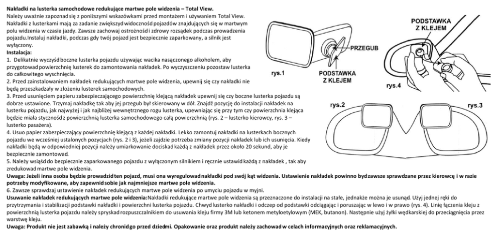 Nakładki na lusterka samochodowe redukujące martwe pole widzenia – Total View. Należy uważnie zapoznad się z poniższymi wskazówkami przed montażem i używaniem Total View. Nakładki z lusterkami mają za zadanie zwiększyd widocznośd pojazdów znajdujących się w martwym polu widzenia w czasie jazdy. Zawsze zachowaj ostrożnośd i zdrowy rozsądek podczas prowadzenia pojazdu.Instaluj nakładki, podczas gdy twój pojazd jest bezpiecznie zaparkowany, a silnik jest wyłączony. Instalacja: 1. Delikatnie wyczyśd boczne lusterka pojazdu używając wacika nasączonego alkoholem, aby przygotowad powierzchnię lusterek do zamontowania nakładek. Po wyczyszczeniu pozostaw lusterka do całkowitego wyschnięcia. 2. Przed zainstalowaniem nakładek redukujących martwe pole widzenia, upewnij się czy nakładki nie będą przeszkadzały w złożeniu lusterek samochodowych. 3. Przed usunięciem papieru zabezpieczającego powierzchnię klejącą nakładek upewnij się czy boczne lusterka pojazdu są dobrze ustawione. Trzymaj nakładkę tak aby jej przegub był skierowany w dół. Znajdź pozycję do instalacji nakładek na lusterku pojazdu, jak najwyżej i jak najbliżej wewnętrznego rogu lusterka, upewniając się przy tym czy powierzchnia klejąca będzie miała stycznośd z powierzchnią lusterka samochodowego całą powierzchnią (rys. 2 – lusterko kierowcy, rys. 3 – lusterko pasażera). 4. Usuo papier zabezpieczający powierzchnię klejącą z każdej nakładki. Lekko zamontuj nakładki na lusterkach bocznych pojazdu we wcześniej ustalonych pozycjach (rys. 2 i 3), jeżeli zajdzie potrzeba zmiany pozycji nakładek lub ich usunięcia. Kiedy nakładki będą w odpowiedniej pozycji należy umiarkowanie dociskad każdą z nakładek przez około 20 sekund, aby je bezpiecznie zamontowad. 5. Należy wsiąśd do bezpiecznie zaparkowanego pojazdu z wyłączonym silnikiem i ręcznie ustawid każdą z nakładek , tak aby zredukowad martwe pole widzenia. Uwaga: Jeżeli inna osoba będzie prowadzid ten pojazd, musi ona wyregulowad nakładki pod swój kąt widzenia. Ustawienie nakładek powinno byd zawsze sprawdzane przez kierowcę i w razie potrzeby modyfikowane, aby zapewnid sobie jak najmniejsze martwe pole widzenia. 6. Zawsze sprawdzaj ustawienie nakładek redukujących martwe pole widzenia po umyciu pojazdu w myjni. Usuwanie nakładek redukujących martwe pole widzenia:Nakładki redukujące martwe pole widzenia są przeznaczone do instalacji na stałe, jednakże można je usunąd. Użyj jednej ręki do przytrzymania i stabilizacji podstawki nakładki i powierzchni lusterka pojazdu. Chwyd lusterko nakładki i odczep od podstawki odciągając i poruszając w lewo i w prawo (rys. 4). Linię łączenia kleju z powierzchnią lusterka pojazdu należy spryskad rozpuszczalnikiem do usuwania kleju firmy 3M lub ketonem metyloetylowym (MEK, butanon). Następnie użyj żyłki wędkarskiej do przeciągnięcia przez warstwę kleju. Uwaga: Produkt nie jest zabawką i należy chronid go przed dziedmi. Opakowanie oraz produkt należy zachowad w celach informacyjnych oraz reklamacyjnych.