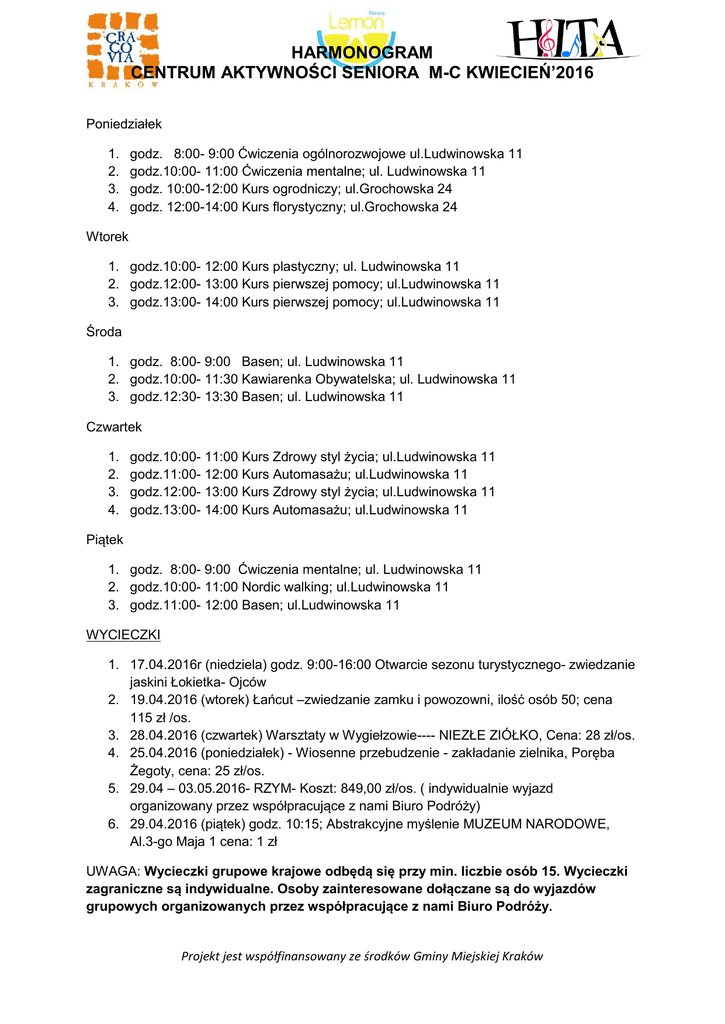 HARMONOGRAM CENTRUM AKTYWNOŚCI SENIORA M-C KWIECIEŃ’2016 Poniedziałek 1. 2. 3. 4. godz. 8:00- 9:00 Ćwiczenia ogólnorozwojowe ul.Ludwinowska 11 godz.10:00- 11:00 Ćwiczenia mentalne; ul. Ludwinowska 11 godz. 10:00-12:00 Kurs ogrodniczy; ul.Grochowska 24 godz. 12:00-14:00 Kurs florystyczny; ul.Grochowska 24 Wtorek 1. godz.10:00- 12:00 Kurs plastyczny; ul. Ludwinowska 11 2. godz.12:00- 13:00 Kurs pierwszej pomocy; ul.Ludwinowska 11 3. godz.13:00- 14:00 Kurs pierwszej pomocy; ul.Ludwinowska 11 Środa 1. godz. 8:00- 9:00 Basen; ul. Ludwinowska 11 2. godz.10:00- 11:30 Kawiarenka Obywatelska; ul. Ludwinowska 11 3. godz.12:30- 13:30 Basen; ul. Ludwinowska 11 Czwartek 1. 2. 3. 4. godz.10:00- 11:00 Kurs Zdrowy styl życia; ul.Ludwinowska 11 godz.11:00- 12:00 Kurs Automasażu; ul.Ludwinowska 11 godz.12:00- 13:00 Kurs Zdrowy styl życia; ul.Ludwinowska 11 godz.13:00- 14:00 Kurs Automasażu; ul.Ludwinowska 11 Piątek 1. godz. 8:00- 9:00 Ćwiczenia mentalne; ul. Ludwinowska 11 2. godz.10:00- 11:00 Nordic walking; ul.Ludwinowska 11 3. godz.11:00- 12:00 Basen; ul.Ludwinowska 11 WYCIECZKI 1. 17.04.2016r (niedziela) godz. 9:00-16:00 Otwarcie sezonu turystycznego- zwiedzanie jaskini Łokietka- Ojców 2. 19.04.2016 (wtorek) Łańcut –zwiedzanie zamku i powozowni, ilość osób 50; cena 115 zł /os. 3. 28.04.2016 (czwartek) Warsztaty w Wygiełzowie---- NIEZŁE ZIÓŁKO, Cena: 28 zł/os. 4. 25.04.2016 (poniedziałek) - Wiosenne przebudzenie - zakładanie zielnika, Poręba Żegoty, cena: 25 zł/os. 5. 29.04 – 03.05.2016- RZYM- Koszt: 849,00 zł/os. ( indywidualnie wyjazd organizowany przez współpracujące z nami Biuro Podróży) 6. 29.04.2016 (piątek) godz. 10:15; Abstrakcyjne myślenie MUZEUM NARODOWE, Al.3-go Maja 1 cena: 1 zł UWAGA: Wycieczki grupowe krajowe odbędą się przy min. liczbie osób 15. Wycieczki zagraniczne są indywidualne. Osoby zainteresowane dołączane są do wyjazdów grupowych organizowanych przez współpracujące z nami Biuro Podróży. Projekt jest współfinansowany ze środków Gminy Miejskiej Kraków