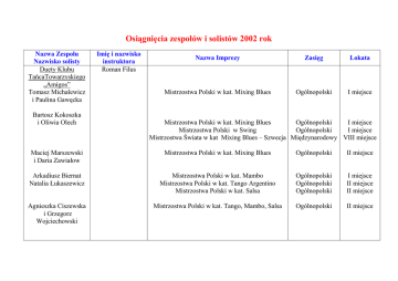 Osiągnięcia zespołów i solistów 2002 rok Nazwa Zespołu Nazwisko solisty Duety Klubu TańcaTowarzyskiego „Amigos” Tomasz Michalewicz i Paulina Gawęcka Bartosz Kokoszka i Oliwia Olech Imię i nazwisko instruktora Roman Filus Nazwa Imprezy Zasięg Lokata Mistrzostwa Polski w kat. Mixing Blues Ogólnopolski I miejsce Mistrzostwa Polski w kat. Mixing Blues Ogólnopolski I miejsce Mistrzostwa Polski w Swing Ogólnopolski I miejsce Mistrzostwa Świata w kat Mixing Blues – Szwecja Międzynarodowy VIII miejsce Maciej Marszewski i Daria Zawiałow Mistrzostwa Polski w kat. Mixing Blues Ogólnopolski II miejsce Arkadiusz Biernat Natalia Łukaszewicz Mistrzostwa Polski w kat. Mambo Mistrzostwa Polski w kat. Tango Argentino Mistrzostwa Polski w kat. Salsa Ogólnopolski Ogólnopolski Ogólnopolski I miejsce II miejsce II miejsce Agnieszka Ciszewska i Grzegorz Wojciechowski Mistrzostwa Polski w kat. Tango, Mambo, Salsa Ogólnopolski II miejsce Zespół Piosenki i Tańca „Re-Ge-De” Krystyna Szulęcka XXIII Międzynarodowy Festiwal Piosenki i Tańca Międzynarodowy Aplauzw Koninie wyróŜnienie Ogólnopolski Festiwal Zespołów Tanecznych Dzieci i MłodzieŜy w Gorzowie Wlkp. Dziecięcy Międzynarodowy Festiwal Piosenki i Tańca VESPREM- Węgry Joanna Chyba Krystyna Szulęcka Dziecięcy Międzynarodowy Festiwal Piosenki i Tańca VESPREM- Węgry Wojewódzki Przegląd Solistów Wokalistów Ogólnopolski Konkurs Piosenki Dziecięcej Stargard Szczeciński Ogólnopolski I miejsce Międzynarodowy wyróŜnienie Międzynarodowy wyróŜnienie Regionalny Ogólnopolski II miejsce III miejsce Karolina Prostacka wyróŜnienie Zespół Wokalny „Re-Ge-De” III miejsce Monika Sobczak Estera Węcławek Alicja BroŜyna Magdalena BroŜyna Beata Wąsowicz II Konkurs Ekologiczny „Ja i moje środowisko” Regionalny Karolina Prostacka Krystyna Szulęcka Konkurs Piosenki Ekologicznej Regionalny II miejsce II miejsce II miejsce Nagroda LOP I miejsce I i II Runda Kartingowych Mistrzostw Strefy Północnej w Poznaniu II Runda Kartingowych Mistrzostw Strefy Północnej w Radomiu Ogólnopolski III miejsce VIII miejsce VI miejsce Michał Krauzowicz Łukasz Krauzowicz Daniel Walaszewski II i IV Runda Kartingowych Mistrzostw Strefy Północnej w Szczecinie Ogólnopolski IV miejsce V miejsce VIII miejsce Michał Krauzowicz Łukasz Krauzowicz Puchar Prezesa Polskiego Związku Motorowego w Bydgoszczy Michał Krauzowicz Damian Walaszewski Łukasz Krauzowicz Adam Marszałek I miejsce IV miejsce Wiktor Tuligłowski ElŜbieta Wiśniewska XIV Przegląd Twórczości Plastycznej „Koszalin i okolice” Regionalny Nagroda za zestaw prac Kabaret „Papucie” Aleksandra Dzięcielska II Przegląd Kabaretów Szkolnych pod patronatem Kabaretu KOŃ POLSKI Makroregionalny II miejsce Estera Węcławek Ewa Nawrocka I Ogólnopolski Konkurs Fotografii „Człowiek, Świat, Przyroda Ogólnopolski wyróŜnienie Irena Nowogrodzka Solista BREAK DANCE Piotr Madera Iwona Potomska nagroda ZM LOP i specjalna PGK Ogólnopolski Konkurs Tańca w Bydgoszczy I miejsce Ogólnopolski Ogólnopolski Konkurs Tańca „Rytm Ulicy” – Piła I miejsce Mistrzostwa Świata w kat.Break Dance - Essen Międzynarodowy IV miejsce Trio Break Dance Iwona Potomska Ogólnopolski Konkurs Tańca w Toruniu Regionalny V miejsce Anna Kramarz ElŜbieta MalczewskiGiemza I Ogólnopolski Konkurs Sztuki Recytatorskiej im. Skamandrytów – Połczyn Zdrój Ogólnopolski wyróŜnienie I stopnia Michał Krauzowicz Łukasz Krauzowicz Adam Marszałek III Runda Mistrzostw Polski Grupa B Ogólnopolski IV miejsce VIII miejsce Mistrzostwa Strefy Północnej w Poznaniu Ogólnopolski V miejsce III miejsce VII miejsce V Ogólnopolski Konkurs „BliŜej Gitary” Ogólnopolski II miejsce Muzykorama Regionalny wyróŜnienie Daniel Walaszkiewicz Michał Krauzowicz Daniel Walaszkiewicz Kwartet Gitarowy Magdalena Jackowska Duet gitarowy: Alina BroŜyńska i Paweł Jackowski Zbigniew Dubiella wyróŜnienie