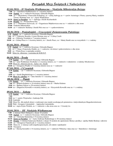 Porządek Mszy Świętych i Nabożeństw 03.04.2016 – II Niedziela Wielkanocna – Niedziela Miłosierdzia Bożego 7.00 za + Zdzisława Kiełbusiewicz w 1 rocznicę śmierci 9.00 Szpital: za ++ rodziców Krystynę i Edwarda Bogusz 9.00 za ++ Bronisławę i Franciszka Kołodziej, za + córkę Jadwigę za ++ synów Antoniego i Piotra, synową Marię, wnuków Teresę i Romana oraz za + zięcia Władysława 10.30 Suma za Parafian: za ++ Jadwigę i Józefa Kucharskich 11.00 Krypta: .za + Przemysława Koj 12.00 za ++ Stanisława Szewczyk, za + Eugeniusza Miętkiewicza oraz za ++ rodziców z obu stron 15.00 Godzina Miłosierdzia 16.00 za ++ rodziców Stefanię i Józefa Pelc oraz za ++ z pokrewieństwa 04.04.2016 – Poniedziałek – Uroczystość Zwiastowania Pańskiego 6.30 7.00 8.00 18.00 Szpital: za ++ rodziców Krystynę i Edwarda Bogusz za ++ rodziców Rozalię i Leona Herman oraz za + Celinę Czech za + Wiktorię Trzońską w 7 rocznicę śmierci za + Zelmę Pracz w 1 rocznicę śmierci, za + Józefa Pracz, za + Marię Stanik oraz za wszystkich ++ z rodziny 05.04.2016 –Wtorek 6.30 7.00 8.00 18.00 Szpital: za ++ rodziców Krystynę i Edwarda Bogusz za ++ Annę i Franciszka Dudek, za ++ rodziców, ich dzieci i pokrewieństwo z obu stron za + Piotra Kusz w pamiątkę urodzin Msza św. zbiorowa i nowenna do M.B.N.P. 06.04.2016 – Środa 6.30 7.00 8.00 18.00 Szpital: - za ++ rodziców Krystynę i Edwarda Bogusz za + syna Waldemara Swoboda w 2 rocznicę śmierci, za ++ rodziców i rodzeństwo z rodziny Miszkiewicz Msza św. zbiorowa do św. Jacka i św. Józefa za + Grzegorza Prudło w 5 rocznicę śmierci oraz za ++ rodziców 07.04.2016 – I Czwartek 6.30 Szpital: - za ++ rodziców Krystynę i Edwarda Bogusz 7.00 8.00 za + Józefa Bogdańskiego w 1 rocznicę śmierci 17.00 Msza św. szkolna: za + Jana Janecko w 1 rocznicę śmierci 08.04.2016 - Piątek 6.30 Szpital: - za ++ rodziców Krystynę i Edwarda Bogusz 7.00 za + Roberta Kalarus w 10 rocznicę śmierci oraz za + Marka Kalarus 8.00 za + Barbarę Sykosz w 20 rocznicę śmierci 18.00 za + Zbigniewa Kowalik w rocznicę śmierci, za + Krzysztofa Kowalik oraz za ++ z rodziny 09.04.2016 – Sobota 6.30 7.00 8.00 8.30 9.00 14.00 18.00 Szpital: - za ++ rodziców Krystynę i Edwarda Bogusz za ++ synów Wojciecha i Andrzeja Żak Godzinki Msza Św. dla małych dzieci z rodzicami oraz matek oczekujących potomstwa z indywidualnym błogosławieństwem Ślub : Grzegorz Lutostański – Agnieszka Lutostańska za + męża Eryka Wolnik, za ++ rodziców z obu stron oraz za + Urszulę Lis 10.04.2016 – III Niedziela Wielkanocna 7.00 9.00 9.00 10.30 11.00 12.00 15.00 15.30 16.00 w intencji Marii Hołojuch z okazji 18 urodzin Szpital: za ++ rodziców Krystynę i Edwarda Bogusz za + Gertrudę Muskalską w 9 rocznicę śmierci Suma za Parafian: za + męża Andrzeja Rudnickiego w 28 rocznicę śmierci Krypta: w intencji Katarzyna Rodzeń z okazji 18 urodzin do opatrzności Bożej z prośbą o opiekę Matki Boskiej i zdrowie za + Grzegorza Franielczyk w 1 rocznicę śmierci Msza św. w intencji osób niepełnosprawnych, ich rodzin i opiekunów Nieszpory za + Dorotę Kowalik w 14 rocznicę śmierci, za ++ rodziców Wiktorię i Jana oraz za + Stanisława i Antoniego