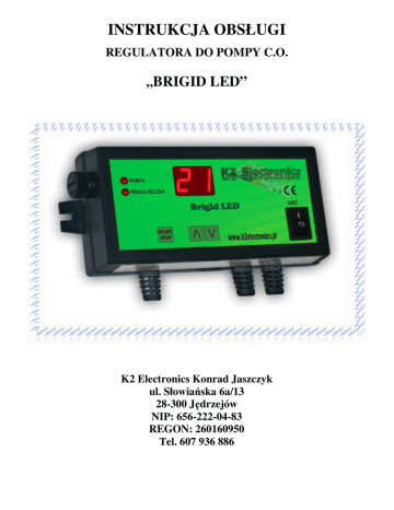 INSTRUKCJA OBSŁUGI REGULATORA DO POMPY C.O. „BRIGID LED” K2 Electronics Konrad Jaszczyk ul. Słowiańska 6a/13 28-300 Jędrzejów NIP: 656-222-04-83 REGON: 260160950 Tel. 607 936 886 Deklaracja zgodności nr 1/2007 My, firma K2 Electronics, ul. Słowiańska 6a/13, 28-300 Jędrzejów, deklarujemy z pełną odpowiedzialnością, że produkowany przez nas regulator „BRIGID LED” 230V, 50Hz spełnia wymagania Rozporządzenia Ministra Gospodarki Pracy i Polityki Społecznej. (Dz.U.03.49.414) z dnia 12 marca 2003 roku, wdrażającego postanowienia Dyrektywy Niskonapięciowej (LVD) 2006/95/WE, oraz Rozporządzenia Ministra Infrastruktury (Dz.U.03.90.848) z dnia 02.04.2003r wdrażającego postanowienia dyrektywy EMC 89/336/EWG. Sterownik „BRIGID LED” przeszedł pozytywnie badania kompatybilności EMC przy podłączeniu optymalnych obciążeń. Do ocen zgodności zastosowano normy zharmonizowane PN-EN 60730-2-1:2002. Wyrób oznaczono CE po raz pierwszy 01.10.2007. Właściciel: Konrad Jaszczyk Jędrzejów 01.10.2007 UWAGA! URZĄDZENIE ELEKTRYCZNE POD NAPIĘCIEM! Przed dokonaniem jakichkolwiek czynności związanych z zasilaniem (podłączanie przewodów, instalacja urządzenia, itp.) należy upewnić się, że regulator nie jest podłączony do sieci! Montażu powinna dokonać osoba posiadająca odpowiednie uprawnienia elektryczne Przed uruchomieniem sterownika należy dokonać pomiaru skuteczności zerowania silników elektrycznych, kotła ,oraz pomiaru izolacji przewodów elektrycznych. ZASADA DZIAŁANIA Mikroprocesorowy regulator „ BRIGID LED ” przeznaczony jest do sterowania pompą obiegu wody w kotłach na paliwa stałe w otwartych instalacjach C.O. Jego zadanie polega na załączeniu pompy C.O. gdy na kotle zostanie osiągnięta temp. zadana przez użytkownika oraz wyłączeniu pompy gdy temp. spadnie 2*C poniżej temp. zadanej. Regulator zapobiega niepotrzebnemu działaniu pompy co pozwala zaoszczędzić zużycie energii elektrycznej (oszczędności w zależności od stopnia wykorzystania kotła mogą sięgać nawet do 60%) oraz wydłuża żywotność pompy zapobiegając jej zbędnemu działaniu. OPIS FUNKCJI STEROWNIKA Ustawianie temp. zadanej Jest to temp. przy której następuje załączenie pompy C.O. Zmiany dokonujemy naciskając przyciski lub . Po zadeklarowaniu temp. po około 4 sekundach na wyświetlaczu pojawi się temperatura jaka jest aktualnie na kotle gdy sterownik osiągnie temp. zadaną pompa zostanie automatycznie załączona co zasygnalizuje dioda z opisem POMPA. Uwaga! Jeżeli kocioł nie jest wyposażony w rurkę, w której można umieścić czujnik to należy go umieścić na rurze wychodzącej z kotła możliwie jak najbliżej pieca w celu jak najdokładniejszego odwzorowania temp. na kotle (sposób mocowania czujnika przedstawiony jest w rozdziale montaż regulatora). Praca ręczna Sterownik wyposażony jest w dodatkowy przycisk [START/STOP]. Naciśnięcie przycisku umożliwia ręczne załączenie pompy co sygnalizuje dioda z opisem PRACA RĘCZNA oraz POMPA ponowne naciśnięcie przycisku powoduje wyłączenie pracy ręcznej i przejście sterownika w stan pracy automatycznej. Histereza Wartość histerezy wynosi 2*C. Funkcja ta zapobiega ciągłemu załączaniu i wyłączaniu się pompy w przypadku gdy temp. będzie się wahać np. pomiędzy 30*C, a 29*C. Histereza jest to różnica pomiędzy temperaturą zadaną, a temperaturą wyłączenia pompy. np.: gdy temperatura zadana ma wartość 30*C to wyłączenie nastąpi przy temp. 28*C (zawsze 2*C poniżej temp. zadanej). ZABEZPIECZENIA Regulator wyposażony jest w zabezpieczenia przed przegrzaniem kotła, które sygnalizowane są na wyświetlaczu LED oraz dźwiękowo: c1 - sygnalizuje przekroczenie temperatury 90*C na kotle, c2 - sygnalizuje uszkodzenie czujnika temperatury W przypadku wystąpienia alarmu c1 nie należy wyłączać sterownika ponieważ spowoduje to wyłączenie pompy obiegowej. Alarm dźwiękowy wyłączamy naciskając klawisz [START/STOP]. W przypadku błędu c2 należy skontaktować się z serwisem. DODATKOWE FUNKCJE Anty stop funkcja ta zapobiega zatarciu pompy w sezonie letnim gdy jest ona nieużywana. Regulator co 10 dni załącza pompę na 1 minutę Anty zamarzanie zapobiega zamarznięciu wody w instalacji C.O. załączając pompę poniżej 5*C. Sygnalizacja dźwiękowa – po przekroczeniu temp. 90*C załącza się alarm. W każdym przypadku aby funkcje te były aktywne załącznik SIEĆ musi być załączony na pozycję „1”. KONSERWACJA Przed sezonem grzewczym i w czasie jego trwania należy sprawdzić stan techniczny przewodów, mocowania oraz oczyścić sterownik z kurzu i innych zanieczyszczeń. Należy również dokonać pomiaru uziemienia silnika pompy. UWAGA! URZĄDZENIE ELEKTRYCZNE POD NAPIĘCIEM! Przed dokonaniem jakichkolwiek czynności związanych z zasilaniem (podłączanie przewodów, instalacja urządzenia, itp.) należy upewnić się, że regulator nie jest podłączony do sieci! Montażu powinna dokonać osoba posiadająca odpowiednie uprawnienia elektryczne! Nie wolno stosować żadnych zaworów zamykających obieg wody centralnego ogrzewania. Regulator nie może pracować w układzie zamkniętym centralnego ogrzewania. Muszą być zamontowane zawory bezpieczeństwa, zawory ciśnieniowe, zbiornik wyrównawczy, zabezpieczające kocioł przed zagotowaniem wody w układzie centralnego ogrzewania. Sterownik musi być podłączony do gniazdka z uziemieniem (instalacja w układzie TN-S). W trakcie podłączania sterownika należy dokonać pomiaru skuteczności uziemienia. Kable nie mogą być narażone na działanie temperatur powyżej 80*C. Należy je odizolować od elementów pieca nagrzewających się do wysokich temperatur! MONTAŻ REGULATORA Schemat połączeń Mocowanie czujnika Czujnik należy umieścić tak by jak najdokładniej odwzorował temp. na kotle. Gdy kocioł nie jest wyposażony w rurkę na czujnik to należy zamocować go na głównej rurze wycho