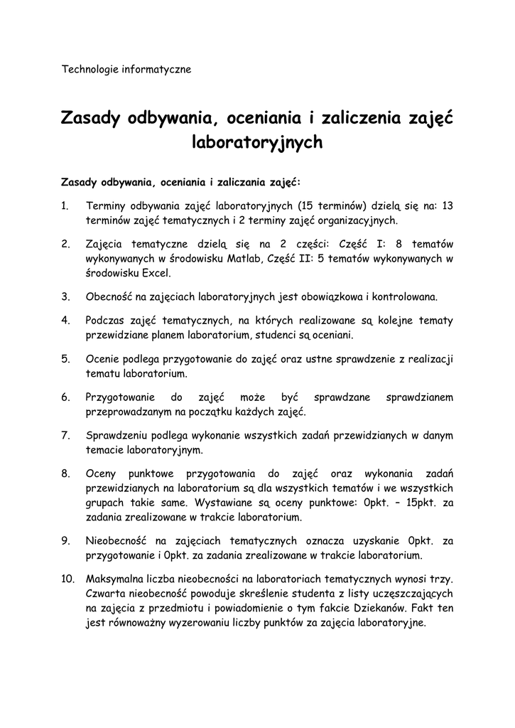 Technologie informatyczne Zasady odbywania, oceniania i zaliczenia zajęć laboratoryjnych Zasady odbywania, oceniania i zaliczania zajęć: 1. Terminy odbywania zajęć laboratoryjnych (15 terminów) dzielą się na: 13 terminów zajęć tematycznych i 2 terminy zajęć organizacyjnych. 2. Zajęcia tematyczne dzielą się na 2 części: Część I: 8 tematów wykonywanych w środowisku Matlab, Część II: 5 tematów wykonywanych w środowisku Excel. 3. Obecność na zajęciach laboratoryjnych jest obowiązkowa i kontrolowana. 4. Podczas zajęć tematycznych, na których realizowane są kolejne tematy przewidziane planem laboratorium, studenci są oceniani. 5. Ocenie podlega przygotowanie do zajęć oraz ustne sprawdzenie z realizacji tematu laboratorium. 6. Przygotowanie do zajęć może być sprawdzane przeprowadzanym na początku każdych zajęć. 7. Sprawdzeniu podlega wykonanie wszystkich zadań przewidzianych w danym temacie laboratoryjnym. 8. Oceny punktowe przygotowania do zajęć oraz wykonania zadań przewidzianych na laboratorium są dla wszystkich tematów i we wszystkich grupach takie same. Wystawiane są oceny punktowe: 0pkt. – 15pkt. za zadania zrealizowane w trakcie laboratorium. 9. Nieobecność na zajęciach tematycznych oznacza uzyskanie 0pkt. za przygotowanie i 0pkt. za zadania zrealizowane w trakcie laboratorium. 10. Maksymalna liczba nieobecności na laboratoriach tematycznych wynosi trzy. Czwarta nieobecność powoduje skreślenie studenta z listy uczęszczających na zajęcia z przedmiotu i powiadomienie o tym fakcie Dziekanów. Fakt ten jest równoważny wyzerowaniu liczby punktów za zajęcia laboratoryjne. sprawdzianem 11. Nieobecność na laboratorium usprawiedliwia: choroba, ważny przypadek losowy, udział w wydarzeniach ważnych dla Uczelni/Wydziału; nieobecność należy usprawiedliwić u prowadzącego laboratorium w okresie tygodnia od dnia ustania przyczyny nieobecności; po tym okresie usprawiedliwienia nie będą honorowane. 12. Studenci, którzy usprawiedliwią nieobecność na zajęciach tematycznych nie odrabiają tego tematu i nie wlicza się on do ogólnej liczby punktów. 13. Obowiązkiem każdego studenta jest merytoryczne przygotowanie się do zajęć wykorzystując co najmniej materiały pomocnicze na odbywane zajęcia laboratoryjne. 14. Zajęcia laboratoryjne odbywają się w zespołach o liczebności nie większej niż trzy osoby. 15. Z wykonanego tematu laboratoryjnego każdy student zespołu odpowiada indywidualnie i otrzymuje za odpowiedź ocenę punktową. 16. Warunkiem zaliczenia laboratorium jest uzyskanie co najmniej 50% maksymalnej liczby punktów. 17. Wszelkie informacje o laboratorium i materiały na laboratorium są dostępne na stronie internetowej: http://eia.pg.edu.pl/kiss/dydaktyka/ti/laboratoria