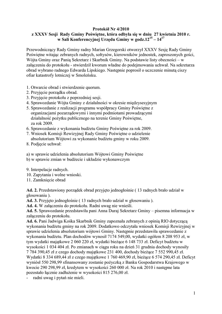Protokół Nr 4/2010 z XXXV Sesji Rady Gminy Poświętne, która odbyła się w dniu 27 kwietnia 2010 r. w Sali Konferencyjnej Urzędu Gminy w godz.1215 – 1417 Przewodniczący Rady Gminy radny Marian Grzegorski otworzył XXXV Sesję Rady Gminy Poświętne witając zebranych radnych, sołtysów, kierowników jednostek, zaproszonych gości, Wójta Gminy oraz Panią Sekretarz i Skarbnik Gminy. Na podstawie listy obecności – w załączeniu do protokołu - stwierdził kworum władne do podejmowania uchwał. Na sekretarza obrad wybrano radnego Edwarda Lipskiego. Następnie poprosił o uczczenie minutą ciszy ofiar katastrofy lotniczej w Smoleńsku. 1. Otwarcie obrad i stwierdzenie quorum. 2. Przyjęcie porządku obrad. 3. Przyjęcie protokołu z poprzedniej sesji. 4. Sprawozdanie Wójta Gminy z działalności w okresie międzysesyjnym 5. Sprawozdanie z realizacji programu współpracy Gminy Poświętne z organizacjami pozarządowymi i innymi podmiotami prowadzącymi działalność pożytku publicznego na terenie Gminy Poświętne, za rok 2009. 6. Sprawozdanie z wykonania budżetu Gminy Poświętne za rok 2009. 7. Wniosek Komisji Rewizyjnej Rady Gminy Poświętne o udzielenie absolutorium Wójtowi za wykonanie budżetu gminy w roku 2009. 8. Podjęcie uchwał: a) w sprawie udzielenia absolutorium Wójtowi Gminy Poświętne b) w sprawie zmian w budżecie i układzie wykonawczym 9. Interpelacje radnych. 10. Zapytania i wolne wnioski. 11. Zamknięcie obrad Ad. 2. Przedstawiony porządek obrad przyjęto jednogłośnie ( 13 radnych brało udział w głosowaniu ). Ad. 3. Przyjęto jednogłośnie ( 13 radnych brało udział w głosowaniu ). Ad. 4. W załączeniu do protokołu. Radni uwag nie wnieśli. Ad. 5. Sprawozdanie przedstawiła pani Anna Duraj Sekretarz Gminy – pisemna informacja w załączeniu do protokołu. Ad. 6. Pani Jadwiga Kośka Skarbnik Gminy zapoznała zebranych z opinią RIO dotyczącą wykonania budżetu gminy na rok 2009. Dodatkowo odczytała wniosek Komisji Rewizyjnej w sprawie udzielenia absolutorium wójtowi Gminy. Następnie przedstawiła sprawozdanie z wykonania budżetu. Plan dochodów wynosił 7174 549,00, wydatki ogółem 8 208 953 zł, w tym wydatki majątkowe 2 060 220 zł, wydatki bieżące 6 148 733 zł. Deficyt budżetu w wysokości 1 034 404 zł. Po zmianach w ciągu roku na dzień 31 grudnia dochody wynosiły 7 784 390,45 zł z czego dochody majątkowe 231 400, dochody bieżące 7 552 990,45 zł. Wydatki 8 334 689,44 zł z czego majątkowe 1 760 469,90 zł, bieżące 6 574 290,45 zł. Deficyt wyniósł 550 298,99 sfinansowany zostanie pożyczką z Banku Gospodarstwa Krajowego w kwocie 290 298,99 zł, kredytem w wysokości 260 000 zł. Na rok 2010 i następne lata pozostało łącznie zadłużenie w wysokości 815 276,00 zł. - radni uwag i pytań nie mieli. 1 Wójt Gminy uzupełniając wypowiedź pani Skarbnik dodał, że w Mysiakowcu nie zrealizowano inwestycji ze względu na zmieniające się przepisy oraz problemy z ochroną środowiska i telekomunikacją, które opóźniły prace projektowe. Starostwo powiatowe nie wydało pozwolenia na budowę ze względu na brak stosownej szerokości pasa drogowego. Nadwyżkę spowodowała dotacja z Urzędu Marszałkowskiego do budowy dróg w ramach rekultywacji, która przyszła do gminy w końcu grudnia oraz przełożenie płatności wyrównań nauczycielskich na rok przyszły. Przedstawił zrealizowane inwestycje w roku 2009. 1. Budowa drogi emulsyjnej w Porębach w kwocie 349 663 zł z czego 140 tys. bezzwrotna dotacja z urzędu marszałkowskiego, 2. Budowa drogi emulsyjnej w Brudzewicach – Iły w kwocie 206 895 zł z czego dotacja urzędu marszałkowskiego 80 tys. 3. Remont drogi powiatowej we współpracy z powiatem w Studziannie w kwocie 105 135 zł, droga w stronę Gapinina 112 tys. zł. 4. Przebudowa świetlicy wiejskiej w Studziannie za 615 103 zł. Aktualnie gmina ma przyznany zwrot ze środków unijnych. 5. Złożono wniosek na termomodernizację ZSS, który za kwotę 16470 został zaktualizowany, obecnie została podpisana umowa z urzędem marszałkowskim a 15 maja będzie przetarg. 6. Podpisano umowę na dofinansowanie rozbudowy oczyszczalni ścieków 7. Złożono wniosek na przebudowę świetlicy w Dębie, projekt kosztował 26600 zł 8. Zakupiono i wymieniono 45 sztuk lamp ulicznych za kwotę 14998 zł. 9. Szkoły otrzymały po 10 tys. na remonty. Szkoła w Dębie otrzymała dodatkowe 10 tys. z MEN-u. - radni uwag nie wnieśli. Ad. 7. Wniosek o udzielenie absolutorium przedstawił radny Andrzej Pawlik przewodniczący Komisji Rewizyjnej – w załączeniu do protokołu. - uwag nie było. Ad. 8 a. Projekt uchwały w sprawie udzielenia absolutorium Wójtowi Gminy Poświętne przedstawiła pani Duraj Sekretarz Gminy. Za udzieleniem absolutorium głosowało 14 radnych – jednogłośnie. - Przewodniczący Rady Gminy pogratulował Wójtowi uzyskania absolutorium. - Wójt Gminy podziękował radnym za udzielenie absolutorium oraz za współpracę przy realizacji budżetu i inwestycji w minionym roku podziękowania złożył również pracownikom urzędu szczególnie pani Lasota. Dodał, że życzyłby sobie aby wykonanie inwestycji w roku 2010 było na podobnym poziomie. Ad. 8 b. Projekt uchwały w sprawie zmian w budżecie przedstawiła pani Kośka Skarbnik Gminy. - radny Worach – odnośnie wyposażenia świetlicy w Studziannie zapytał czy nie miało ono pochodzić ze środków unijnych. - pani Skarbnik oznajmiła, że tak ale musiałaby być zaciągnięta pożyczka w Banku Gospodarstwa krajowego a potem byłby zwrot, kwota jest niewielka, odejdą koszty obsługi pożyczki a zwrot i tak gmina otrzyma. - radny Worach dodał, że rezygnujemy z przebudowy schodów, zmiany z oczyszczalnią ścieków, jakie dalsze zamiary. Przetargi były wysokie, jeżeli Wójt jest zdeterminowany prowadzić dalej tą inwestycję to skąd środki na uzupełnienie kwoty. - Wójt Gminy oznajmił, że przetarg będzie powtórzony. C