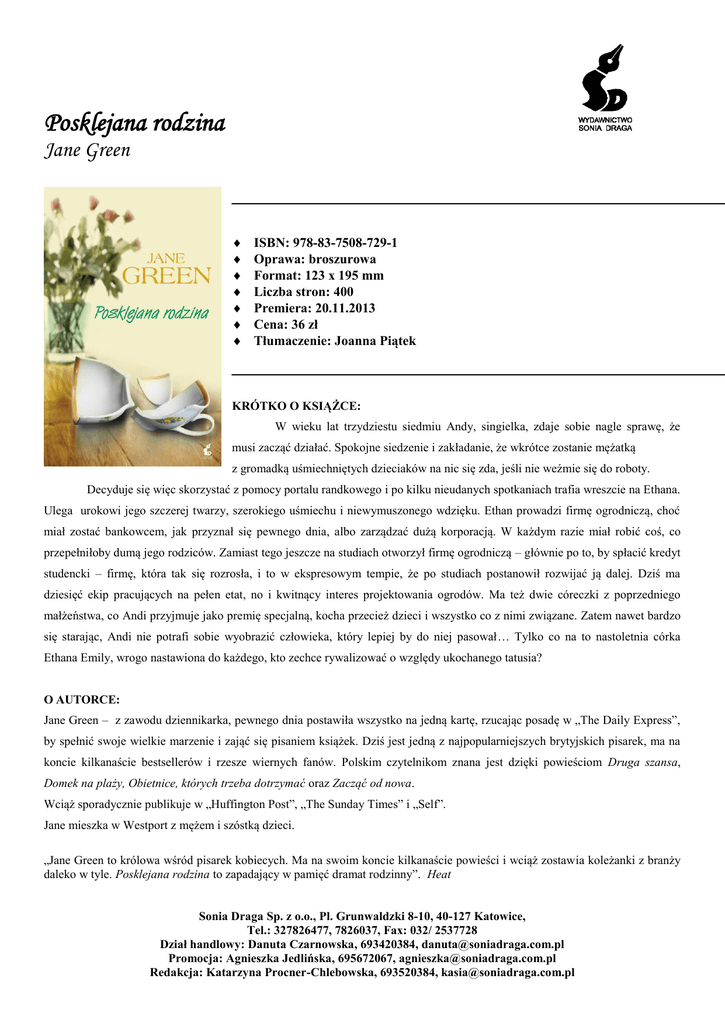 Posklejana rodzina Jane Green ISBN: 978-83-7508-729-1 Oprawa: broszurowa Format: 123 x 195 mm Liczba stron: 400 Premiera: 20.11.2013 Cena: 36 zł Tłumaczenie: Joanna Piątek KRÓTKO O KSIĄŻCE: W wieku lat trzydziestu siedmiu Andy, singielka, zdaje sobie nagle sprawę, że musi zacząć działać. Spokojne siedzenie i zakładanie, że wkrótce zostanie mężatką z gromadką uśmiechniętych dzieciaków na nic się zda, jeśli nie weźmie się do roboty. Decyduje się więc skorzystać z pomocy portalu randkowego i po kilku nieudanych spotkaniach trafia wreszcie na Ethana. Ulega urokowi jego szczerej twarzy, szerokiego uśmiechu i niewymuszonego wdzięku. Ethan prowadzi firmę ogrodniczą, choć miał zostać bankowcem, jak przyznał się pewnego dnia, albo zarządzać dużą korporacją. W każdym razie miał robić coś, co przepełniłoby dumą jego rodziców. Zamiast tego jeszcze na studiach otworzył firmę ogrodniczą – głównie po to, by spłacić kredyt studencki – firmę, która tak się rozrosła, i to w ekspresowym tempie, że po studiach postanowił rozwijać ją dalej. Dziś ma dziesięć ekip pracujących na pełen etat, no i kwitnący interes projektowania ogrodów. Ma też dwie córeczki z poprzedniego małżeństwa, co Andi przyjmuje jako premię specjalną, kocha przecież dzieci i wszystko co z nimi związane. Zatem nawet bardzo się starając, Andi nie potrafi sobie wyobrazić człowieka, który lepiej by do niej pasował… Tylko co na to nastoletnia córka Ethana Emily, wrogo nastawiona do każdego, kto zechce rywalizować o względy ukochanego tatusia? O AUTORCE: Jane Green – z zawodu dziennikarka, pewnego dnia postawiła wszystko na jedną kartę, rzucając posadę w „The Daily Express”, by spełnić swoje wielkie marzenie i zająć się pisaniem książek. Dziś jest jedną z najpopularniejszych brytyjskich pisarek, ma na koncie kilkanaście bestsellerów i rzesze wiernych fanów. Polskim czytelnikom znana jest dzięki powieściom Druga szansa, Domek na plaży, Obietnice, których trzeba dotrzymać oraz Zacząć od nowa. Wciąż sporadycznie publikuje w „Huffington Post”, „The Sunday Times” i „Self”. Jane mieszka w Westport z mężem i szóstką dzieci. „Jane Green to królowa wśród pisarek kobiecych. Ma na swoim koncie kilkanaście powieści i wciąż zostawia koleżanki z branży daleko w tyle. Posklejana rodzina to zapadający w pamięć dramat rodzinny”. Heat Sonia Draga Sp. z o.o., Pl. Grunwaldzki 8-10, 40-127 Katowice, Tel.: 327826477, 7826037, Fax: 032/ 2537728 Dział handlowy: Danuta Czarnowska, 693420384, [email protected] Promocja: Agnieszka Jedlińska, 695672067, [email protected] Redakcja: Katarzyna Procner-Chlebowska, 693520384, [email protected]