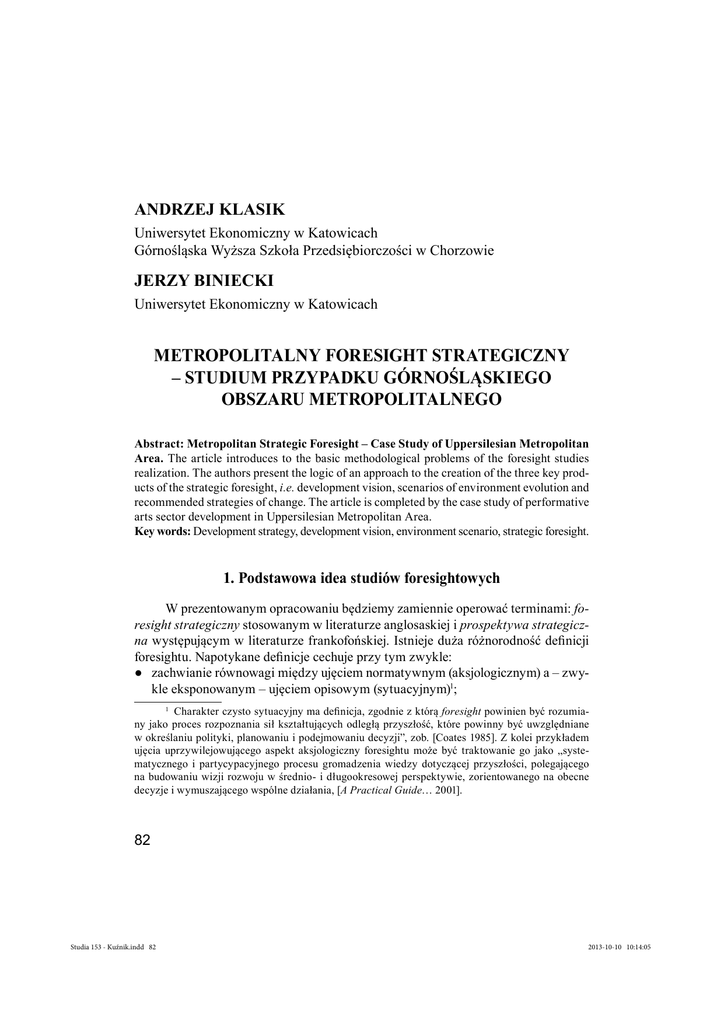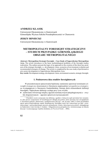 ANDRZEJ KLASIK Uniwersytet Ekonomiczny w Katowicach Górnośląska Wyższa Szkoła Przedsiębiorczości w Chorzowie JERZY BINIECKI Uniwersytet Ekonomiczny w Katowicach METROPOLITALNY FORESIGHT STRATEGICZNY – STUDIUM PRZYPADKU GÓRNOŚLĄSKIEGO OBSZARU METROPOLITALNEGO Abstract: Metropolitan Strategic Foresight – Case Study of Uppersilesian Metropolitan Area. The article introduces to the basic methodological problems of the foresight studies realization. The authors present the logic of an approach to the creation of the three key products of the strategic foresight, i.e. development vision, scenarios of environment evolution and recommended strategies of change. The article is completed by the case study of performative arts sector development in Uppersilesian Metropolitan Area. Key words: Development strategy, development vision, environment scenario, strategic foresight. 1. Podstawowa idea studiów foresightowych W prezentowanym opracowaniu będziemy zamiennie operować terminami: foresight strategiczny stosowanym w literaturze anglosaskiej i prospektywa strategiczna występującym w literaturze frankofońskiej. Istnieje duża różnorodność definicji foresightu. Napotykane definicje cechuje przy tym zwykle: ● zachwianie równowagi między ujęciem normatywnym (aksjologicznym) a – zwykle eksponowanym – ujęciem opisowym (sytuacyjnym)1; 1 Charakter czysto sytuacyjny ma definicja, zgodnie z którą foresight powinien być rozumiany jako proces rozpoznania sił kształtujących odległą przyszłość, które powinny być uwzględniane w określaniu polityki, planowaniu i podejmowaniu decyzji”, zob. [Coates 1985]. Z kolei przykładem ujęcia uprzywilejowującego aspekt aksjologiczny foresightu może być traktowanie go jako „systematycznego i partycypacyjnego procesu gromadzenia wiedzy dotyczącej przyszłości, polegającego na budowaniu wizji rozwoju w średnio- i długookresowej perspektywie, zorientowanego na obecne decyzje i wymuszającego wspólne działania, [A Practical Guide… 2001]. 82 Studia 153 - Kuźnik.indd 82 2013-10-10 10:14:05 ● kładzenie nadmiernego nacisku na pojedynczy – technologiczny – wymiar potencjalnego badania foresightowego2; ● zacieranie różnic między foresightem a tradycyjnym prognozowaniem (przewidywaniem)3; ● brak rozróżnienia między wizjami i scenariuszami. W opracowaniu będziemy rozumieć foresight strategiczny, jako ukierunkowany przez i na wartości, uporządkowany proces kreowania przyszłości angażujący zbiorową wyobraźnię i wiedzę. W definicji tej uwzględnia się współwystępowanie trzech koniecznych „produktów” foresightu strategicznego, którymi są (zob. ryc. 1): ● wizja, ● scenariusze, ● strategia. Wizja jest efektem antycypacji pożądanego obrazu przyszłości i trajektorii pożądanych zmian prowadzących do jego urzeczywistnienia. Z kolei scenariusze powstają w wyniku eksploracji wielorakich przyszłych uwarunkowań zewnętrznych. Ryc. 1. Foresight strategiczny: główne produkty Źródło: Opracowanie własne (ryc. 1-8). 2 Zob. znaną definicję Martina, dla którego foresight to „systematyczna próba długookresowego oglądu przyszłości nauki, technologii, gospodarki i społeczeństwa w celu identyfikacji podstawowych technologii wyłaniających się i strategicznych obszarów badań o największym potencjale generowania znaczących korzyści ekonomicznych i społecznych” [Martin 1995, cyt. za: Barros 2002]. 3 Zob. np. ujęcia, według których foresight to: „próba kolektywnego antycypowania ważnych czynników i zagrożeń mogących wpływać na przyszłość społeczeństwa” [Loveridge, Street 2003] lub: „umiejętność dostrzeżenia tego, co prawdopodobnie wydarzy się w przyszłości” [Aulicino 2005]. 83 Studia 153 - Kuźnik.indd 83 2013-10-10 10:14:24 Tabela 1 Typologia regionalno-metropolitalnych badań foresightowych Podstawowe kierunki badań foresightowych Terytorialny zasięg badań foresightowych region metropolia Rozwój sektorowy: aktywności Rozwój technologiczny: kluczowe technologie Rozwój terytorialny: przestrzeń Źródło: Opracowanie własne (tab. 1-13). Strategia jest odpowiedzią na pytanie „jak działać” w warunkach opisywanych przez scenariusze, tak aby osiągnąć pożądane stany i procesy definiowane za pośrednictwem wizji. Właściwością studiów foresightowych jest łączenie czterech orientacji, którymi są: ● orientacja systemowo-heurystyczna, otwierająca studia foresightowe przez delimitację i identyfikację systemu [zob. także Klasik 1993]; ● orientacja aksjologiczno-normatywna, profilująca tworzenie wizji przyszłości; ● orientacja sytuacyjno-eksploracyjna, ukierunkowująca budowanie scenariuszy uwarunkowań; ● orientacja strategiczno-decyzyjna, zawierająca się w formułowaniu opcji strategicznych i kierunków działań. Podstawowe dziedziny foresightu można określać na podstawie dwojakiego rodzaju kryteriów. Kryterium pierwsze odnosi się do przedmiotowo określonego obiektu badania. Stanowić go mogą różnego typy działalności (sektory aktywności), rozwój technologiczny lub przekształcenia przestrzenne. Kryterium drugie związane jest z terytorialną delimitacją zasięgu badania. Badanie to może objąć obszar całego kraju, koncentrować się na procesach zachodzących w skali regionalnej lub orientować się na rozwój obszarów metropolitalnych. Typologiczną siatkę podstawowych typów badań foresightowych utworzoną z uwzględnieniem powyższych kryteriów prezentuje tab. 1. Użyteczność praktyczna foresightu strategicznego wynika przede wszystkim z: ● tworzenia klimatu pracy zespołowej i intensyfikacji współpracy interdyscyplinowej; ● tworzenia możliwości spontanicznego i efektywnego wykorzystania potencjału wiedzy i kreatywności; ● wypracowania wspólnego języka sprzyjającego rozwojowi komunikacji interpersonalnej; ● pobudzania wyobraźni z zastosowaniem reguł twórcze