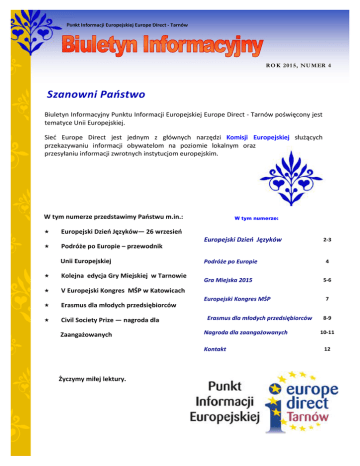 Punkt Informacji Europejskiej Europe Direct - Tarnów ROK 2015, NUMER 4 Szanowni Państwo Biuletyn Informacyjny Punktu Informacji Europejskiej Europe Direct - Tarnów poświęcony jest tematyce Unii Europejskiej. Sieć Europe Direct jest jednym z głównych narzędzi Komisji Europejskiej służących przekazywaniu informacji obywatelom na poziomie lokalnym oraz przesyłaniu informacji zwrotnych instytucjom europejskim. W tym numerze przedstawimy Państwu m.in.: « Europejski Dzień Języków— 26 wrzesień « Podróże po Europie – przewodnik Unii Europejskiej « Kolejna edycja Gry Miejskiej w Tarnowie « V Europejski Kongres MŚP w Katowicach « Erasmus dla młodych przedsiębiorców « Civil Society Prize — nagroda dla Zaangażowanych W tym numerze: Europejski Dzień Języków Podróże po Europie Gra Miejska 2015 Europejski Kongres MŚP Erasmus dla młodych przedsiębiorców Nagroda dla zaangażowanych Kontakt Życzymy miłej lektury. 2-3 4 5-6 7 8-9 10-11 12 ROK 2015, NUMER 4 Str. 2 Europejski Dzień Języków został ustalony na 26 września. Wydarzenie to zostało zorganizowane wspólnie przez Unię Europejską oraz Radę Europy i odbywa się corocznie nieprzerwanie od 2001 roku. Już pierwsza edycja spotkała się z wielka aprobatą społeczeństwa. Inicjatywa świętowania różnorodności językowej narodów europejskich wzbudza zawsze ogromne zainteresowanie milionów ludzi z 45 uczestniczących w tym wydarzeniu państw. Inicjatywa ta wspierana jest przez Komisje Europejską. Celem organizowania Europejskiego Dnia Języków jest przede wszystkim rozwijanie umiejętności językowych. Unia Europejska i Rada Europy chcą zachęcić ponad 800 milionów Europejczyków do nauki języków obcych. ROK 2015, NUMER 4 Str. 3 Celem tego wydarzenia jest również pielęgnowanie i rozwianie różnorodności kulturowej i językowej. Znajomość języków obcych jest w dzisiejszych czasach rzeczą wręcz niezbędną. Szczególnie przydatna jest w zwiększeniu mobilności oraz rozwijaniu kariery zawodowej. We współczesnej Europie, po zniesieniu kontroli granic dla obywateli Europy otworzyły się nowe możliwości, których nigdy wcześniej nie było. Obecnie panują bardzo sprzyjające warunki dla każdego, kto pragnie podjąć pracę lub nauczanie poza granicami swojego ojczystego kraju. Jednak brak podstawowych umiejętności posługiwania się językiem obcym powoduje, ze ludzie z tym możliwości nie potrafią skorzystać. Uczenie się języków obcych może być też pewną formą przyjemności i dobrego wykorzystywania wolnego czasu. Dodatkową motywacją to nauki może być chęć swobodnego podróżowania bez obaw o wszelkiego rodzaju nieporozumienia wynikające z bariery językowej oraz chęć zawarcia nowych, ciekawych znajomości. Jeśli w języku kraju, który odwiedzamy w czasie wakacji, poznamy choć kilka słów, pozwoli to nam zyskać nowych znajomych oraz lepiej poznać kulturę danego państwa. ROK 2015, NUMER 4 Str. 4 Europa to kontynent szczycący się bogatym dziedzictwem kulturowym i pięknymi krajobrazami. Każdy podróżnik znajdzie tu wiele ciekawych miejsc do odkrycia i poznania. Wraz ze zniesieniem granic w większości państw UE, podróżowanie stało się jeszcze łatwiejsze. Dodatkowo, w wielu krajach członkowskich można płacić wspólną walutą euro, a korzystanie z telefonów komórkowych za granicą jest coraz tańsze. Dla tych, którzy planują podróż w Europie, Komisja Europejska wraz z Dyrekcją Generalną ds. Komunikacji przygotowała nową broszurę "Podróże po Europie 2015/16". Broszura dostarcza wiele użytecznych i praktycznych informacji i porad dotyczących podróżowania samochodem, samolotem lub koleją, opisuje jak funkcjonuje opieka medyczna i ubezpieczenia zdrowotne na terenie UE, radzi jak podróżować ze zwierzętami domowymi lub co zrobić w nagłych wypadkach. Dlatego gdy wybierasz się w podróż, warto byś zaopatrzył się w broszurę „Podróże po Europie”. Broszury te znaleźć można w Punkcie Informacji Europejskiej EUROPE DIRECT w Tarnowie, jest też możliwość pobrania jej ze strony bookshop.europa.eu ROK 2015, NUMER 4 ,,Tarnów z Europejskim Str. 5 Rokiem Na Rzecz Rozwoju” - pod takim właśnie hasłem odbywać będzie się tegoroczna Gra Miejska. Rozwiązywanie zadań, drużynowa rywalizacja, pokonywanie wyznaczonej trasy – to tylko część atrakcji, które czekają na uczestników tegorocznej edycji Gry Miejskiej organizowanej przy współpracy z Fundacją Regionalnego Rozwoju Edukacji. Temat przewodni Gry nawiązuje do obchodzonego aktualnie Europejskiego Roku Na Rzecz Rozwoju. Wiemy, że nauka to nie tylko szkolna ławka i tomy książek – chcemy po raz kolejny udowodnić, że można zdobywać wiedzę w dużo ciekawszy sposób. Przebieg gry: Tegoroczna etapach: Gra Miejska, wzorem z lat ubiegłych, odbywać się będzie w dwóch I etap – eliminacje – polega na rozwiązywaniu zadań różnego typu publikowanych na tablicy facebook’a w określonych dniach i godzinach. Do II etapu przechodzi 5 drużyn, które zdobędą największą ilość punktów w I etapie. II etap – gra terenowa – odbędzie się na terenie miasta Tarnowa w 5 punktach kontrolnych, w których drużyny będą mieć do wykonania określone zadania. Wydarzenie rozpocznie się w punkcie startowym, gdzie uczestnicy zostaną zapoznani z celami i zasadami gry oraz odbiorą kartę i mapkę do gry. Po zaliczeniu wszystkich punktów gracze docierają na Metę, gdzie nastąpi ocena zadania specjalnego, zliczenie wszystkich punktów, wyłonienie zwycięskiej drużyny oraz rozdanie nagród. ROK 2015, NUMER 4 Str. 6 Uczestnicy: Gra przeznaczona jest tylko dla drużyn składających się z 3 uczestników (uczniów szkół gimnazjalnych z terenu Miasta i gminy Tarnów). Każda drużyna zgłaszana przez szkołę powinna mieć wyznaczonego kapitana drużyny oraz opiekuna, którym może być nauczyciel szkoły. Cel gry: Głównym celem organ