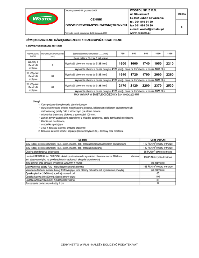 Obowiązuje od 01 grudnia 2007 CENNIK DRZWI DREWNIANYCH WEWNĘTRZNYCH Poprzedni cennik obowiązuje do 30 listopada 2007 WOSTOL SP. Z O.O. ul. Stolarska 2 62-032 Luboń k/Poznania tel. 061 810 51 39 fax 061 899 58 20 e-mail: [email protected] www. wostol.pl STRONA 6 DŹWIĘKOSZCZELNE, DŹWIĘKOSZCZELNE / PRZECIWPOŻAROWE PEŁNE 1. DŹWIĘKOSZCZELNE Rw 42dB OZNACZENIE DRZWI ODPORNOŚĆ OGNIOWA EI [min] WL-DDp 1 Rw 42 dB 0 przylgowe Szerokość otworu w murze do ........ [mm], 750 850 950 1050 1150 1600 1660 1740 1950 2210 Cena netto w PLN za 1 szt. drzwi Wysokość otworu w murze do 2125 [mm] Wysokość otworu w murze powyżej 2125 [mm] - cena za 1m2 otworu w murze 1010 PLN WL-DDp 30-1 Rw 42 dB 30 przylgowe Wysokość otworu w murze do 2125 [mm] 1640 1720 1790 2000 2260 2 Wysokość otworu w murze powyżej 2125 [mm] - cena za 1m otworu w murze 1020 PLN WL-DDp 60-1 Rw 42 dB 60 przylgowe Wysokość otworu w murze do 2125 [mm] 2170 2120 2200 2370 2530 Wysokość otworu w murze powyżej 2125 [mm] - cena za 1m2 otworu w murze 1370 PLN MAX WYMIAR W ŚWIETLE OŚCIEŻNICY SxH 1000x2200 MM Uwagi: Ceny podano dla wykonania standardowego: drzwi okleinowane okleiną modyfikowaną dębową, lakierowane lakierem bezbarwnym lub malowane wg palety RAL z widocznym rysunkiem drewna * ościeżnica drewniana blokowa o szerokości 100 mm, * zamek zwykły zapadkowo-zasuwkowy z wkładką patentową, czoło zamka stal nierdzewna * klamki stal nierdzewna, * uszczelka opadająca * 3 lub 4 zawiasy stalowe/ skrzydło drzwiowe 2. Cena nie zawiera kosztu: osprzętu (samozamykacz itp.), dostawy oraz montażu. 1. * Dopłaty Cena w [PLN] Inny rodzaj okleiny naturalnej: buk, olcha, mahoń, dąb, brzoza lakierowana lakierem bezbarwnym 110 PLN/m2 otworu w murze Inny rodzaj okleiny naturalnej: buk, olcha, mahoń, dąb, brzoza bejcowanej 140 PLN/m2 otworu w murze Okleina standardowa bejcowana 55 PLN/m2 otworu w murze Laminat RESOPAL lub DUROPAL -kolekcja drzwiowa do wysokości otworu w murze 2200mm, jest stosowany tylko na powierzchniach czołowych skrzydeł drzwiowych) Inny laminat oraz powyżej wysokości 2200mm w murze (laminat Malowanie wg palety RAL - niewidoczny rysunek drewna Malowanie farbami metalik, kolory fosforyzujące, inne okleiny naturalne niż wymienione powyżej Opaska płaska (10x60mm) z jednej strony drzwi Opaska kątowa (10x60mm) z jednej strony drzwi Opaska wąska (10x25mm) z jednej strony drzwi Poszerzenie ościeżnicy o każdy 1 cm CENY NETTO W PLN - NALEŻY DOLICZYĆ PODATEK VAT 110 PLN/skrzydło drzwiowe po zapytaniu 165 PLN/m2 otworu w murze po zapytaniu 65 100 35 12