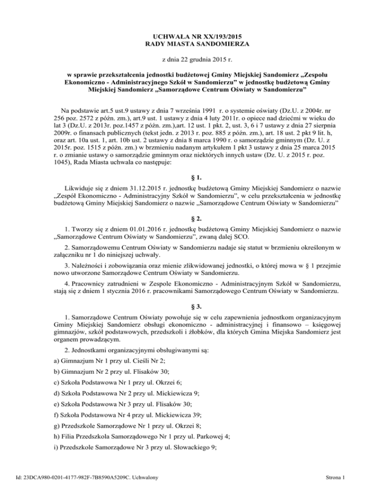 UCHWAŁA NR XX/193/2015 RADY MIASTA SANDOMIERZA z dnia 22 grudnia 2015 r. w sprawie przekształcenia jednostki budżetowej Gminy Miejskiej Sandomierz „Zespołu Ekonomiczno - Administracyjnego Szkół w Sandomierzu” w jednostkę budżetową Gminy Miejskiej Sandomierz „Samorządowe Centrum Oświaty w Sandomierzu” Na podstawie art.5 ust.9 ustawy z dnia 7 września 1991 r. o systemie oświaty (Dz.U. z 2004r. nr 256 poz. 2572 z późn. zm.), art.9 ust. 1 ustawy z dnia 4 luty 2011r. o opiece nad dziećmi w wieku do lat 3 (Dz.U. z 2013r. poz.1457 z późn. zm.),art. 12 ust. 1 pkt. 2, ust. 3, 6 i 7 ustawy z dnia 27 sierpnia 2009r. o finansach publicznych (tekst jedn. z 2013 r. poz. 885 z późn. zm.), art. 18 ust. 2 pkt 9 lit. h, oraz art. 10a ust. 1, art. 10b ust. 2 ustawy z dnia 8 marca 1990 r. o samorządzie gminnym (Dz. U. z 2015r. poz. 1515 z późn. zm.) w brzmieniu nadanym artykułem 1 pkt 3 ustawy z dnia 25 marca 2015 r. o zmianie ustawy o samorządzie gminnym oraz niektórych innych ustaw (Dz. U. z 2015 r. poz. 1045), Rada Miasta uchwala co następuje: § 1. Likwiduje się z dniem 31.12.2015 r. jednostkę budżetową Gminy Miejskiej Sandomierz o nazwie „Zespół Ekonomiczno - Administracyjny Szkół w Sandomierzu”, w celu przekształcenia w jednostkę budżetową Gminy Miejskiej Sandomierz o nazwie „Samorządowe Centrum Oświaty w Sandomierzu” § 2. 1. Tworzy się z dniem 01.01.2016 r. jednostkę budżetową Gminy Miejskiej Sandomierz o nazwie „Samorządowe Centrum Oświaty w Sandomierzu”, zwaną dalej SCO. 2. Samorządowemu Centrum Oświaty w Sandomierzu nadaje się statut w brzmieniu określonym w załączniku nr 1 do niniejszej uchwały. 3. Należności i zobowiązania oraz mienie zlikwidowanej jednostki, o której mowa w § 1 przejmie nowo utworzone Samorządowe Centrum Oświaty w Sandomierzu. 4. Pracownicy zatrudnieni w Zespole Ekonomiczno - Administracyjnym Szkół w Sandomierzu, stają się z dniem 1 stycznia 2016 r. pracownikami Samorządowego Centrum Oświaty w Sandomierzu. § 3. 1. Samorządowe Centrum Oświaty powołuje się w celu zapewnienia jednostkom organizacyjnym Gminy Miejskiej Sandomierz obsługi ekonomiczno - administracyjnej i finansowo – księgowej gimnazjów, szkół podstawowych, przedszkoli i żłobków, dla których Gmina Miejska Sandomierz jest organem prowadzącym. 2. Jednostkami organizacyjnymi obsługiwanymi są: a) Gimnazjum Nr 1 przy ul. Cieśli Nr 2; b) Gimnazjum Nr 2 przy ul. Flisaków 30; c) Szkoła Podstawowa Nr 1 przy ul. Okrzei 6; d) Szkoła Podstawowa Nr 2 przy ul. Mickiewicza 9; e) Szkoła Podstawowa Nr 3 przy ul. Flisaków 30; f) Szkoła Podstawowa Nr 4 przy ul. Mickiewicza 39; g) Przedszkole Samorządowe Nr 1 przy ul. Okrzei 8; h) Filia Przedszkola Samorządowego Nr 1 przy ul. Parkowej 4; i) Przedszkole Samorządowe Nr 3 przy ul. Słowackiego 9; Id: 23DCA980-0201-4177-982F-7B8590A5209C. Uchwalony Strona 1 j) Przedszkole Samorządowe Nr 5 przy ul. Portowej 28; k) Przedszkole Samorządowe Nr 6 przy ul. T. Króla 3; l) Przedszkole Samorządowe Nr 7 przy ul. Armii Krajowej 5; m) Żłobek przy Przedszkolu Samorządowym Nr 5 przy ul. Portowej 28. § 4. W ramach wspólnej obsługi powierza się jednostce obsługującej w całości obowiązki w zakresie rachunkowości i sprawozdawczości jednostek obsługiwanych. Zakres wspólnej obsługi nie obejmuje kompetencji kierowników jednostek obsługiwanych do dysponowania środkami publicznymi oraz zaciągania zobowiązań, a także sporządzania i zatwierdzania planu finansowego oraz przeniesień wydatków w tym planie. § 5. Wykonanie uchwały powierza się Burmistrzowi Miasta Sandomierza. § 6. Uchwała wchodzi w życie po upływie 14 dni od dnia jej ogłoszenia w Dzienniku Urzędowym Województwa Świętokrzyskiego. Przewodniczący Rady Miasta Sandomierza Robert Pytka Id: 23DCA980-0201-4177-982F-7B8590A5209C. Uchwalony Strona 2 Załącznik Nr 1do Uchwały Nr XX/193/2015 Rady Miasta Sandomierza z dnia 22 grudnia 2015 r. STATUT SAMORZADOWEGO CENTRUM OŚWIATY W SANDOMIERZU Rozdział 1. POSTANOWIENIA OGÓLNE § 1. Samorządowe Centrum Oświaty w Sandomierzu zwane dalej „SCO” jest jednostką budżetową Gminy Miejskiej Sandomierz, realizującą zadania w zakresie obsługi finansowo-księgowej oraz administracyjno - gospodarczej szkół, przedszkoli i żłobków jak również SCO oraz prowadzenia ewidencji syntetyczno – analitycznej środków trwałych Gminnych Placówek Oświatowych, Żłobków i SCO. Prowadzi pełną dokumentację i dokonuje wszelkich czynności związanych z prawidłowym funkcjonowaniem oświaty i wychowania. SCO działa na podstawie: 1. Ustawy z dnia 7 września 1991 r. o systemie oświaty (t.j. Dz. U. z 2004r., Nr 256 poz. 2572 z późn. zm.), 2. Ustawy z dnia 27 sierpnia 2009 r. o finansach publicznych (t.j. Dz. U. z 2013r., poz. 885 z późn. zm.), 3. Ustawy z dnia 8 marca 1990 r. o samorządzie gminnym ( t.j. Dz. U. z 2015 r., poz. 1515 z późn. zm. ), 4. Ustawy z dnia 29 września 1994 r. o rachunkowości ( t.j. Dz. U z 2013 r. poz. 330 z późn. zm.), 5. ustawy z dnia 4 luty 2011r. o opiece nad dziećmi w wieku do lat 3 (t. j. Dz. U. z 2013 poz. 1457) 6. Niniejszego Statutu. § 2. Samorządowe Centrum Oświaty obejmuje swoją działalnością obsługę finansowo-księgową oraz administracyjno – gospodarczą szkół, przedszkoli, żłobków i SCO, oraz prowadzenie ewidencji syntetyczno – analitycznej środków trwałych Placówek Oświatowych, Żłobków jak również SCO, dla których organem prowadzącym jest Gmina Sandomierza. Prowadzi pełną dokumentację i dokonuje wszelkich czynności związanych z prawidłowym funkcjonowaniem oświaty i wychowania. Samorządowe Centrum Oświaty w Sandomierzu jest jednostką budżetową Gminy Miejskiej Sandomierz. Obejmuje swoją działalnością następujące Placówki Oświatowe i Żłobki w Sandomierzu: 1) Gimnazjum Nr 1 przy ul. Cieśli Nr 2; 2) Gimnazjum Nr 2 przy ul. Flisaków 30; 3) Szkołę Podstawową N