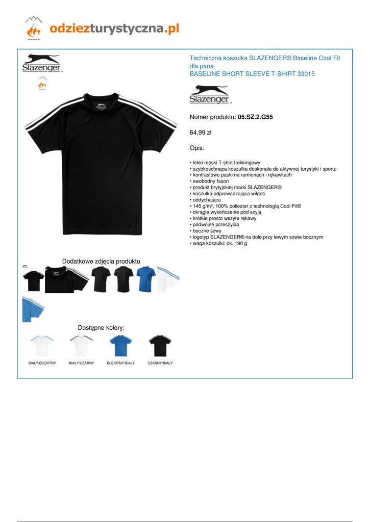 Techniczna koszulka SLAZENGER® Baseline Cool Fit dla pana BASELINE SHORT SLEEVE T-SHIRT 33015 Numer produktu: 05.SZ.2.G55 64,99 zł Opis: • lekki męski T-shirt trekkingowy • szybkoschnąca koszulka doskonała do aktywnej turystyki i sportu • kontrastowe paski na ramionach i rękawkach • swobodny fason • produkt brytyjskiej marki SLAZENGER® • koszulka odprowadzająca wilgoć • oddychająca • 145 g/m², 100% poliester z technologią Cool Fit® • okrągłe wykończenie pod szyją • krótkie prosto wszyte rękawy • podwójne przeszycia • boczne szwy • logotyp SLAZENGER® na dole przy lewym szwie bocznym • waga koszulki: ok. 190 g Dodatkowe zdjęcia produktu Dostępne kolory: BIAŁY/BŁĘKITNY Powered by TCPDF (www.tcpdf.org) BIAŁY/CZARNY BŁĘKITNY/BIAŁY CZARNY/BIAŁY