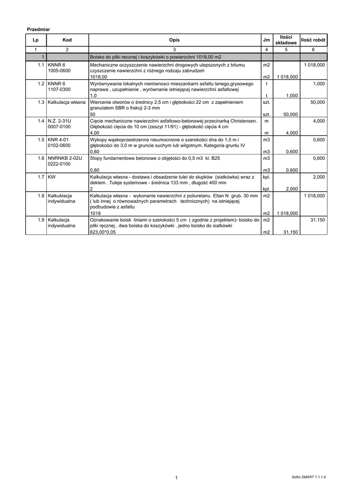 Przedmiar Lp Kod 1 2 1 Opis Jm 3 4 Ilości Ilość robót składowe 5 6 Boisko do pilki recznej i koszykówki o powierzchni 1018,00 m2 1.1 KNNR 6 1005-0600 Mechaniczne oczyszczenie nawierzchni drogowych ulepszonych z bitumu czyszczenie nawierzchni z różnego rodzaju zabrudzeń 1018,00 1.2 KNNR 6 Wyrównywanie lokalnych nierównosci mieszankami asfaltu lanego,grysowego 1107-0300 naprawa , uzupełnienie , wyrównanie istniejącej nawierzchni asfaltowej 1,0 1.3 Kalkulacja własna Wiercenie otworów o średnicy 2,5 cm i głębokości 22 cm z zapełnieniem granulatem SBR o frakcji 2-3 mm 50 1.4 N.Z. 2-31U Cięcie mechaniczne nawierzchni asfaltowo-betonowej przecinarką Christensen. 0007-0100 Głębokość cięcia do 10 cm (zeszyt 11/91) - głębokość cięcia 4 cm 4,00 1.5 KNR 4-01 Wykopy wąskoprzestrzenne nieumocnione o szerokości dna do 1,5 m i 0102-0600 głębokości do 3,0 m w gruncie suchym lub wilgotnym. Kategoria gruntu IV 0,60 1.6 NNRNKB 2-02U Stopy fundamentowe betonowe o objętości do 0,5 m3 kl. B25 0222-0100 0,60 1.7 KW Kalkulacja własna - dostawa i obsadzenie tulei do słupków (siatkówka) wraz z deklem. .Tuleje systemowe - średnica 133 mm , długość 400 mm 2 1.8 Kalkuklacja Kalkulacja własna - wykonanie nawierzchni z poliuretanu Eltan N grub. 30 mm indywidualna ( lub innej o równoważnych parametrach technicznych) na istniejącej podbudowie z asfaltu 1018 1.9 Kalkulacja Oznakowanie boisk liniami o szerokości 5 cm ( zgodnie z projektem)- boisko do indywidualna piłki ręcznej , dwa boiska do koszykówki , jedno boisko do siatkówki 623,00*0,05 1 m2 1 018,000 m2 t 1 018,000 t szt. 1,000 szt. m 50,000 m m3 4,000 m3 m3 0,600 m3 kpl. 0,600 kpl. m2 2,000 m2 m2 1 018,000 m2 31,150 1,000 50,000 4,000 0,600 0,600 2,000 1 018,000 31,150 SeKo SMART 7.1.1.4 Przedmiar robót Rodzaj robót (branża): Roboty drogowe Inwestycja Nawierzchnia poliuretanowa - boisko do piłki ręcznej i koszykówki Szkoła Podstawowa nr 18 Adres: Księżycowa 25 43-200 Pszczyna Kody CPV: 45233250-6 - Roboty w zakresie nawierzchni, z wyjątkiem dróg Inwestor: Pszczyński Zarząd Edukacji Zdrojowa 4 43-200 Pszczyna Wykonawca: Sporządził: Sprawdził: Data opracowania: Inwestor Strona tytułowa przedmiaru Wykonawca 2 SeKo SMART 7.1.1.4