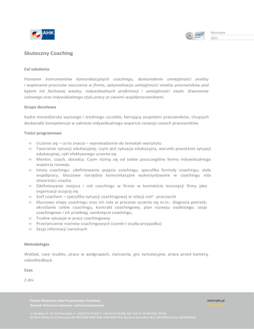 Warszawa 2011 Skuteczny Coaching Cel szkolenia Poznanie instrumentów komunikacyjnych coachingu, doskonalenie umiejętności analizy i wspierania procesów nauczania w firmie, optymalizacja umiejętności analizy pracowników pod kątem ich fachowej wiedzy, indywidualnych preferencji i umiejętności nauki. Stworzenie celowego oraz indywidualnego stylu pracy ze swoimi współpracownikami. Grupa docelowa Kadra menedżerska wyższego i średniego szczebla, kierującą zespołami pracowników, chcących doskonalić kompetencje w zakresie indywidualnego wsparcia rozwoju swoich pracowników. Treści programowe • • • • • • • • • • Uczenie się – co to znaczy – wprowadzenie do tematyki warsztatu Tworzenie sytuacji edukacyjnej: czym jest sytuacja edukacyjna, warunki powstania sytuacji edukacyjnej, cykl efektywnego uczenia się Mentor, coach, doradca. Czym różnią się od siebie poszczególne formy indywidualnego wsparcia rozwoju Istota coachingu: zdefiniowanie pojęcia coachingu, specyfika formuły coachingu, style współpracy, kluczowe narzędzia komunikacyjne wykorzystywane w coachingu rola otwartości coacha Zdefiniowanie miejsca i roli coachingu w firmie w kontekście koncepcji firmy jako organizacji uczącej się Szef coachem – specyfika sytuacji coachingowej w relacji szef - pracownik Kluczowe etapy coachingu oraz ich rola w procesie uczenia się m.in.: diagnoza potrzeb, określanie celów coachingu, kontrakt coachingowy, plan rozwoju osobistego, sesje coachingowe i ich przebieg, zamknięcie coachingu, Trudne sytuacje w pracy coachingowej Przećwiczenie rozmów coachingowych (scenki i studia przypadku) Sesja informacji zwrotnych Metodologia Wykład, case studies, praca w podgrupach, ćwiczenia, gry symulacyjne, praca przed kamerą, videofeedback. Czas 2 dni