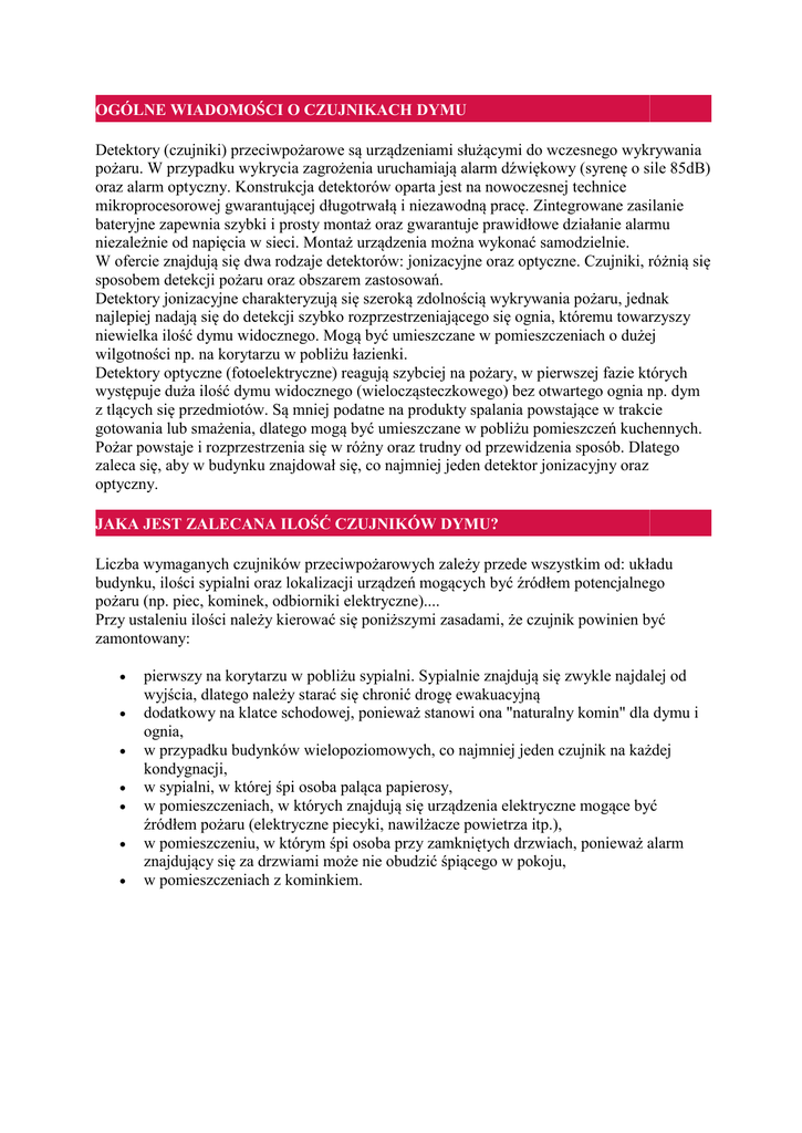 OGÓLNE WIADOMOŚCI O CZUJNIKACH DYMU Detektory (czujniki) przeciwpożarowe są urządzeniami służącymi do wczesnego wykrywania pożaru. W przypadku wykrycia zagrożenia uruchamiają alarm dźwiękowy (syrenę o sile 85dB) oraz alarm optyczny. Konstrukcja detektorów oparta jest na nowoczesnej technice mikroprocesorowej gwarantującej długotrwałą i niezawodną pracę. Zintegrowane zasilanie bateryjne zapewnia szybki i prosty montaż oraz gwarantuje prawidłowe działanie alarmu niezależnie od napięcia w sieci. Montaż urządzenia można wykonać samodzielnie. W ofercie znajdują się dwa rodzaje detektorów: jonizacyjne oraz optyczne. Czujniki, różnią się sposobem detekcji pożaru oraz obszarem zastosowań. Detektory jonizacyjne charakteryzują się szeroką zdolnością wykrywania pożaru, jednak najlepiej nadają się do detekcji szybko rozprzestrzeniającego się ognia, któremu towarzyszy niewielka ilość dymu widocznego. Mogą być umieszczane w pomieszczeniach o dużej wilgotności np. na korytarzu w pobliżu łazienki. Detektory optyczne (fotoelektryczne) reagują szybciej na pożary, w pierwszej fazie których występuje duża ilość dymu widocznego (wielocząsteczkowego) bez otwartego ognia np. dym z tlących się przedmiotów. Są mniej podatne na produkty spalania powstające w trakcie gotowania lub smażenia, dlatego mogą być umieszczane w pobliżu pomieszczeń kuchennych. Pożar powstaje i rozprzestrzenia się w różny oraz trudny od przewidzenia sposób. Dlatego zaleca się, aby w budynku znajdował się, co najmniej jeden detektor jonizacyjny oraz optyczny. JAKA JEST ZALECANA ILOŚĆ CZUJNIKÓW DYMU? Liczba wymaganych czujników przeciwpożarowych zależy przede wszystkim od: układu budynku, ilości sypialni oraz lokalizacji urządzeń mogących być źródłem potencjalnego pożaru (np. piec, kominek, odbiorniki elektryczne).... Przy ustaleniu ilości należy kierować się poniższymi zasadami, że czujnik powinien być zamontowany: pierwszy na korytarzu w pobliżu sypialni. Sypialnie znajdują się zwykle najdalej od wyjścia, dlatego należy starać się chronić drogę ewakuacyjną dodatkowy na klatce schodowej, ponieważ stanowi ona "naturalny komin" dla dymu i ognia, w przypadku budynków wielopoziomowych, co najmniej jeden czujnik na każdej kondygnacji, w sypialni, w której śpi osoba paląca papierosy, w pomieszczeniach, w których znajdują się urządzenia elektryczne mogące być źródłem pożaru (elektryczne piecyki, nawilżacze powietrza itp.), w pomieszczeniu, w którym śpi osoba przy zamkniętych drzwiach, ponieważ alarm znajdujący się za drzwiami może nie obudzić śpiącego w pokoju, w pomieszczeniach z kominkiem. Minimalna ilość czujników: co najmniej jeden detektor na każdą kondygnację. Najlepszym miejscem montażu jest hol w pobliżu klatki schodowej oraz sypialni. Optymalna ilość czujników: detektory powinny być zamontowane we wszystkich pokojach, na korytarzach, strychu oraz w piwnicy. Uwaga! W kuchni i garażu mogą być montowane jedynie czujniki termiczne zasilane z sieci. Niżej przedstawione rysunki pokazują przykładowe rozmieszczenie dla optymalnej ilości czujników wraz z uwzględnieniem typów detektorów. Przykładowe rozmieszczenie czujników w na piętrze/ w mieszkaniu jednopoziomowym optymalna ilość. Przykładowe rozmieszczenie czujników w budynku jednorodzinnym - optymalna ilość. REKOMENDOWANE MIEJSCA MONTAŻU Dym wraz z ciepłym powietrzem dąży najkrótszą drogą do sufitu, rozprzestrzenia się po jego powierzchni i następnie zaczyna opadać w dół. Dlatego najlepszym miejscem montażu czujnika jest środek sufitu, ponieważ z tego punktu jest najbliżej do każdego miejsca w pomieszczeniu. Minimalna odległość montażu od ściany bocznej powinna wynosić 30 cm oraz 60 cm od każdego wewnętrznego narożnika (patrz diagram A). Jeżeli nie jest możliwe umieszczenia czujnika na suficie, to dopuszcza się instalację urządzenia na ścianie. W takim przypadku powinien on być zamontowany, co najmniej 15 cm, lecz nie więcej niż 30 cm poniżej sufitu (diagram A). W pomieszczeniu o ukośnym sklepieniu, typu ^ ( np. na poddaszu) obszar w którym można zainstalować czujnik wyznacza się zgodnie z instrukcją opisaną w diagramie B. W pomieszczeniach, w których jeden z wymiarów jest większy niż 9 m (np. długi korytarz) należy zamontować czujniki na obu jego końcach. DIAGRAM A DIAGRAM B MIEJSCA W KTÓRYCH NALEŻY UNIKAĆ MONTOWANIA CZUJNIKÓW Jeżeli następuje częsta aktywacja czujnika w wyniku tzw. "fałszywych alarmów", może oznaczać to, że został on umieszczony w nieprawidłowym miejscu. W celu zminimalizowania możliwości przypadkowego uruchomienia alarmu, detektorów nie należy montować: w garażu. Produkty spalania są obecne podczas uruchamiania samochodu.* w pobliżu okien, drzwi, klimatyzatorów, wentylatorów sufitowych oraz innych urządzeń wymuszających burzliwy przepływ powietrza. w pomieszczeniach, w których temperatura spada poniżaj 4°C oraz może wzrosnąć powyżej 38°C np. w zamkniętych werandach, domowych ogrodach zimowych itp. w miejscu zaznaczonym na diagramie "A" - jako "martwy obszar" w miejscach narażonych na działanie kurzu, brudu. Czynniki te mogą zakłócić prawidłowe działanie sensora lub go zablokować. w odległości mniejszej niż 0.9m od pomieszczeń o dużej wilgotności powietrza (np. w łazience). Wilgoć lub para wodna może wywoływać fałszywe alarmy. w odległości mniejszej niż 0.9m od pomieszczeń w których występują produkty spalania (np. kuchnia).* w pobliżu fluoroscencyjnych źródeł światła (świetlówek) min. odległość 50cm. * nie dotyczy czujników termicznych.