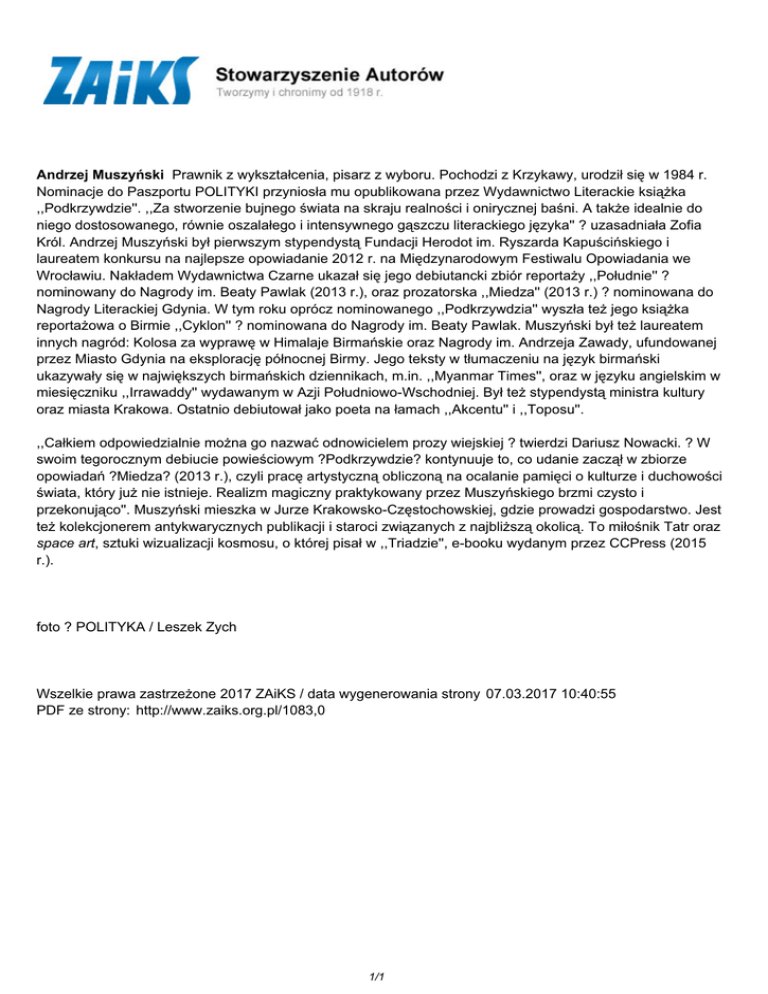 Andrzej Muszyński Prawnik z wykształcenia, pisarz z wyboru. Pochodzi z Krzykawy, urodził się w 1984 r. Nominacje do Paszportu POLITYKI przyniosła mu opublikowana przez Wydawnictwo Literackie książka ,,Podkrzywdzie''. ,,Za stworzenie bujnego świata na skraju realności i onirycznej baśni. A także idealnie do niego dostosowanego, równie oszalałego i intensywnego gąszczu literackiego języka'' ? uzasadniała Zofia Król. Andrzej Muszyński był pierwszym stypendystą Fundacji Herodot im. Ryszarda Kapuścińskiego i laureatem konkursu na najlepsze opowiadanie 2012 r. na Międzynarodowym Festiwalu Opowiadania we Wrocławiu. Nakładem Wydawnictwa Czarne ukazał się jego debiutancki zbiór reportaży ,,Południe'' ? nominowany do Nagrody im. Beaty Pawlak (2013 r.), oraz prozatorska ,,Miedza'' (2013 r.) ? nominowana do Nagrody Literackiej Gdynia. W tym roku oprócz nominowanego ,,Podkrzywdzia'' wyszła też jego książka reportażowa o Birmie ,,Cyklon'' ? nominowana do Nagrody im. Beaty Pawlak. Muszyński był też laureatem innych nagród: Kolosa za wyprawę w Himalaje Birmańskie oraz Nagrody im. Andrzeja Zawady, ufundowanej przez Miasto Gdynia na eksplorację północnej Birmy. Jego teksty w tłumaczeniu na język birmański ukazywały się w największych birmańskich dziennikach, m.in. ,,Myanmar Times'', oraz w języku angielskim w miesięczniku ,,Irrawaddy'' wydawanym w Azji Południowo-Wschodniej. Był też stypendystą ministra kultury oraz miasta Krakowa. Ostatnio debiutował jako poeta na łamach ,,Akcentu'' i ,,Toposu''. ,,Całkiem odpowiedzialnie można go nazwać odnowicielem prozy wiejskiej ? twierdzi Dariusz Nowacki. ? W swoim tegorocznym debiucie powieściowym ?Podkrzywdzie? kontynuuje to, co udanie zaczął w zbiorze opowiadań ?Miedza? (2013 r.), czyli pracę artystyczną obliczoną na ocalanie pamięci o kulturze i duchowości świata, który już nie istnieje. Realizm magiczny praktykowany przez Muszyńskiego brzmi czysto i przekonująco''. Muszyński mieszka w Jurze Krakowsko-Częstochowskiej, gdzie prowadzi gospodarstwo. Jest też kolekcjonerem antykwarycznych publikacji i staroci związanych z najbliższą okolicą. To miłośnik Tatr oraz space art, sztuki wizualizacji kosmosu, o której pisał w ,,Triadzie'', e-booku wydanym przez CCPress (2015 r.). foto ? POLITYKA / Leszek Zych Wszelkie prawa zastrzeżone 2017 ZAiKS / data wygenerowania strony 07.03.2017 10:40:55 PDF ze strony: http://www.zaiks.org.pl/1083,0 1/1