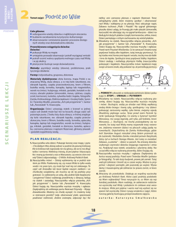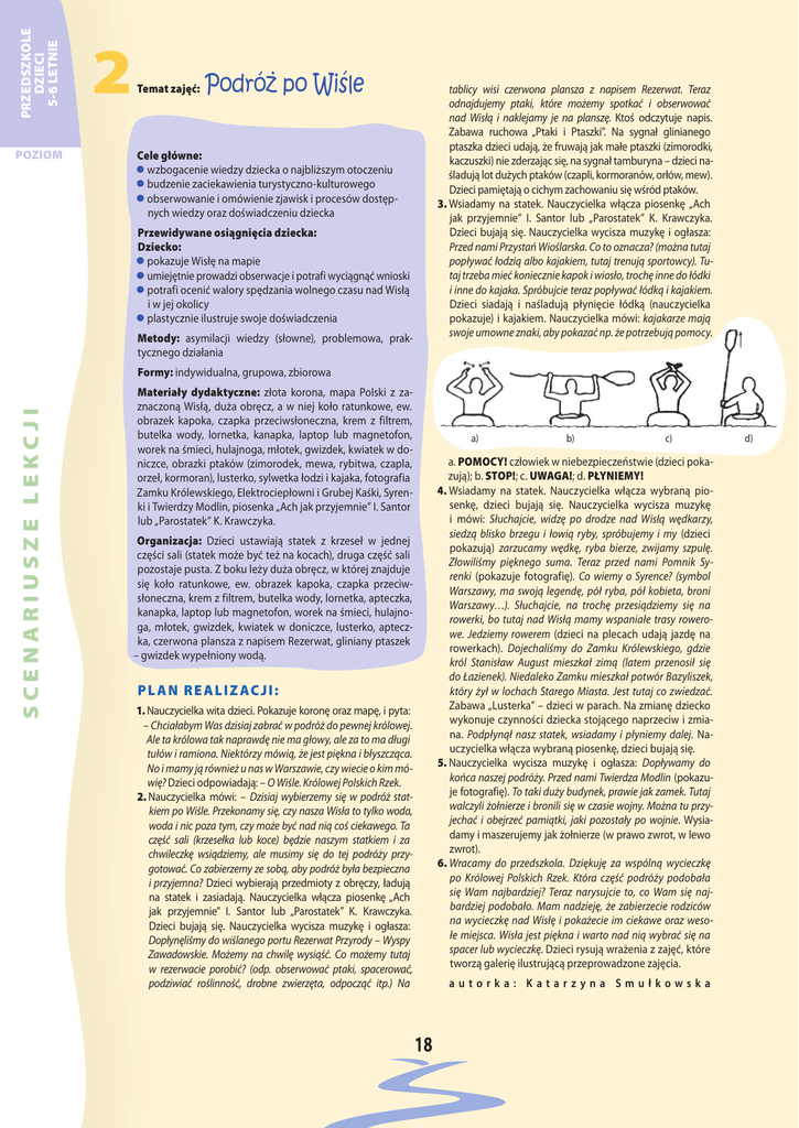 PRZEDSZKOLE DZIECI 5-6 LETNIE POZIOM 2 Temat zajęć: ´ Podróz˙ po Wisle tablicy wisi czerwona plansza z napisem Rezerwat. Teraz odnajdujemy ptaki, które możemy spotkać i obserwować nad Wisłą i naklejamy je na planszę. Ktoś odczytuje napis. Zabawa ruchowa „Ptaki i Ptaszki”. Na sygnał glinianego ptaszka dzieci udają, że fruwają jak małe ptaszki (zimorodki, kaczuszki) nie zderzając się, na sygnał tamburyna – dzieci naśladują lot dużych ptaków (czapli, kormoranów, orłów, mew). Dzieci pamiętają o cichym zachowaniu się wśród ptaków. 3. Wsiadamy na statek. Nauczycielka włącza piosenkę „Ach jak przyjemnie” I. Santor lub „Parostatek” K. Krawczyka. Dzieci bujają się. Nauczycielka wycisza muzykę i ogłasza: Przed nami Przystań Wioślarska. Co to oznacza? (można tutaj popływać łodzią albo kajakiem, tutaj trenują sportowcy). Tutaj trzeba mieć koniecznie kapok i wiosło, trochę inne do łódki i inne do kajaka. Spróbujcie teraz popływać łódką i kajakiem. Dzieci siadają i naśladują płynięcie łódką (nauczycielka pokazuje) i kajakiem. Nauczycielka mówi: kajakarze mają swoje umowne znaki, aby pokazać np. że potrzebują pomocy. a) b) c) Cele główne: l wzbogacenie wiedzy dziecka o najbliższym otoczeniu l budzenie zaciekawienia turystyczno-kulturowego l obserwowanie i omówienie zjawisk i procesów dostępnych wiedzy oraz doświadczeniu dziecka Przewidywane osiągnięcia dziecka: Dziecko: l pokazuje Wisłę na mapie l umiejętnie prowadzi obserwacje i potrafi wyciągnąć wnioski l potrafi ocenić walory spędzania wolnego czasu nad Wisłą i w jej okolicy l plastycznie ilustruje swoje doświadczenia Metody: asymilacji wiedzy (słowne), problemowa, praktycznego działania SCENARIUSZE LEKCJI Formy: indywidualna, grupowa, zbiorowa Materiały dydaktyczne: złota korona, mapa Polski z zaznaczoną Wisłą, duża obręcz, a w niej koło ratunkowe, ew. obrazek kapoka, czapka przeciwsłoneczna, krem z filtrem, butelka wody, lornetka, kanapka, laptop lub magnetofon, worek na śmieci, hulajnoga, młotek, gwizdek, kwiatek w doniczce, obrazki ptaków (zimorodek, mewa, rybitwa, czapla, orzeł, kormoran), lusterko, sylwetka łodzi i kajaka, fotografia Zamku Królewskiego, Elektrociepłowni i Grubej Kaśki, Syrenki i Twierdzy Modlin, piosenka „Ach jak przyjemnie” I. Santor lub „Parostatek” K. Krawczyka. a. Pomocy! człowiek w niebezpieczeństwie (dzieci pokazują); b. STOP!; c. UWAGA!; d. PŁYNIEMY! 4. Wsiadamy na statek. Nauczycielka włącza wybraną piosenkę, dzieci bujają się. Nauczycielka wycisza muzykę i mówi: Słuchajcie, widzę po drodze nad Wisłą wędkarzy, siedzą blisko brzegu i łowią ryby, spróbujemy i my (dzieci pokazują) zarzucamy wędkę, ryba bierze, zwijamy szpulę. Złowiliśmy pięknego suma. Teraz przed nami Pomnik Syrenki (pokazuje fotografię). Co wiemy o Syrence? (symbol Warszawy, ma swoją legendę, pół ryba, pół kobieta, broni Warszawy…). Słuchajcie, na trochę przesiądziemy się na rowerki, bo tutaj nad Wisłą mamy wspaniałe trasy rowerowe. Jedziemy rowerem (dzieci na plecach udają jazdę na rowerkach). Dojechaliśmy do Zamku Królewskiego, gdzie król Stanisław August mieszkał zimą (latem przenosił się do Łazienek). Niedaleko Zamku mieszkał potwór Bazyliszek, który żył w lochach Starego Miasta. Jest tutaj co zwiedzać. Zabawa „Lusterka” – dzieci w parach. Na zmianę dziecko wykonuje czynności dziecka stojącego naprzeciw i zmiana. Podpłynął nasz statek, wsiadamy i płyniemy dalej. Nauczycielka włącza wybraną piosenkę, dzieci bujają się. 5. Nauczycielka wycisza muzykę i ogłasza: Dopływamy do końca naszej podróży. Przed nami Twierdza Modlin (pokazuje fotografię). To taki duży budynek, prawie jak zamek. Tutaj walczyli żołnierze i bronili się w czasie wojny. Można tu przyjechać i obejrzeć pamiątki, jaki pozostały po wojnie. Wysiadamy i maszerujemy jak żołnierze (w prawo zwrot, w lewo zwrot). 6. Wracamy do przedszkola. Dziękuję za wspólną wycieczkę po Królowej Polskich Rzek. Która część podróży podobała się Wam najbardziej? Teraz narysujcie to, co Wam się najbardziej podobało. Mam nadzieję, że zabierzecie rodziców na wycieczkę nad Wisłę i pokażecie im ciekawe oraz wesołe miejsca. Wisła jest piękna i warto nad nią wybrać się na spacer lub wycieczkę. Dzieci rysują wrażenia z zajęć, które tworzą galerię ilustrującą przeprowadzone zajęcia. Organizacja: Dzieci ustawiają statek z krzeseł w jednej części sali (statek może być też na kocach), druga część sali pozostaje pusta. Z boku leży duża obręcz, w której znajduje się koło ratunkowe, ew. obrazek kapoka, czapka przeciwsłoneczna, krem z filtrem, butelka wody, lornetka, apteczka, kanapka, laptop lub magnetofon, worek na śmieci, hulajnoga, młotek, gwizdek, kwiatek w doniczce, lusterko, apteczka, czerwona plansza z napisem Rezerwat, gliniany ptaszek – gwizdek wypełniony wodą. P L A N R E A L I Z AC J I : 1. Nauczycielka wita dzieci. Pokazuje koronę oraz mapę, i pyta: – Chciałabym Was dzisiaj zabrać w podróż do pewnej królowej. Ale ta królowa tak naprawdę nie ma głowy, ale za to ma długi tułów i ramiona. Niektórzy mówią, że jest piękna i błyszcząca. No i mamy ją również u nas w Warszawie, czy wiecie o kim mówię? Dzieci odpowiadają: – O Wiśle. Królowej Polskich Rzek. 2. Nauczycielka mówi: – Dzisiaj wybierzemy się w podróż statkiem po Wiśle. Przekonamy się, czy nasza Wisła to tylko woda, woda i nic poza tym, czy może być nad nią coś ciekawego. Ta część sali (krzesełka lub koce) będzie naszym statkiem i za chwileczkę wsiądziemy, ale musimy się do tej podróży przygotować. Co zabierzemy ze sobą, aby podróż była bezpieczna i przyjemna? Dzieci wybierają przedmioty z obręczy, ładują na statek i zasiadają. Nauczycielka włącza piosenkę „Ach jak przyjemnie” I. Santor lub „Parostatek